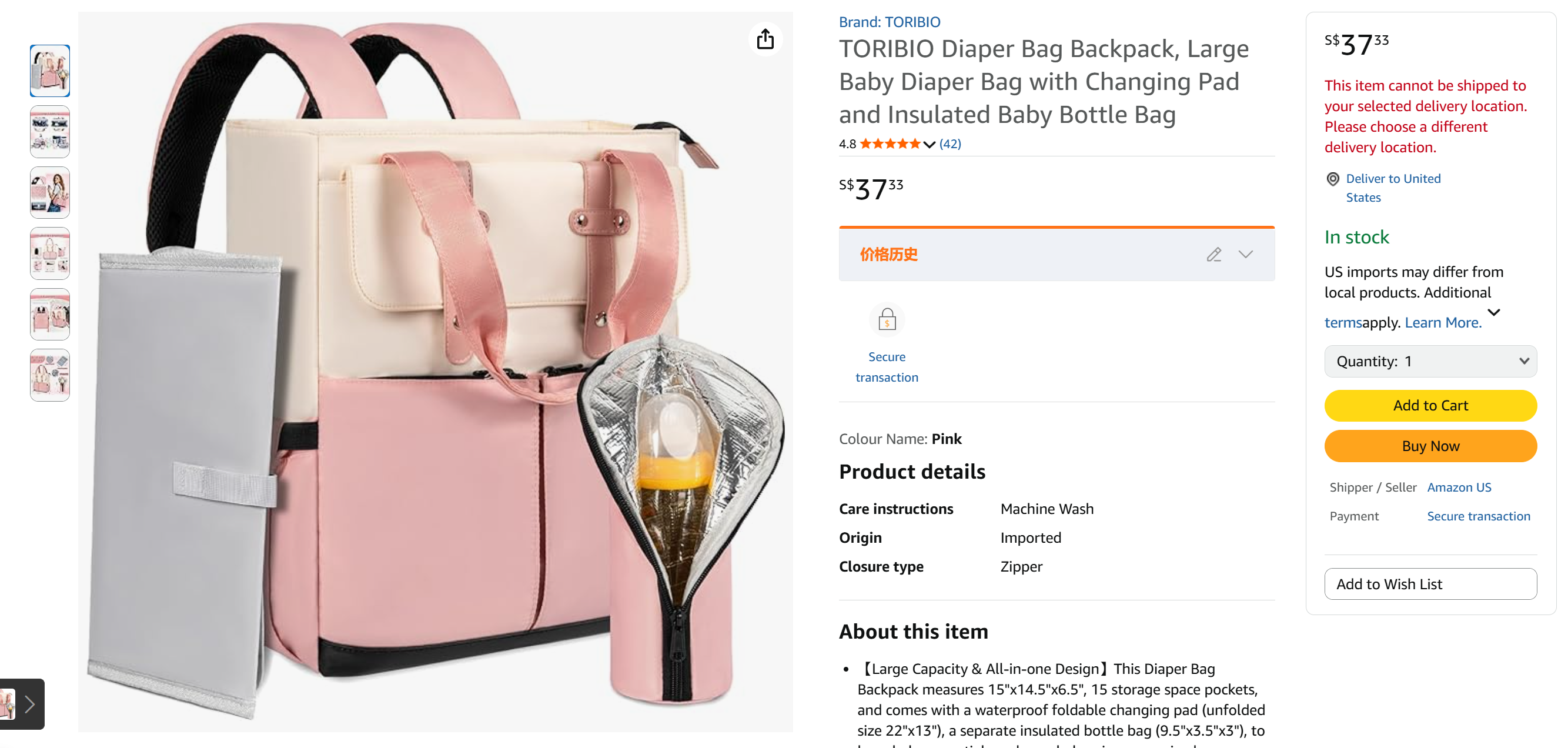 美国 TORIBIO 大容量双肩背包 多功能妈咪包 带换尿垫和保温奶瓶袋