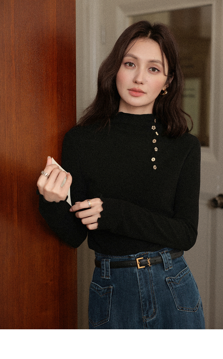 鹿向南「黑松绵绵」法式黑色T恤女2025早秋新款显瘦气质长袖上衣