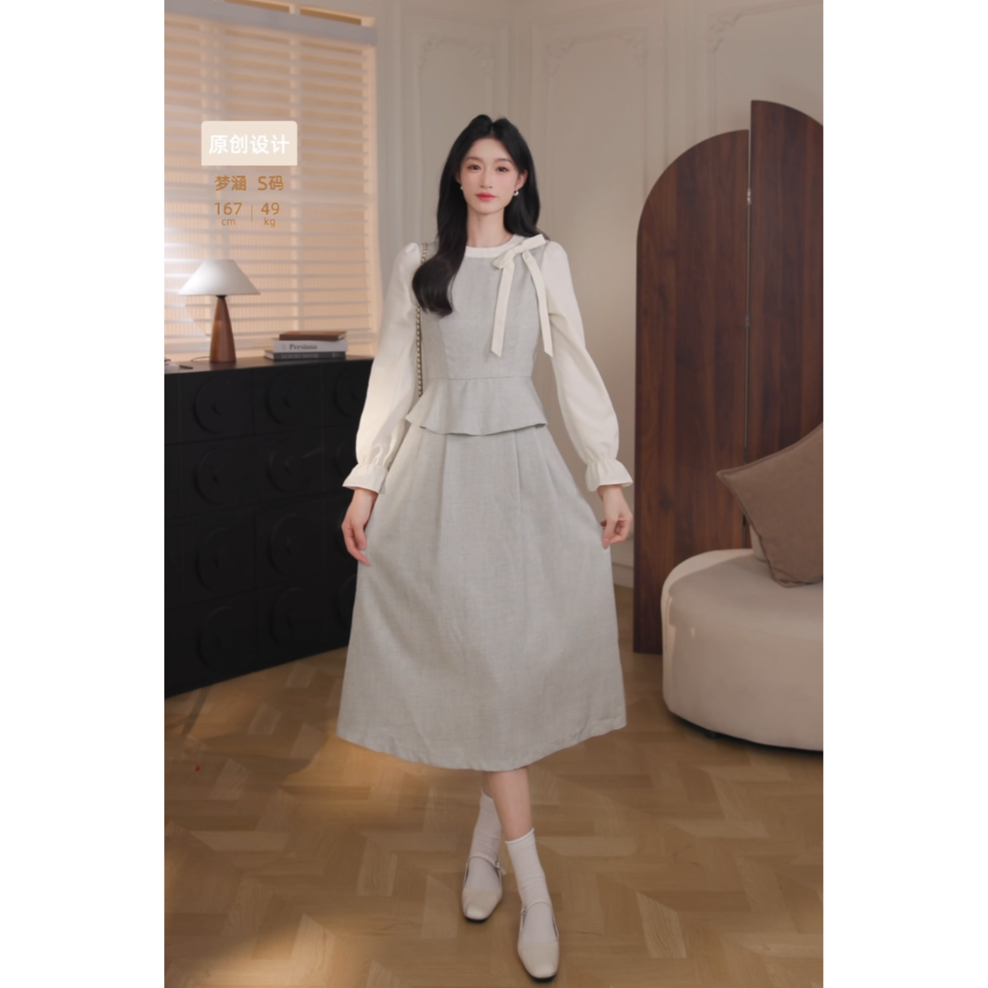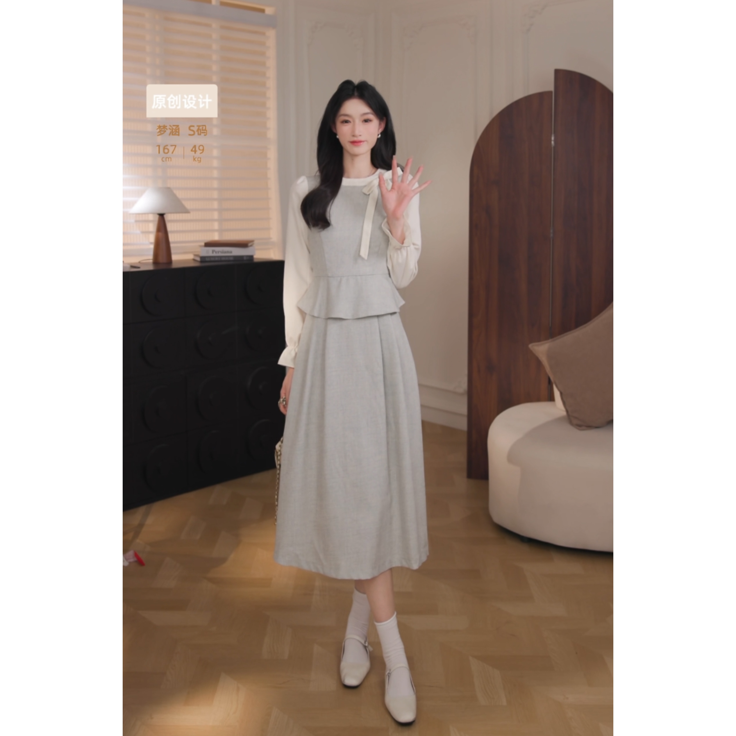 鹿向南【流光蓝屿】2025年秋新款假两件蓝色长袖连衣裙女显瘦长裙