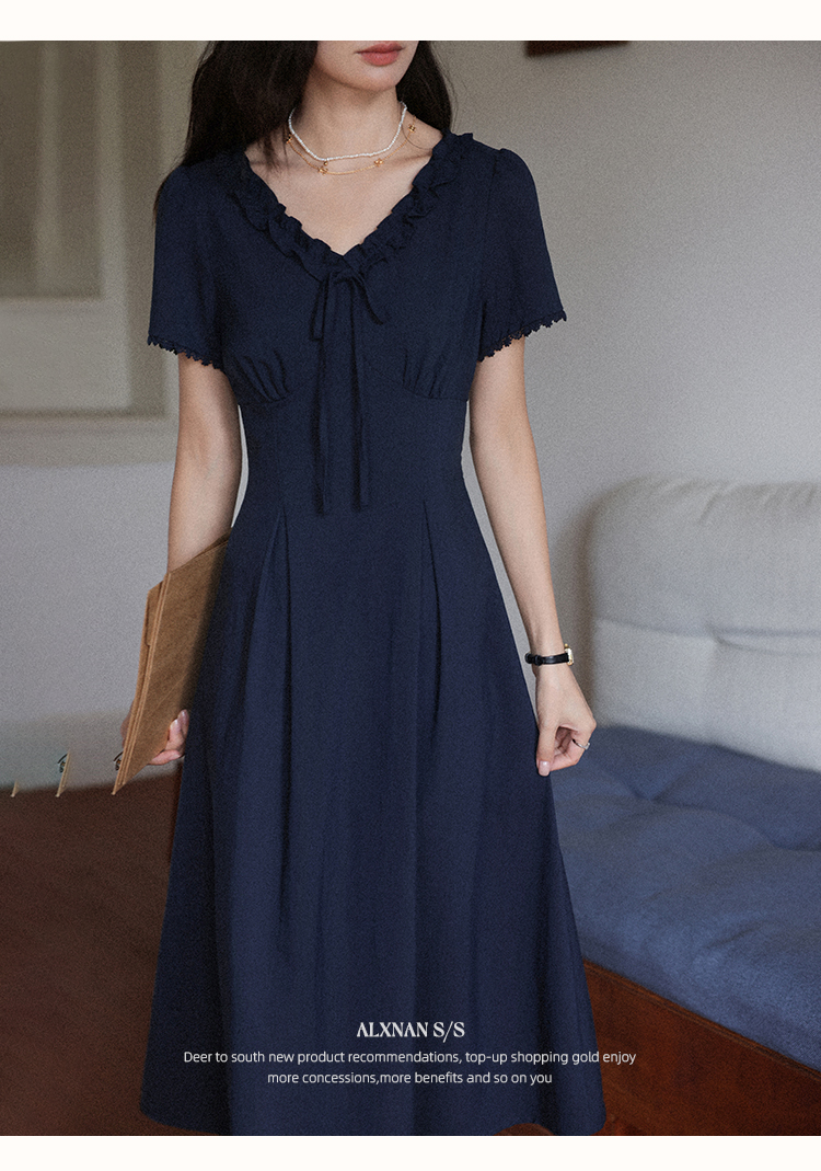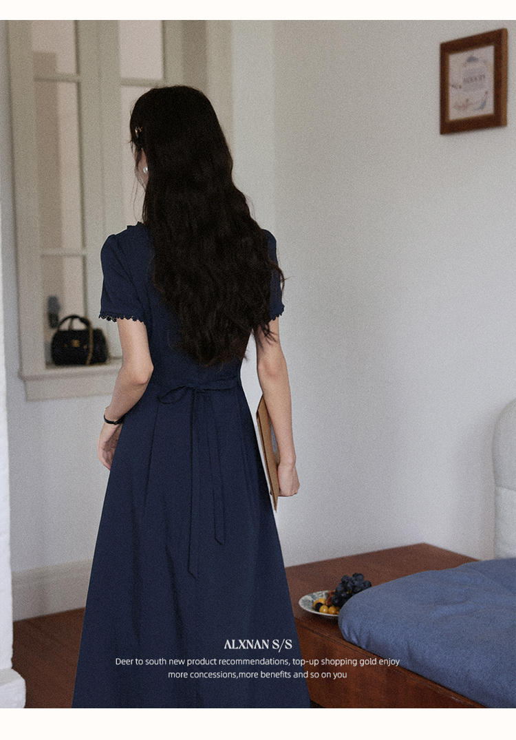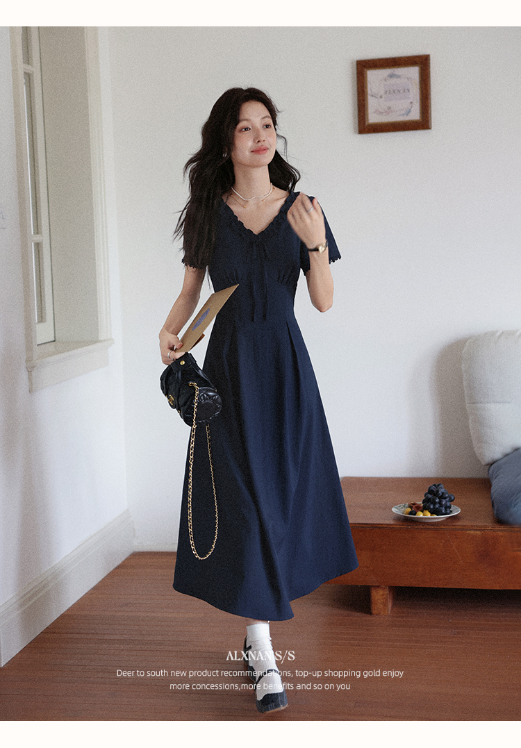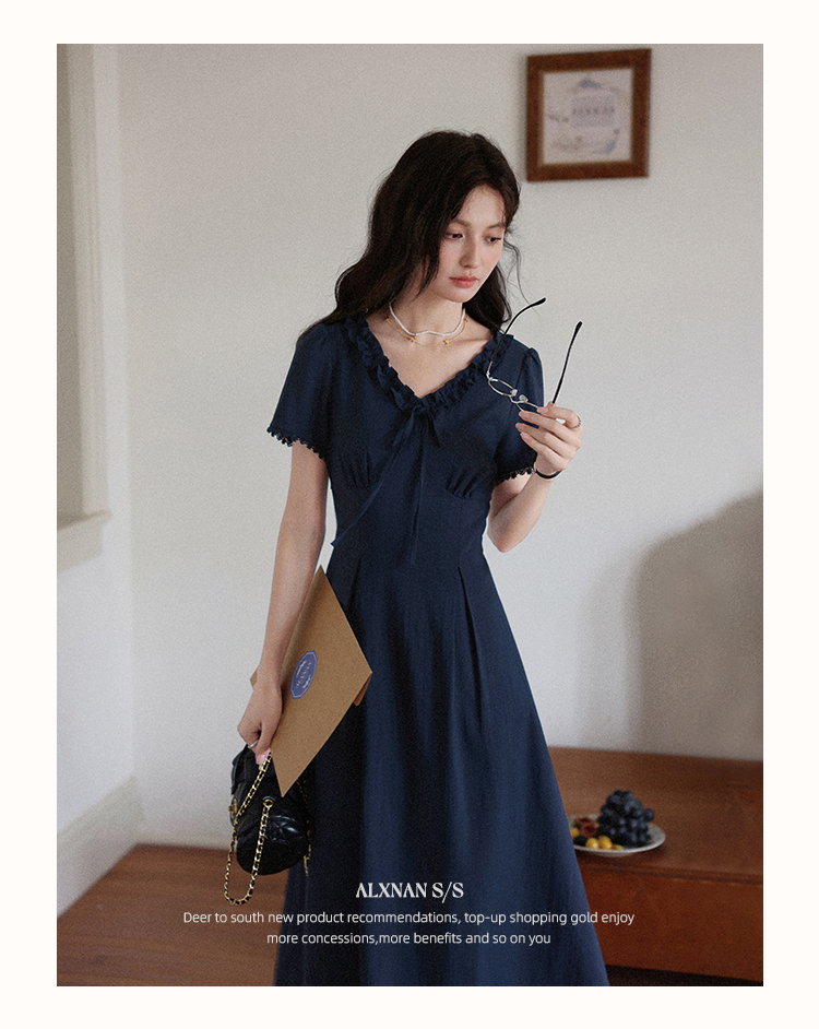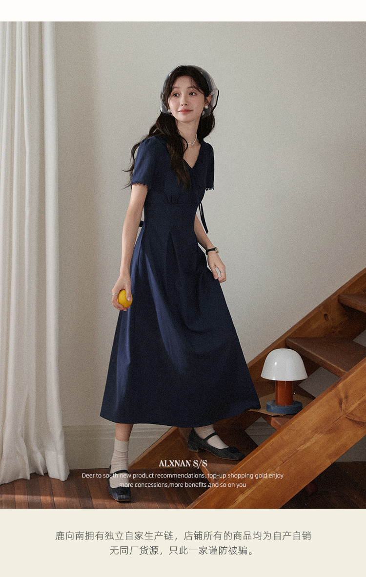 鹿向南「星蓝序曲」法式连衣裙女夏季小个子收腰藏蓝色短袖长裙