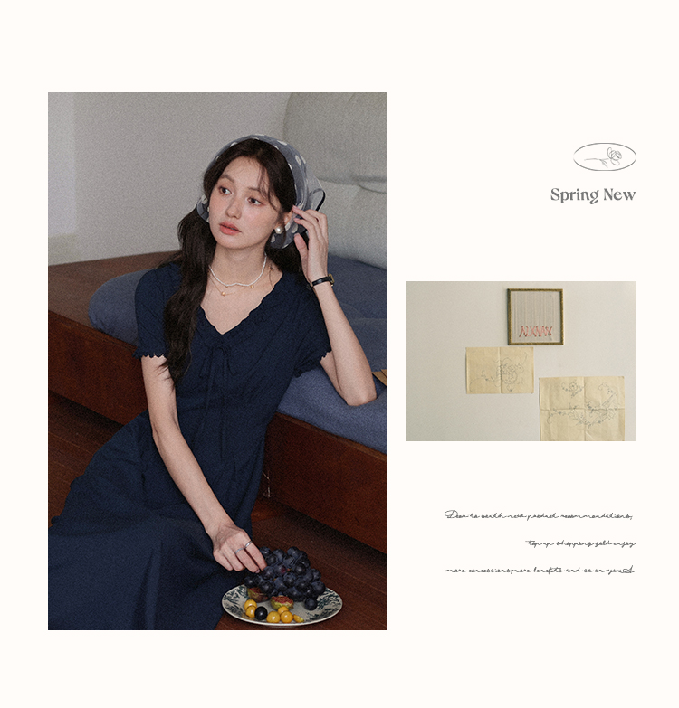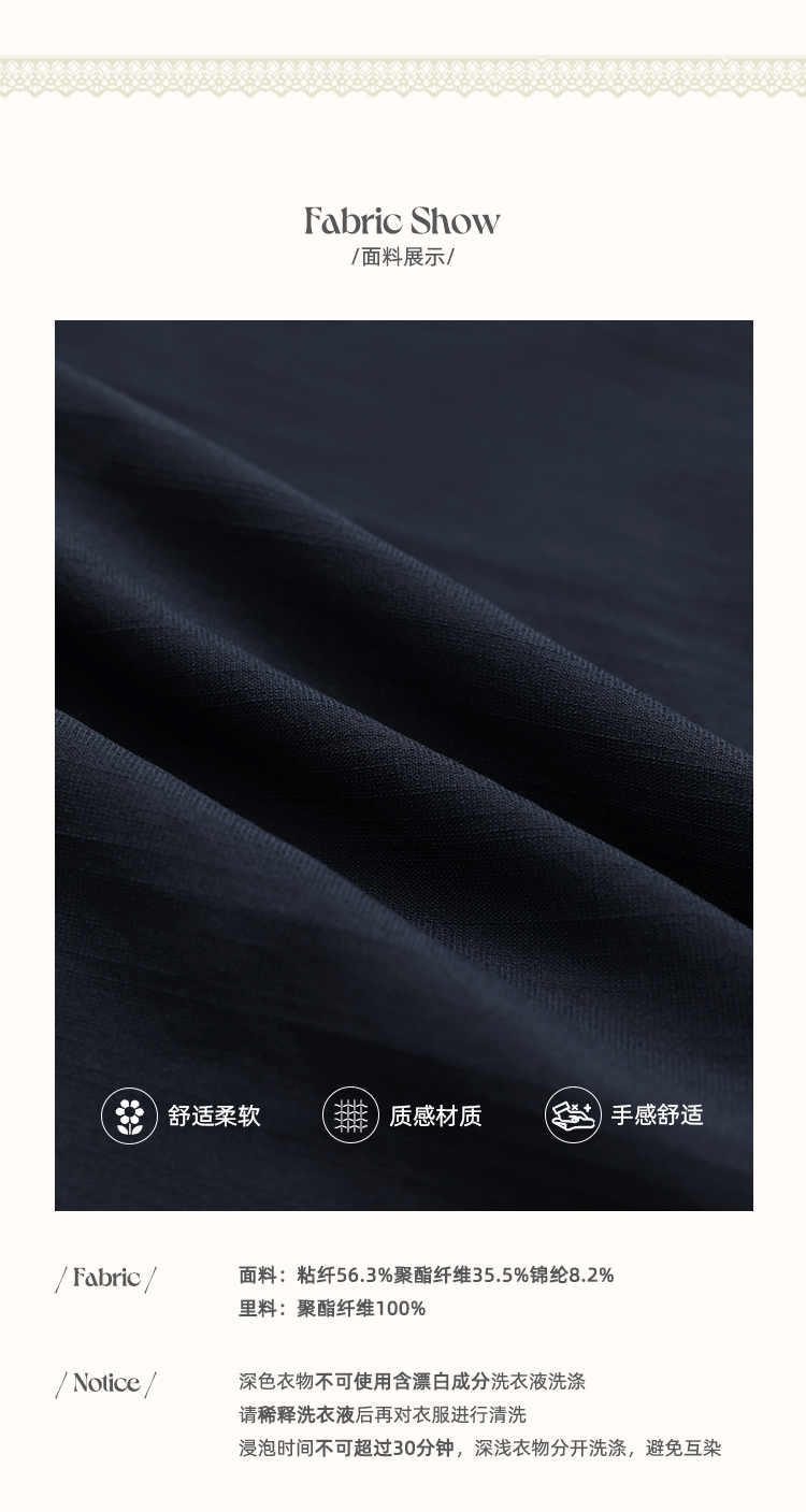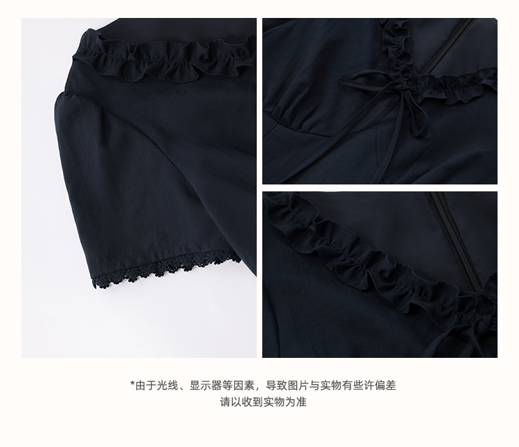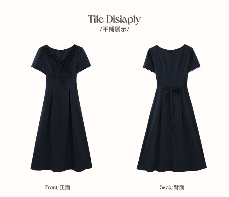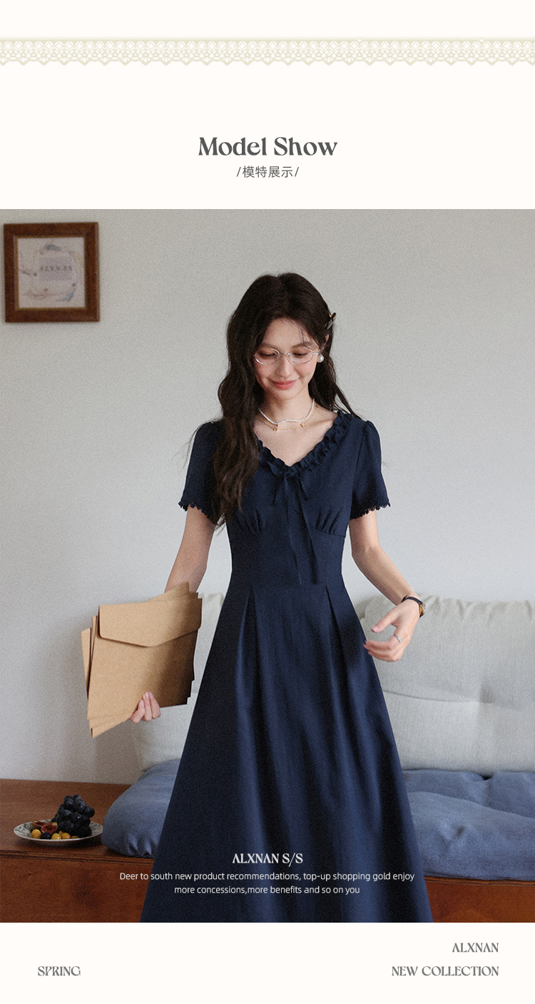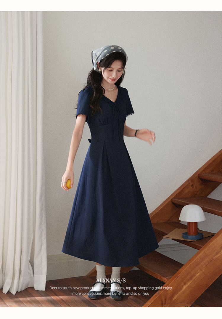 鹿向南「星蓝序曲」法式连衣裙女夏季小个子收腰藏蓝色短袖长裙