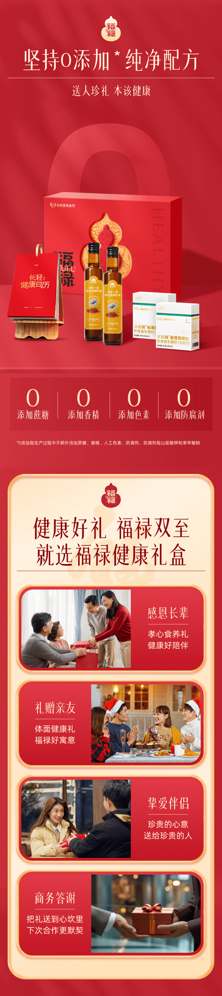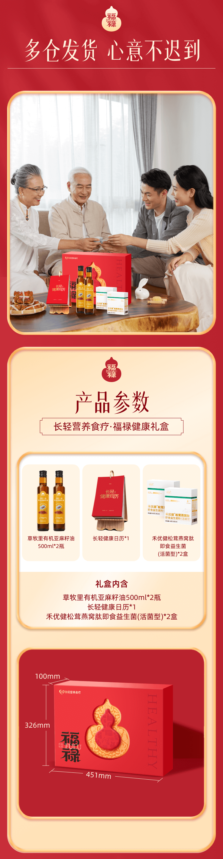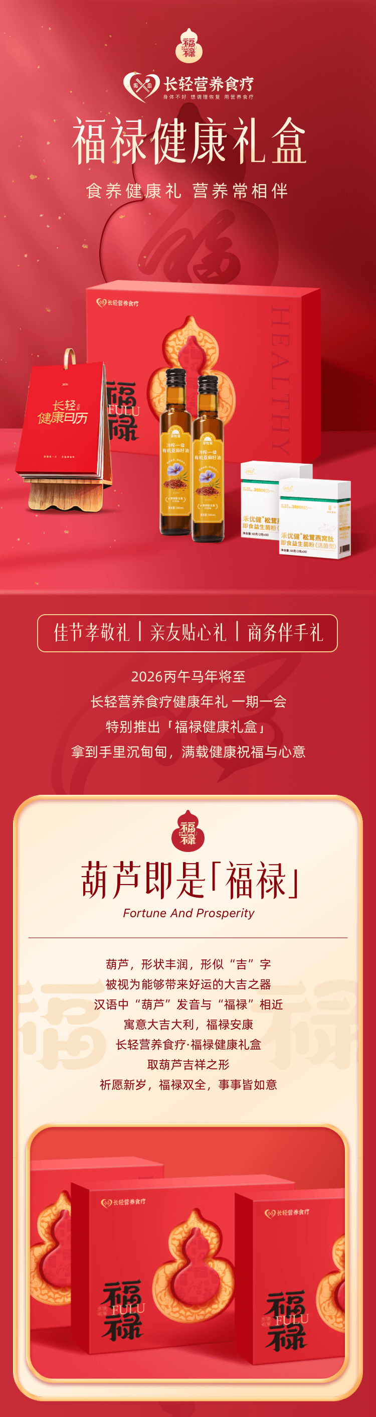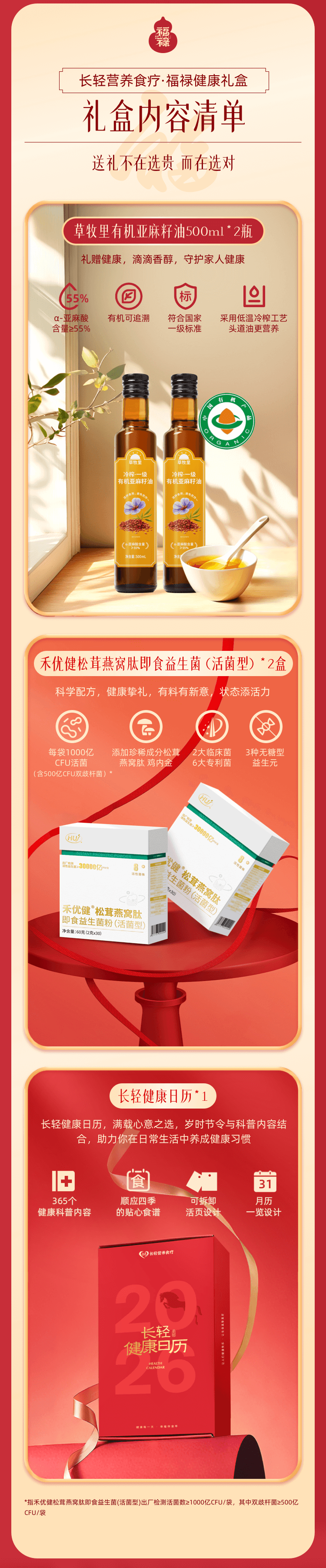 预售12月31日发货【2000积分+309】长轻 福禄新春健康礼盒( 2026日历*1+亚麻籽油500ml*2瓶+禾优健 松茸燕窝肽即食益生菌粉*2盒) 心意不迟到