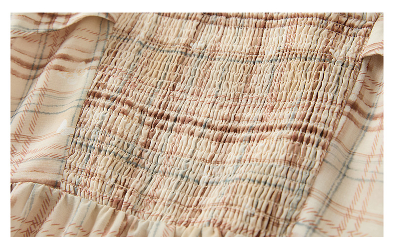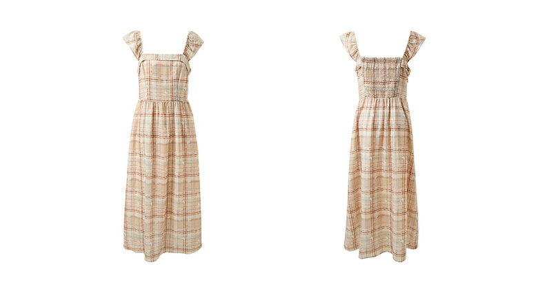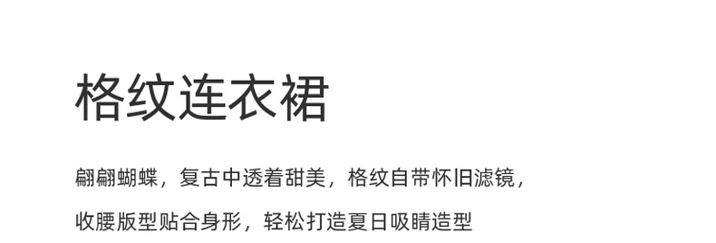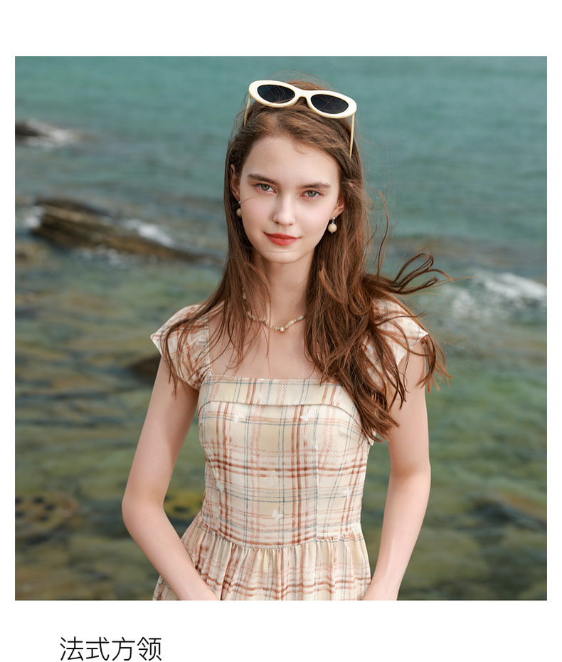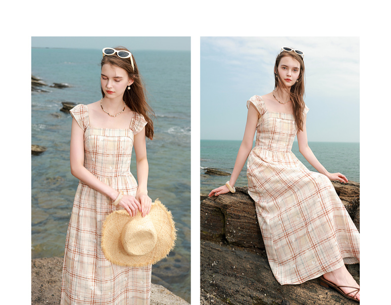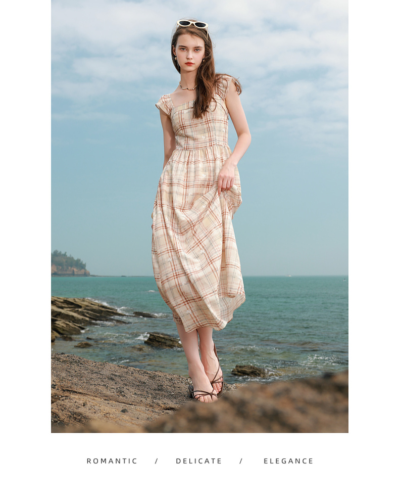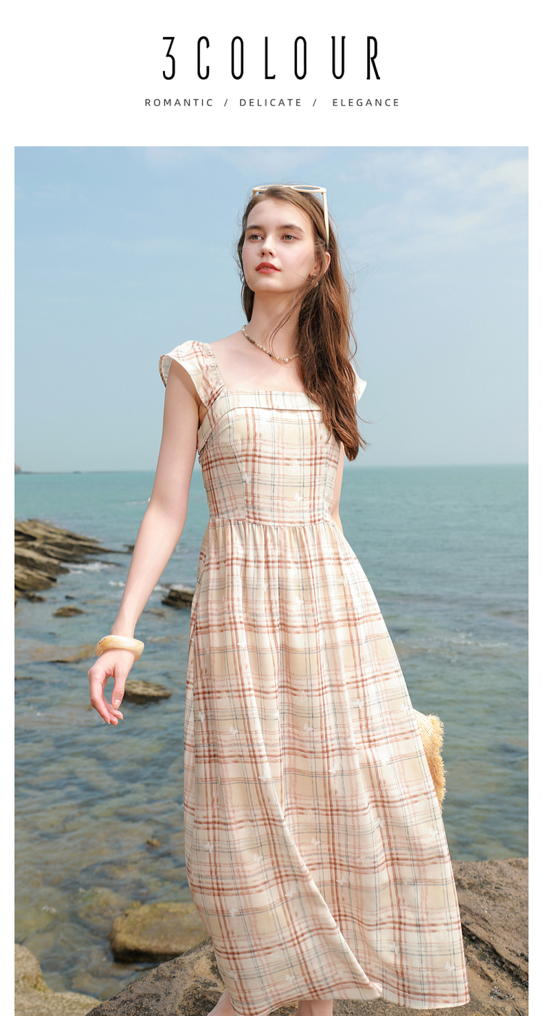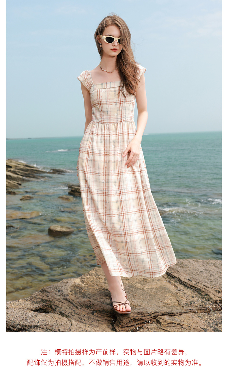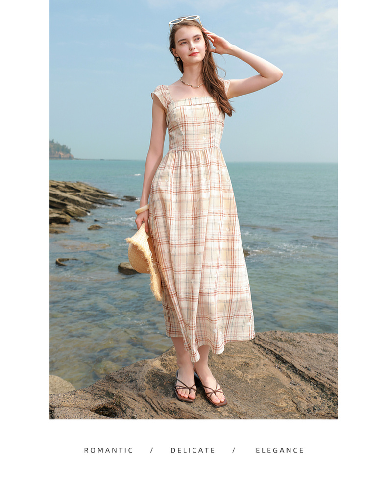 三彩独醒2025夏季新款法式方领格纹连衣裙简约气质收腰A字长裙F