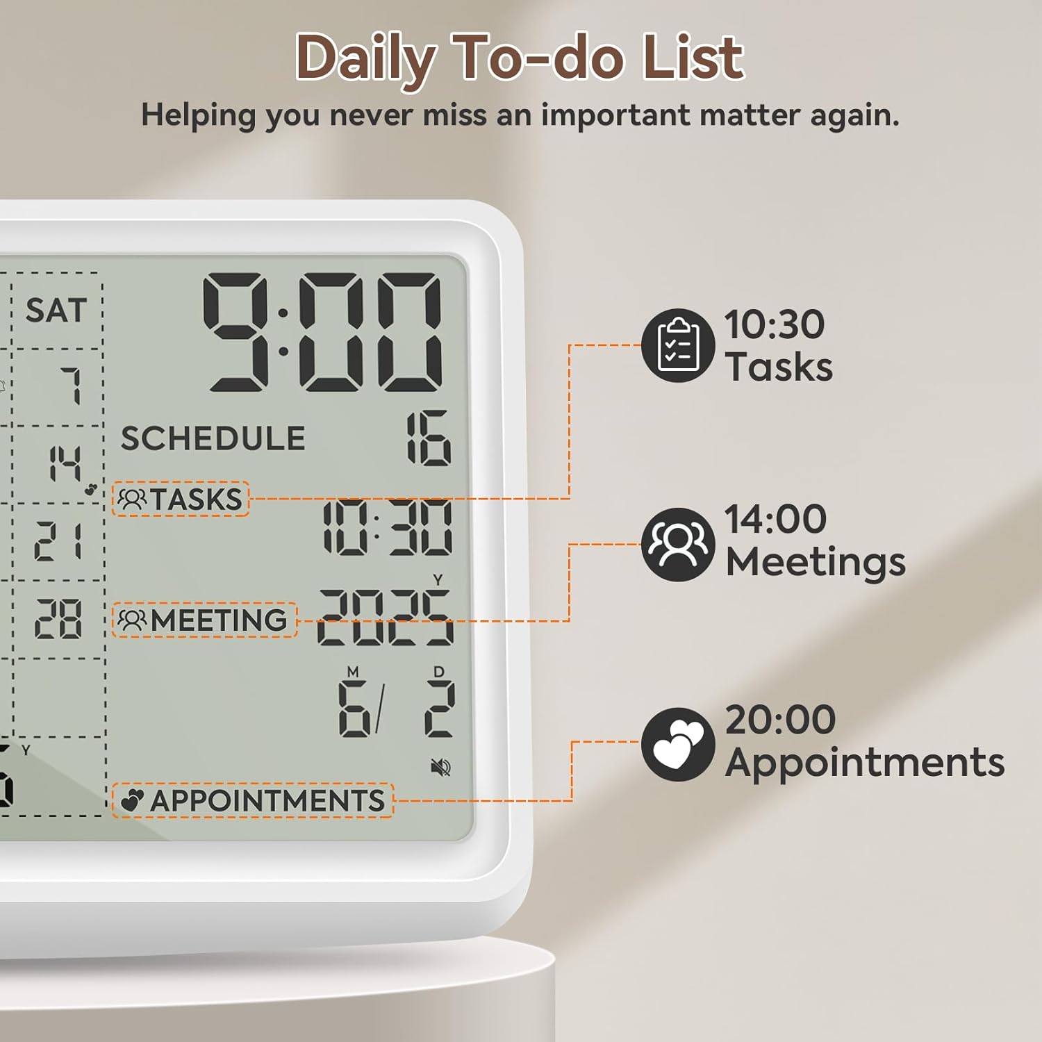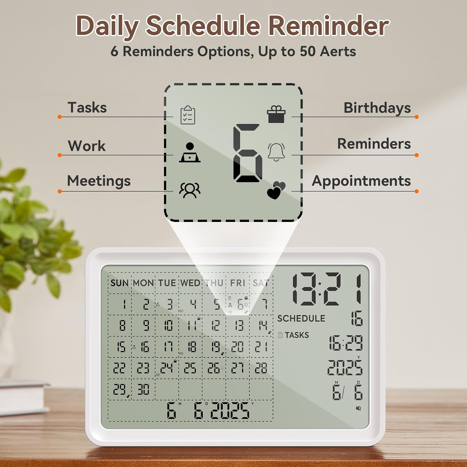 最多可设置 50 组事项,助您轻松掌控时间。这款桌面日历配备视觉和语音提醒功能,确保您不会错过任何截止日期、约会或日常任务。是轻松管理繁忙日程的理想之选