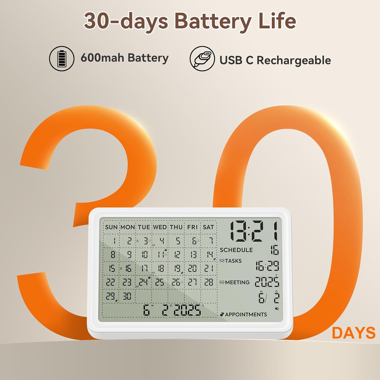 设计灵活,可将日历挂在墙上或放在桌面上。内置可充电电池提供长达90天的待机时间,使这款电子日历成为居家、办公或旅行的理想之选,无需频繁充电