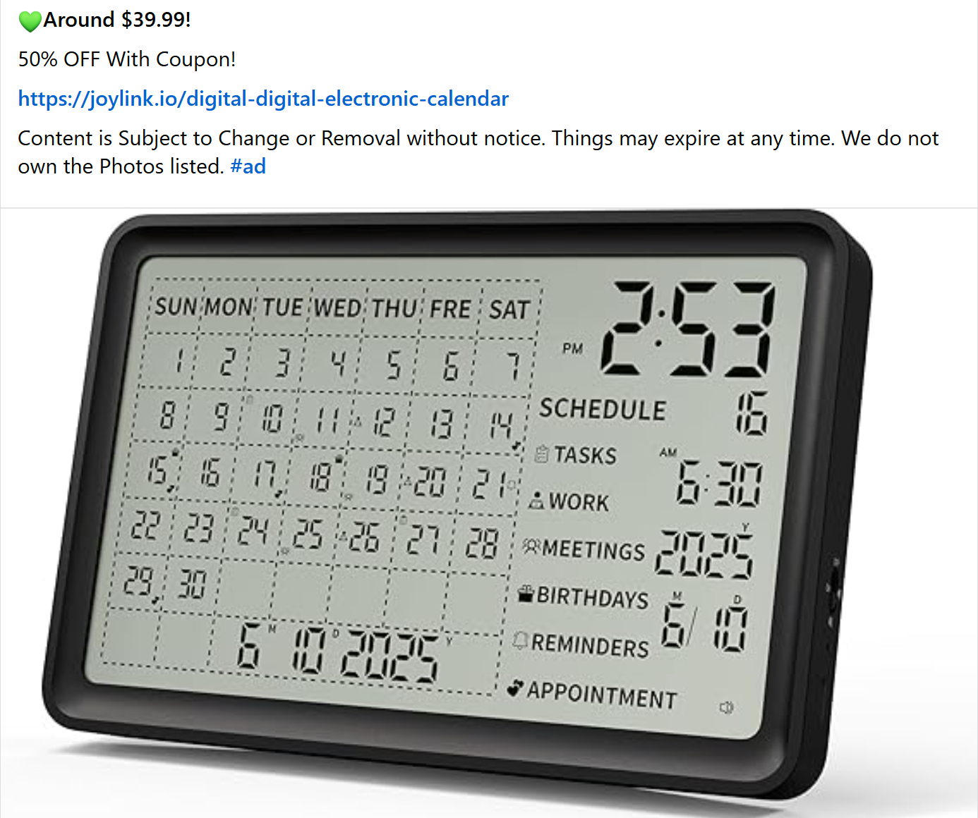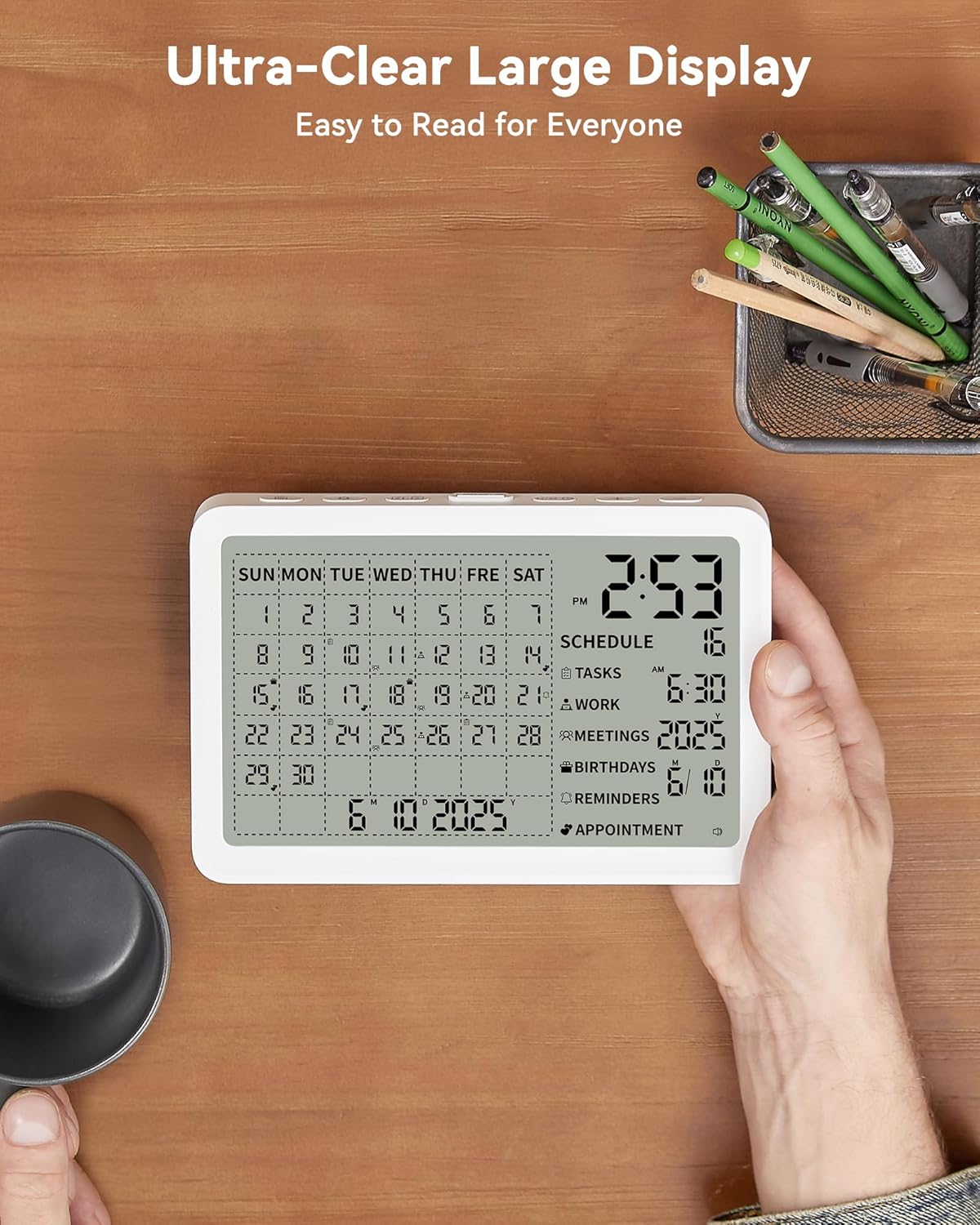 借助大尺寸、高对比度液晶显示屏,轻松浏览您的每日、每周或每月日程。查看完整的日历布局,包括上个月和下个月——非常适合管理长期项目、学校课程表或工作安排