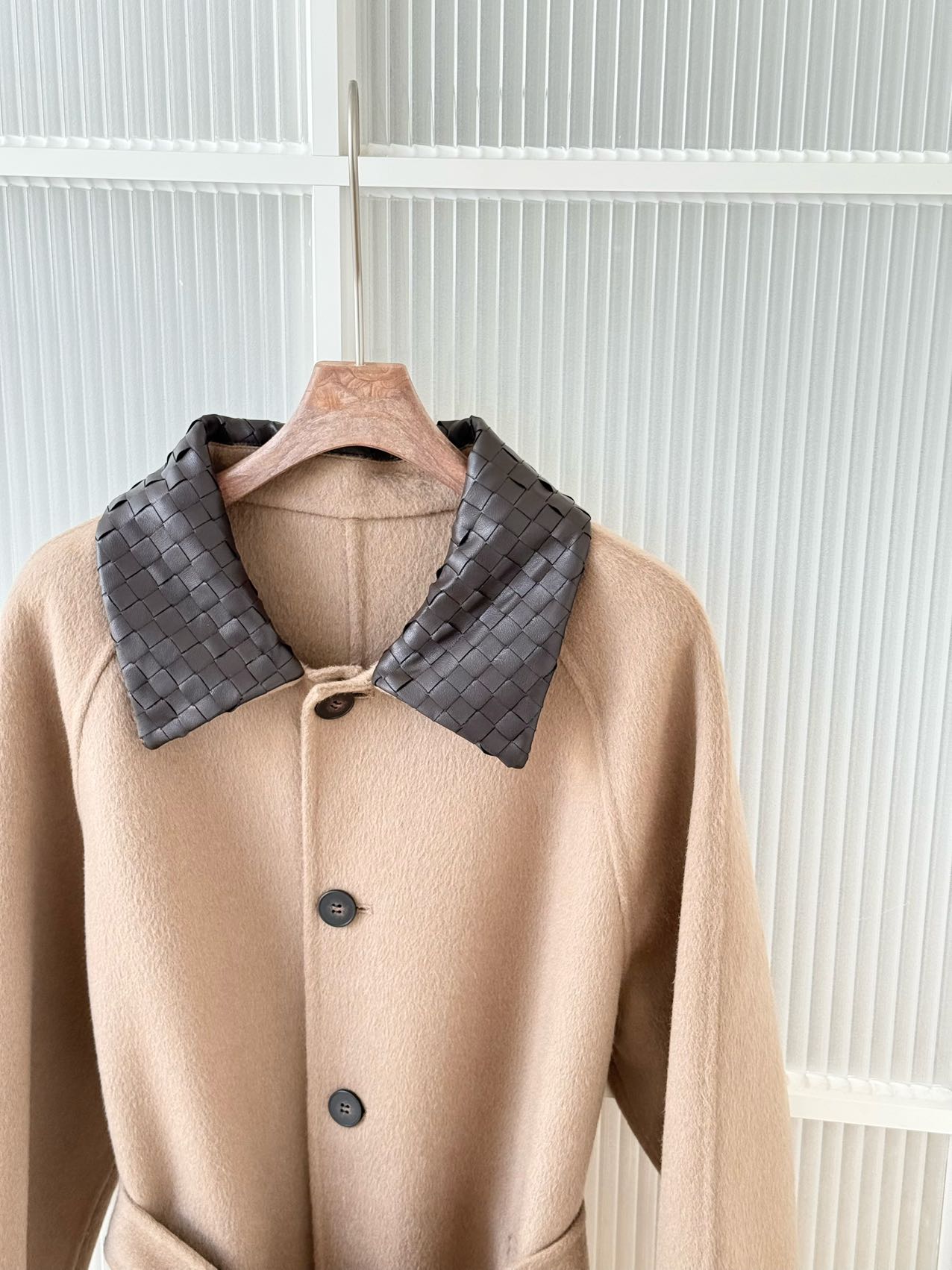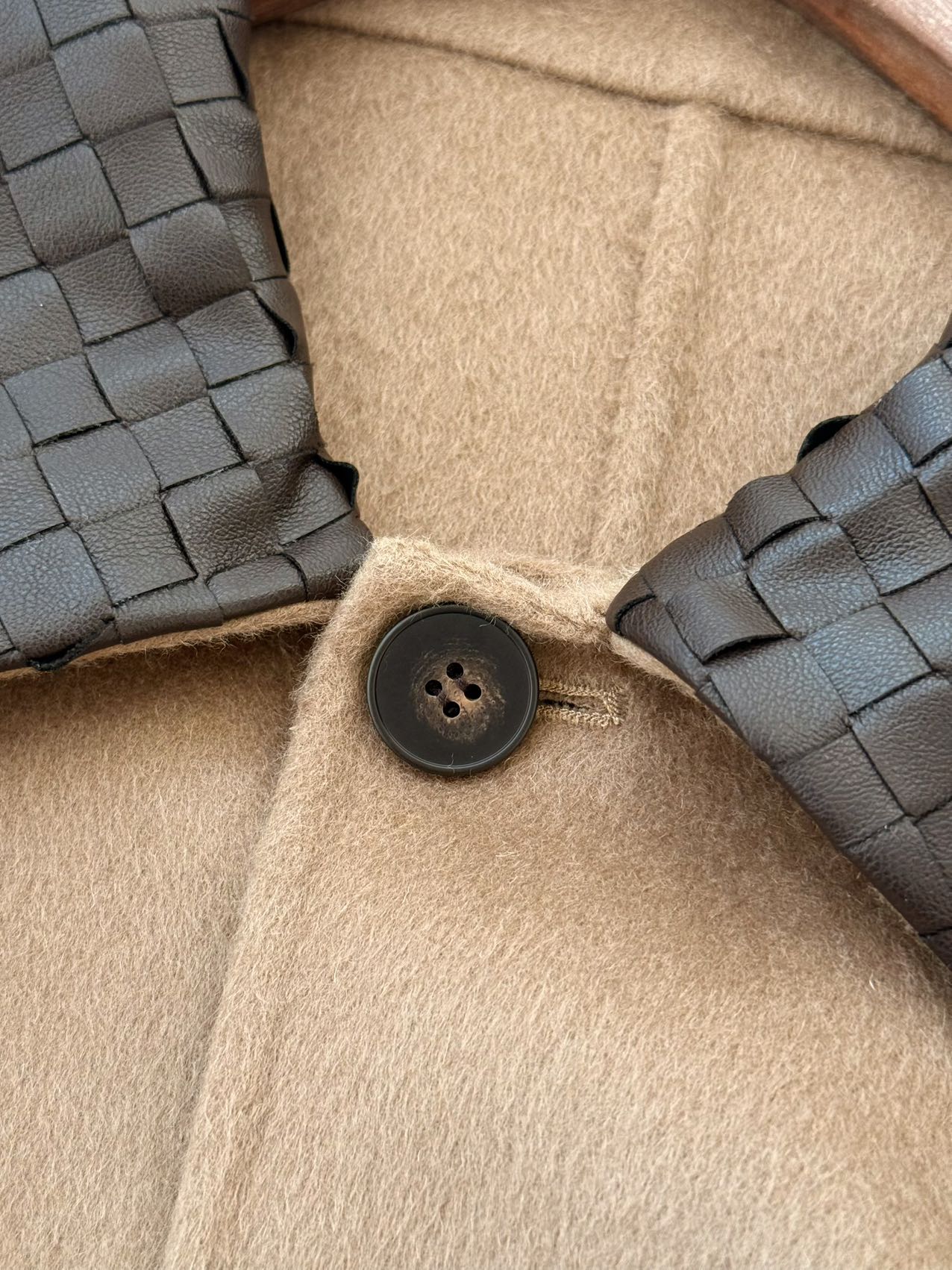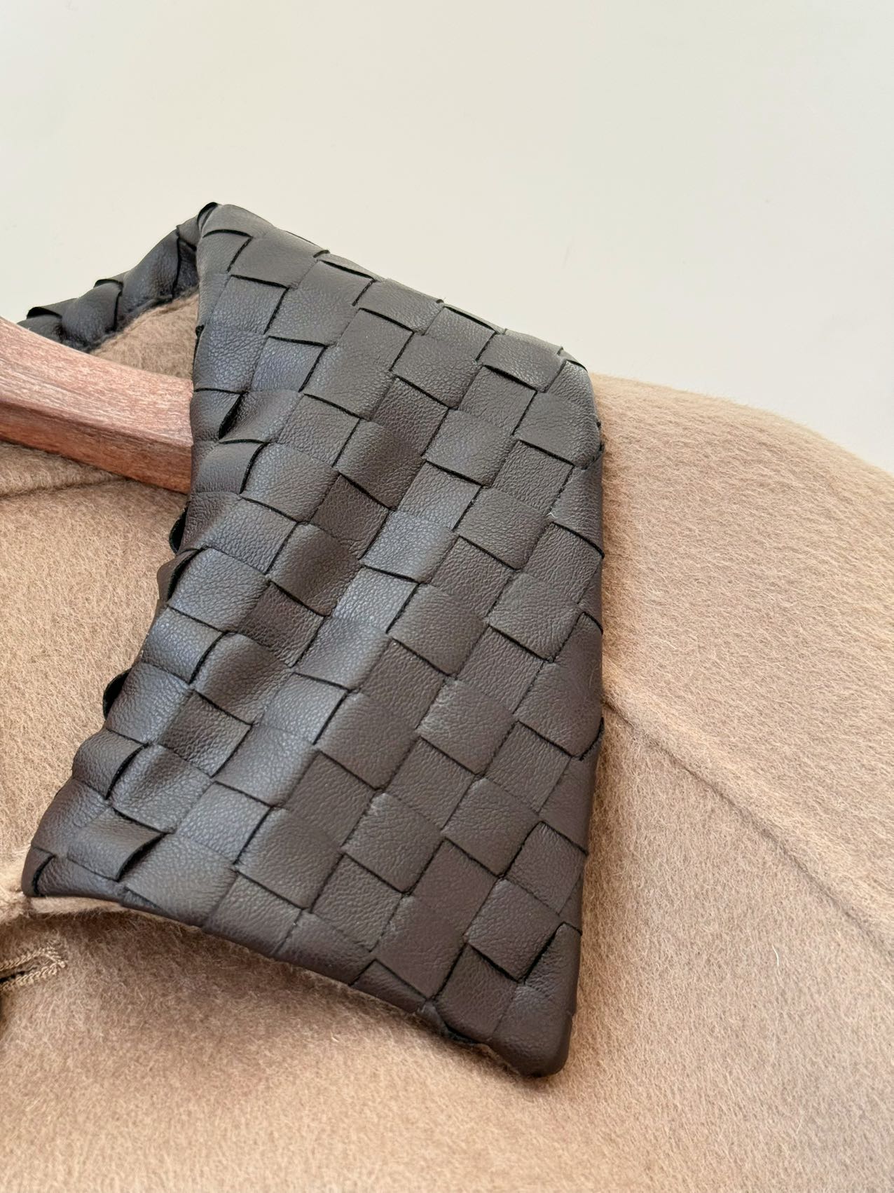 • 设计亮点:采用 BV 标志性的 Intrecciato 编织工艺打造咖色羊皮衣领,与浅驼色羊毛主体形成撞色效果。