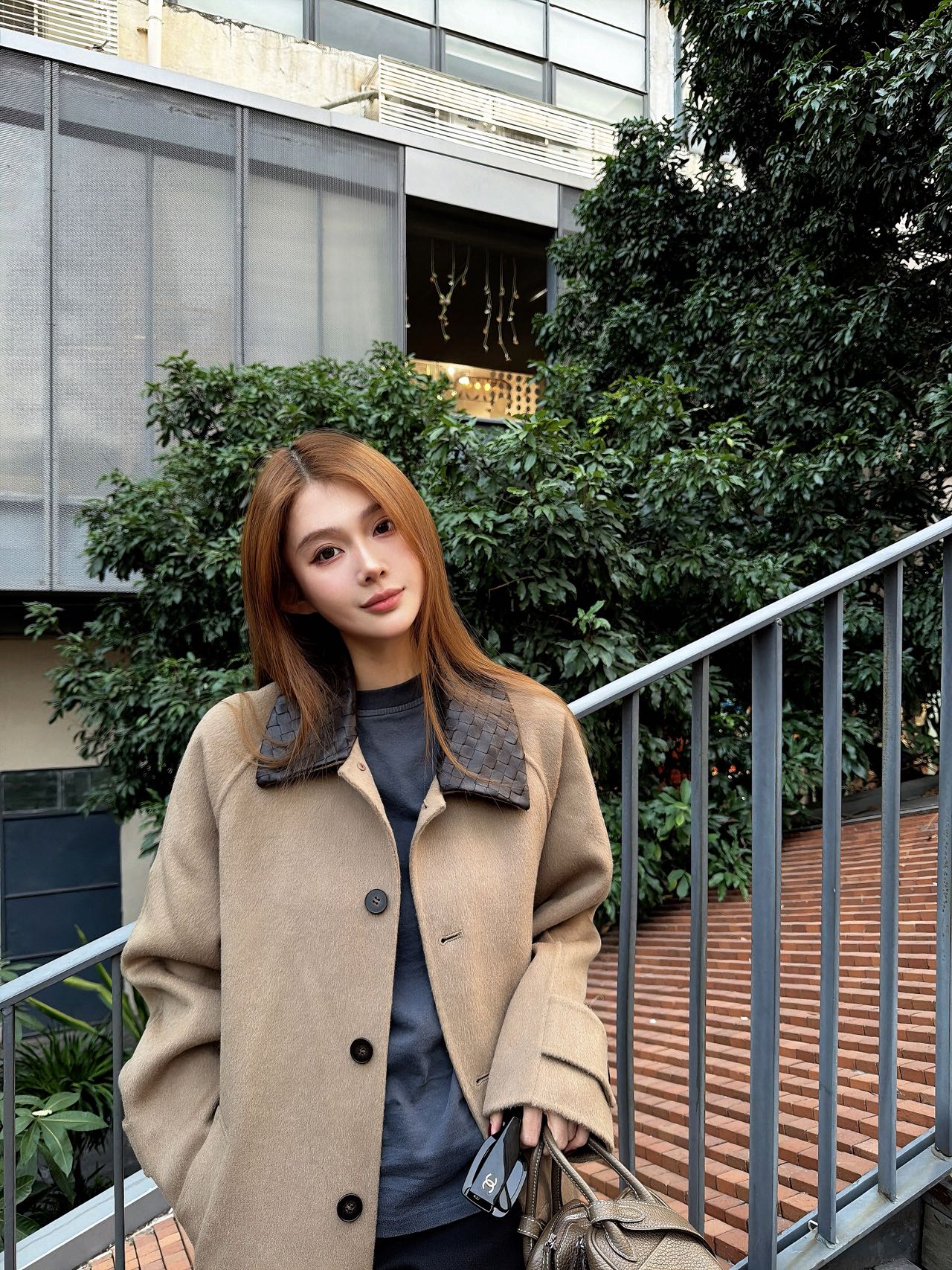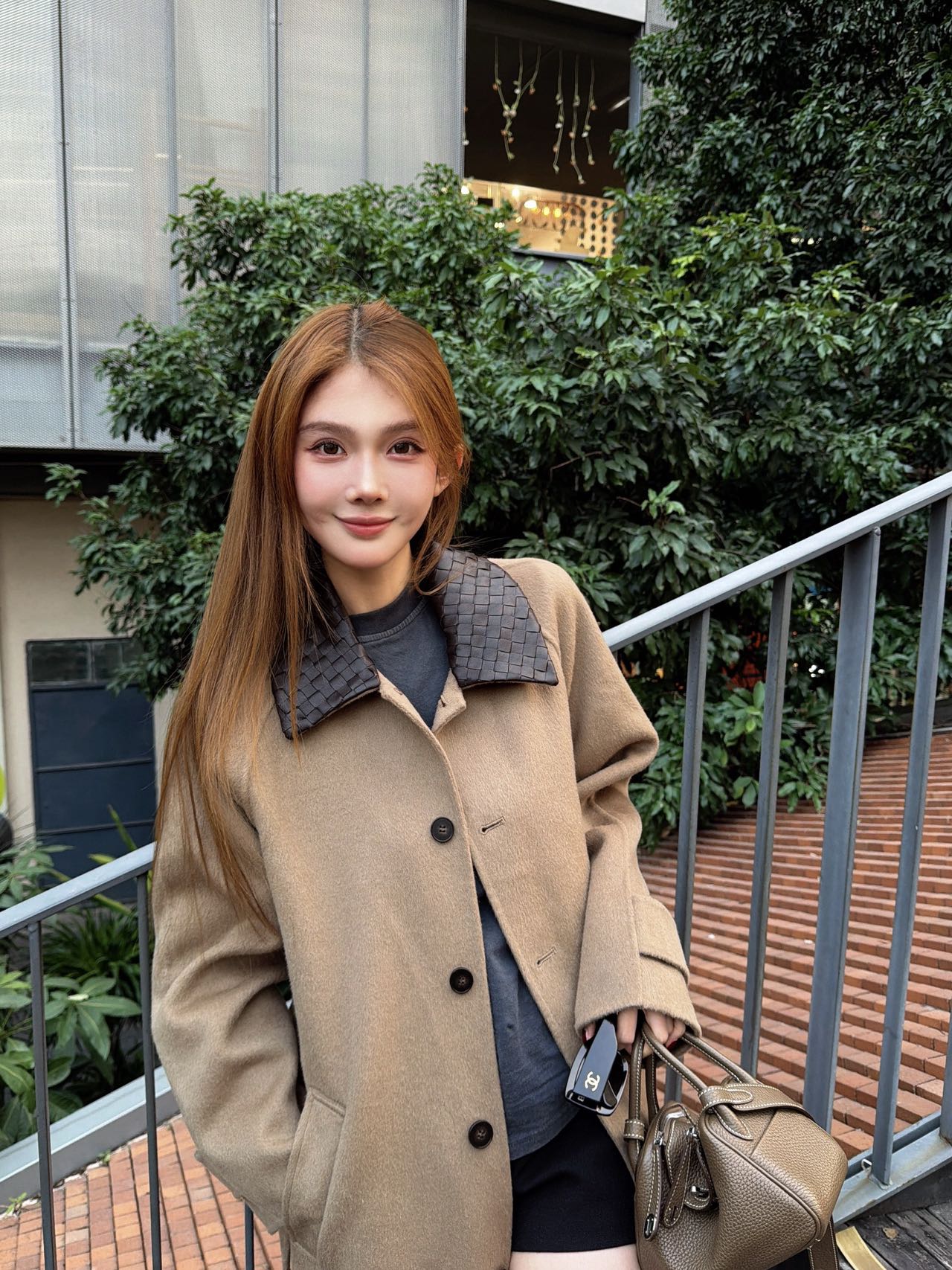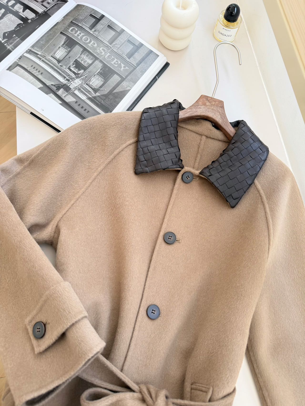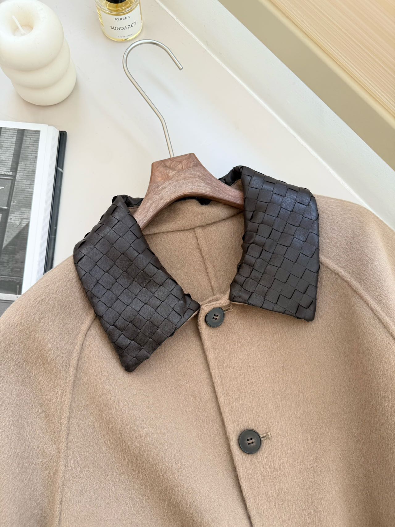 • 设计亮点:采用 BV 标志性的 Intrecciato 编织工艺打造咖色羊皮衣领,与浅驼色羊毛主体形成撞色效果。