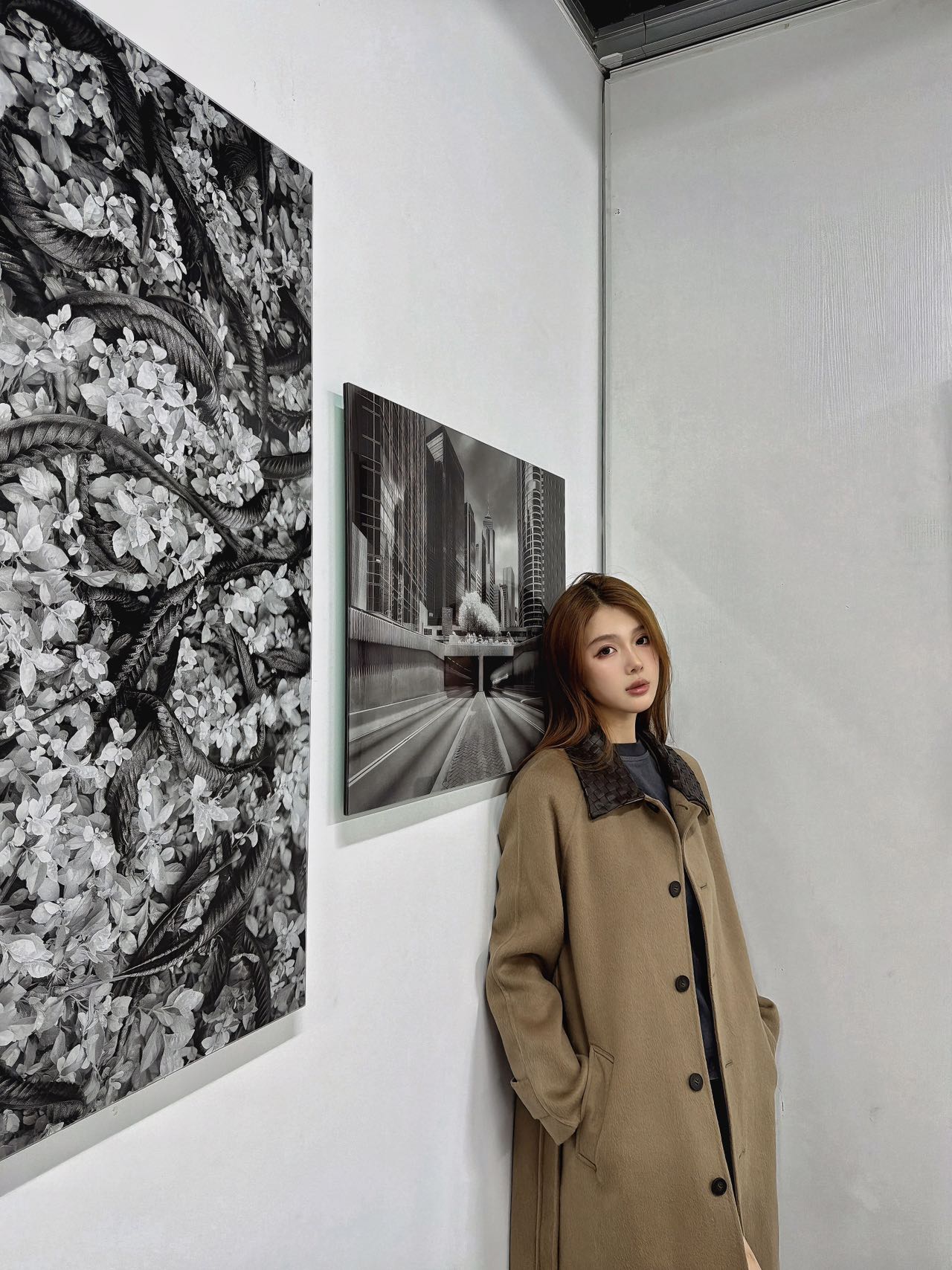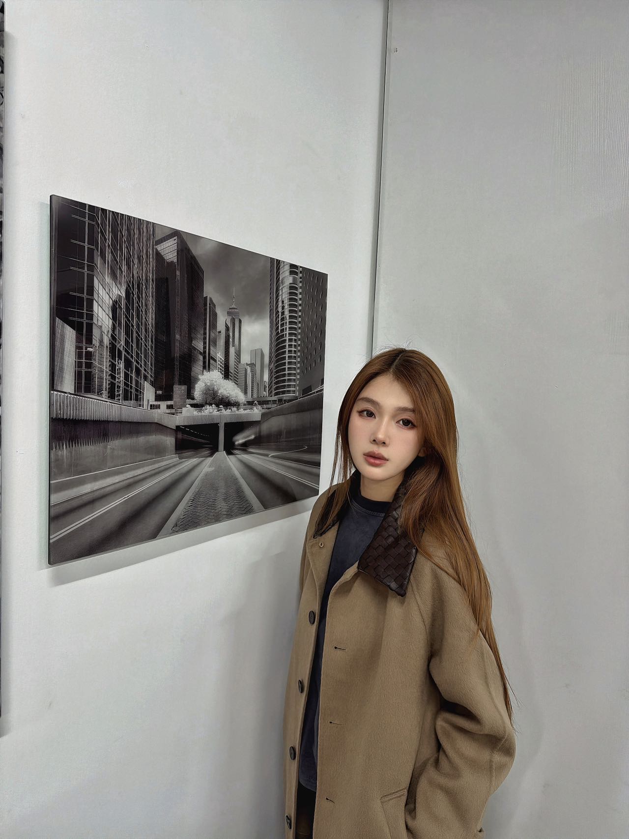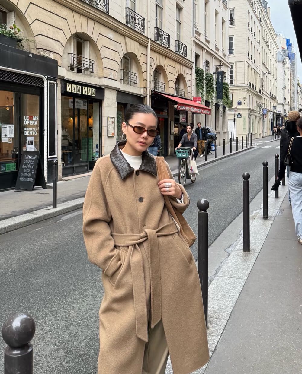 • 撞色皮领:编织纹理的黑色皮领提升整体精致感与复古气质,打破传统大衣的沉闷感