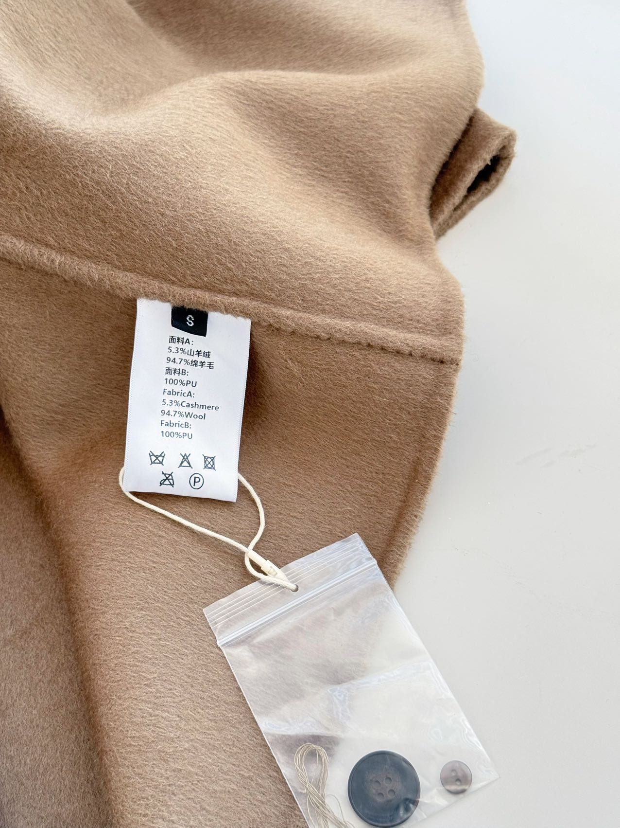• 主体面料:双面羊毛羊绒混纺(约85%澳洲进口羊毛+15%山羊绒),手感软糯细腻,保暖性强