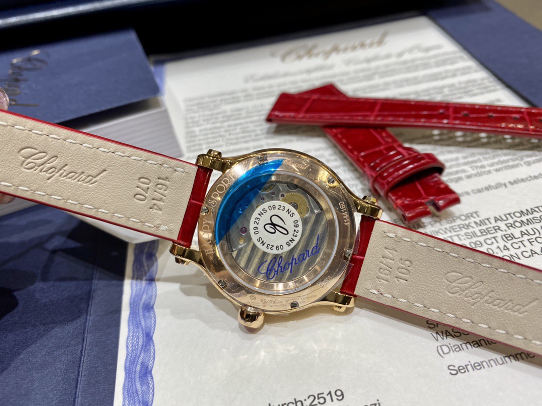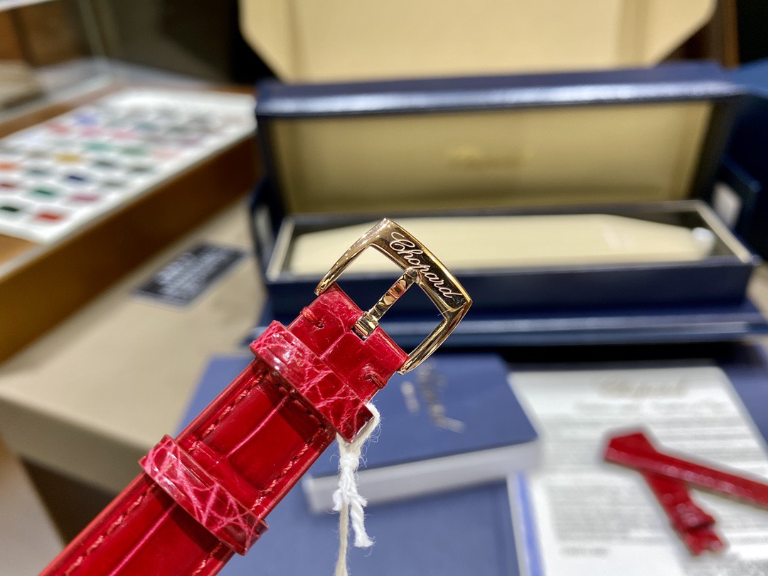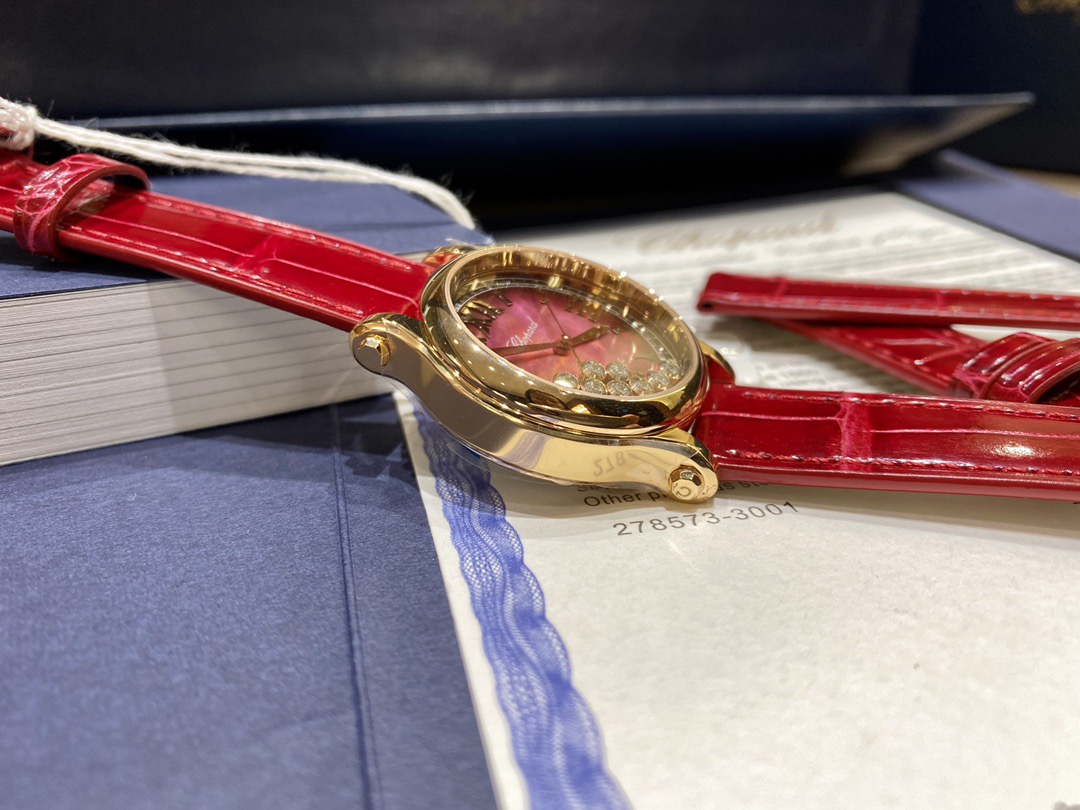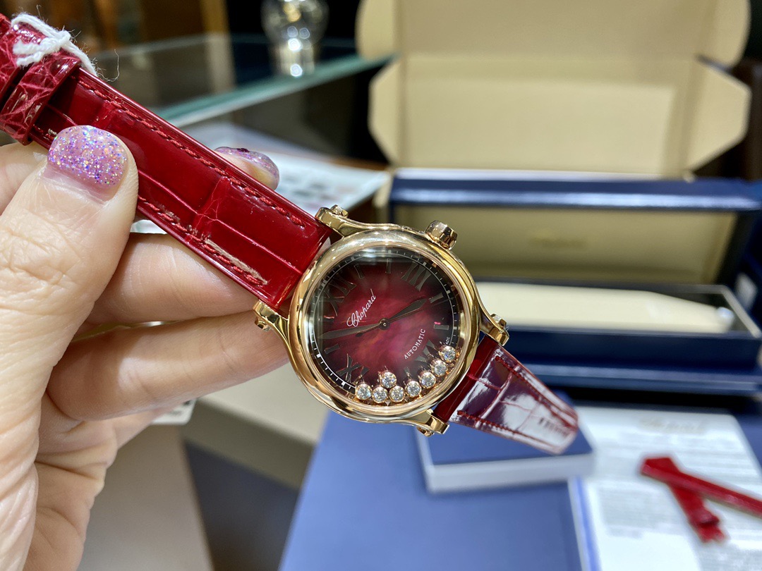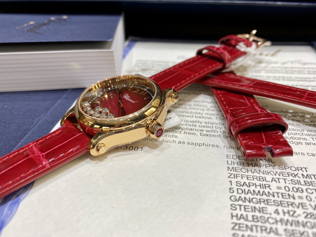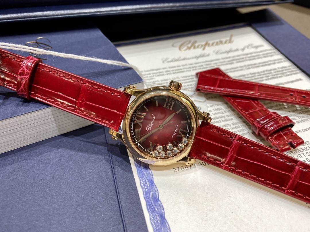 Chopard萧邦的经典杰作——HappySport时计换上充满喜庆的节日盛装,献上一场寓意吉祥的华美之舞。雍容大气的石榴红表盘,体现当下运动时尚的潮流趋势,与星点璀璨金光相得益彰,以黄金比例为灵感的33毫米直径表壳,采用符合伦理道德标准的18K玫瑰金打造,更有8颗灵动钻石在其间华丽飞舞,以幸运数字“8”强调其纳吉呈祥的美好寓意。此款HappySport腕表配备红色皮表带,搭载进口9039机芯,还原正品无日历一档设计!机芯稳定零返修!