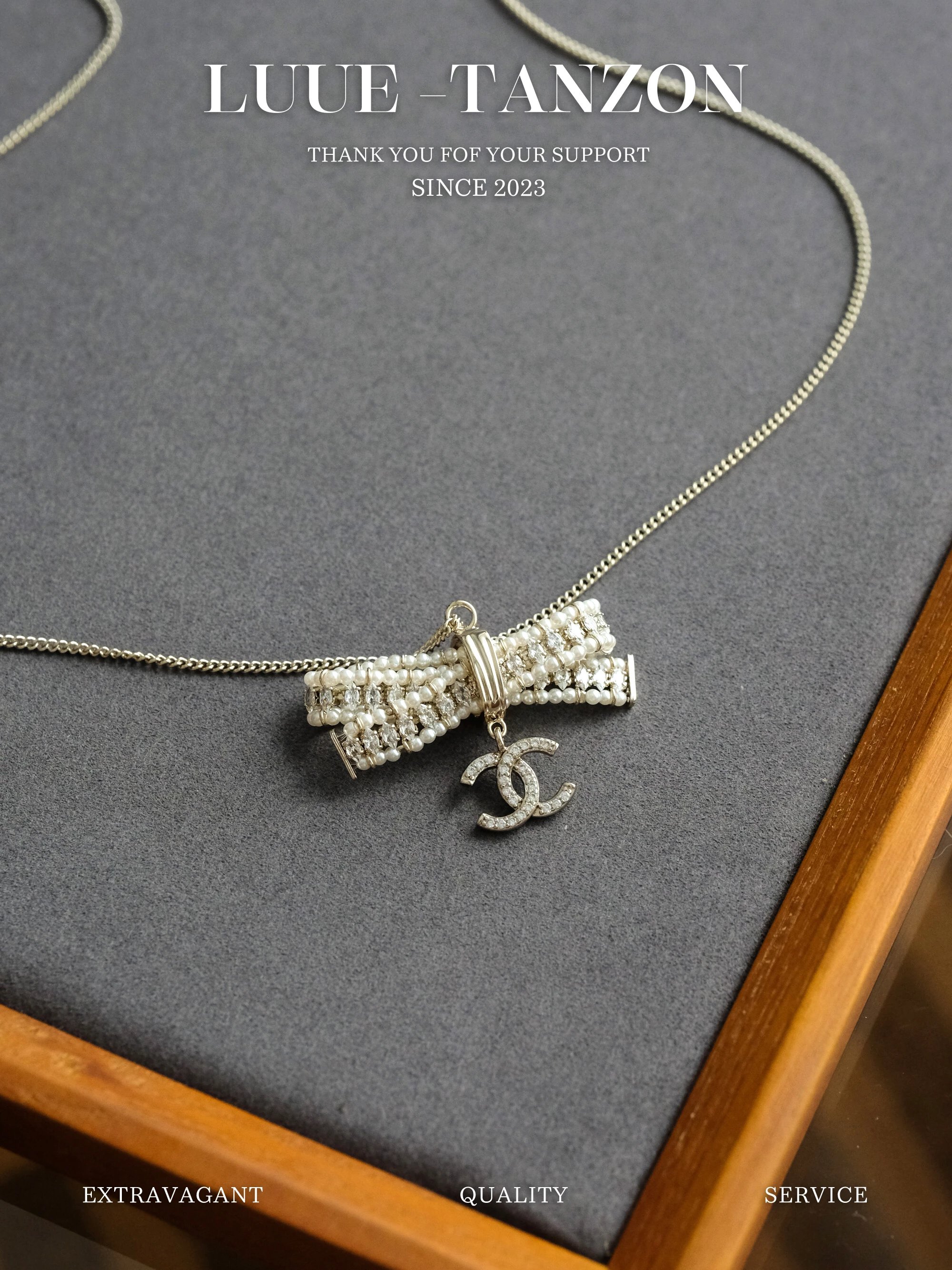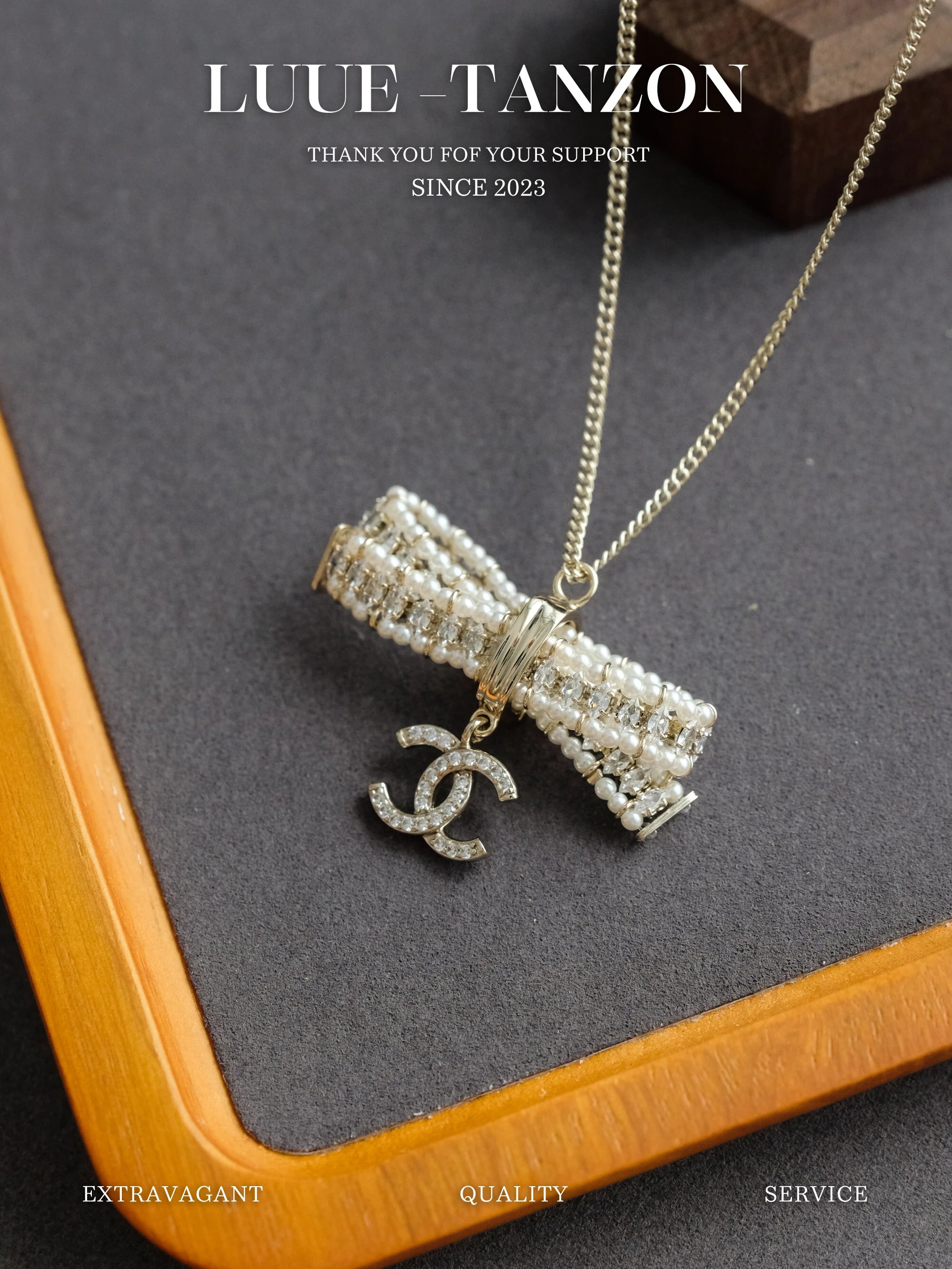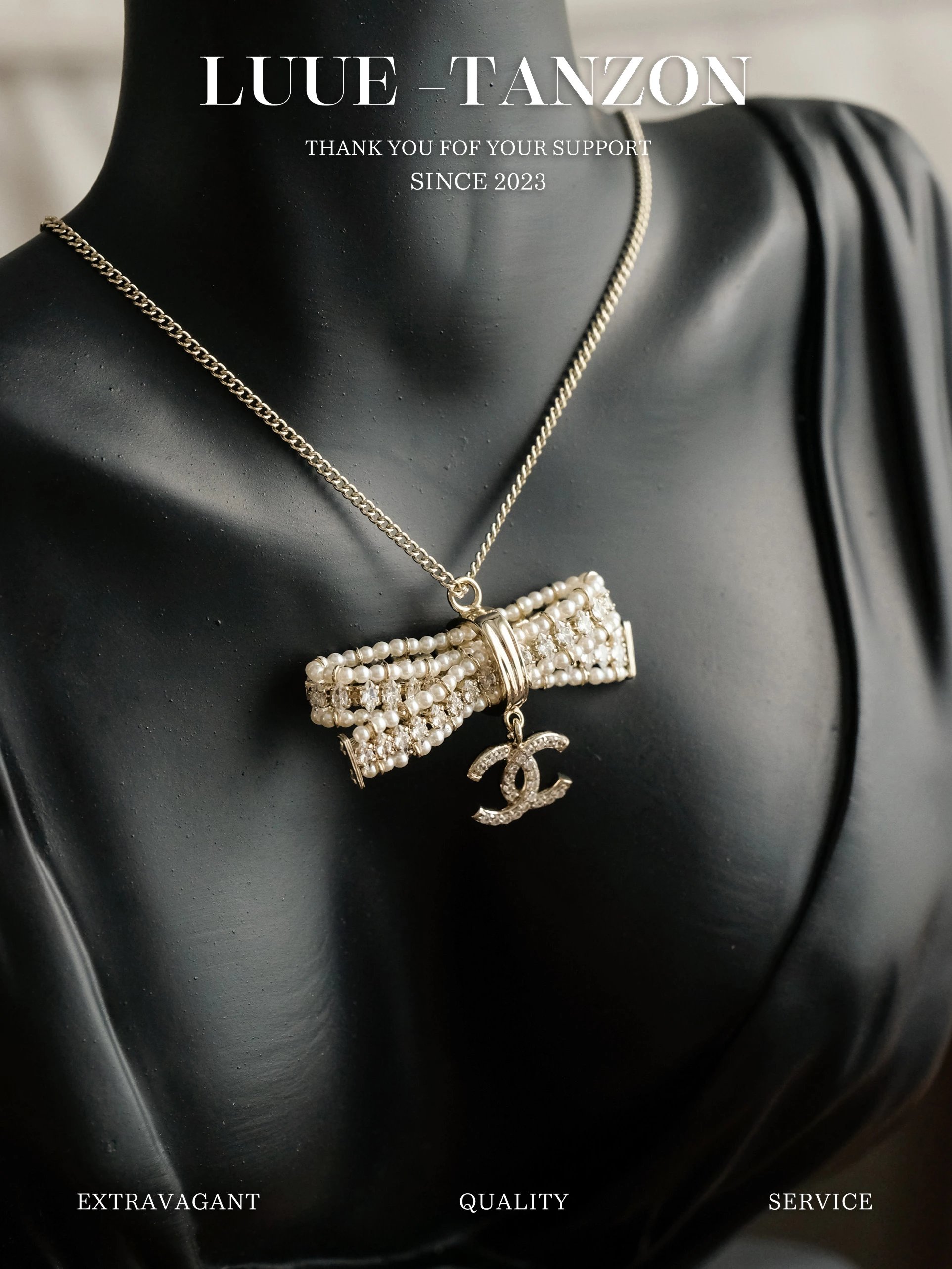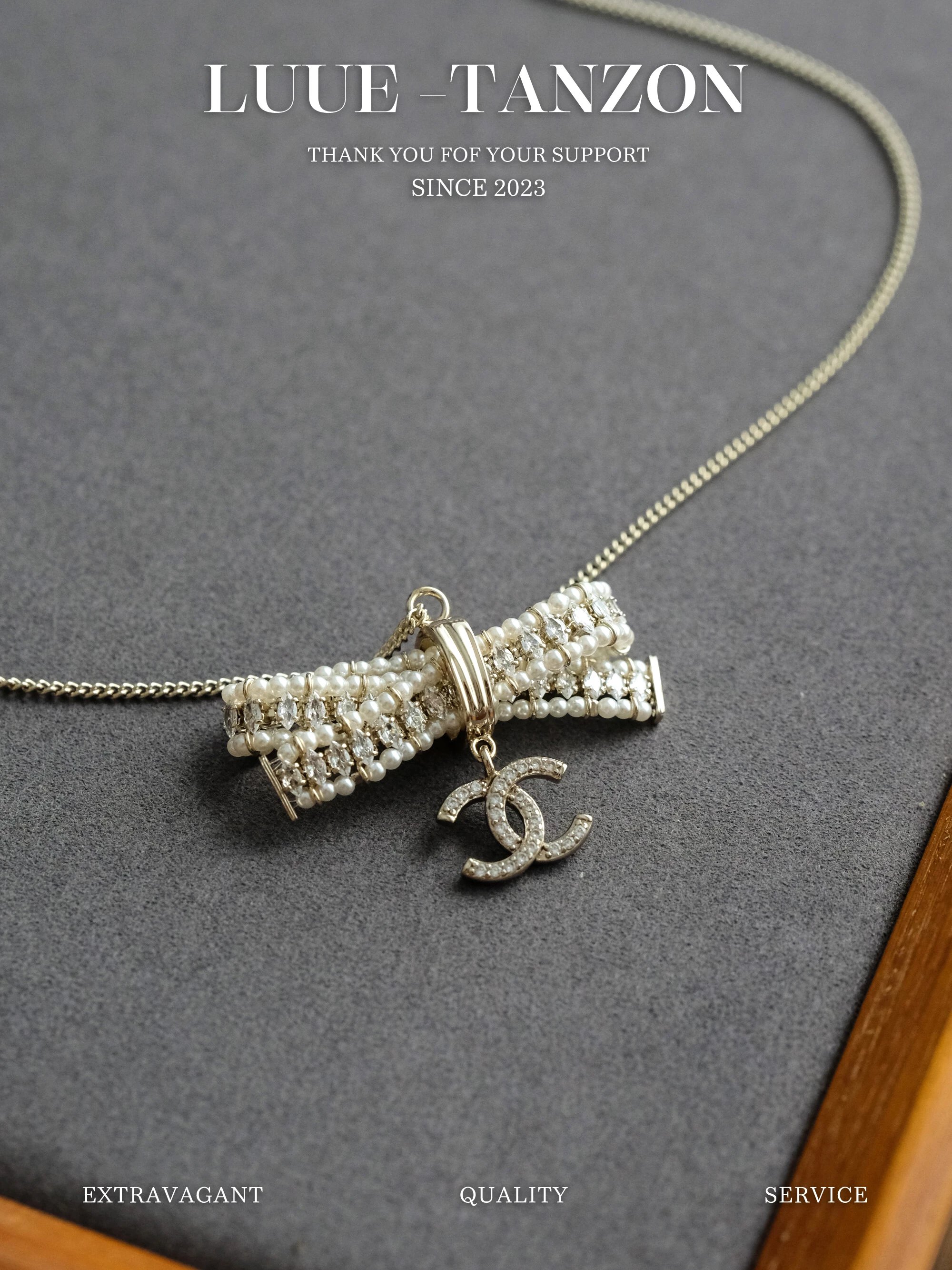 小香23春夏浅金色双排珍珠中间橄榄钻蝴蝶结两用项链