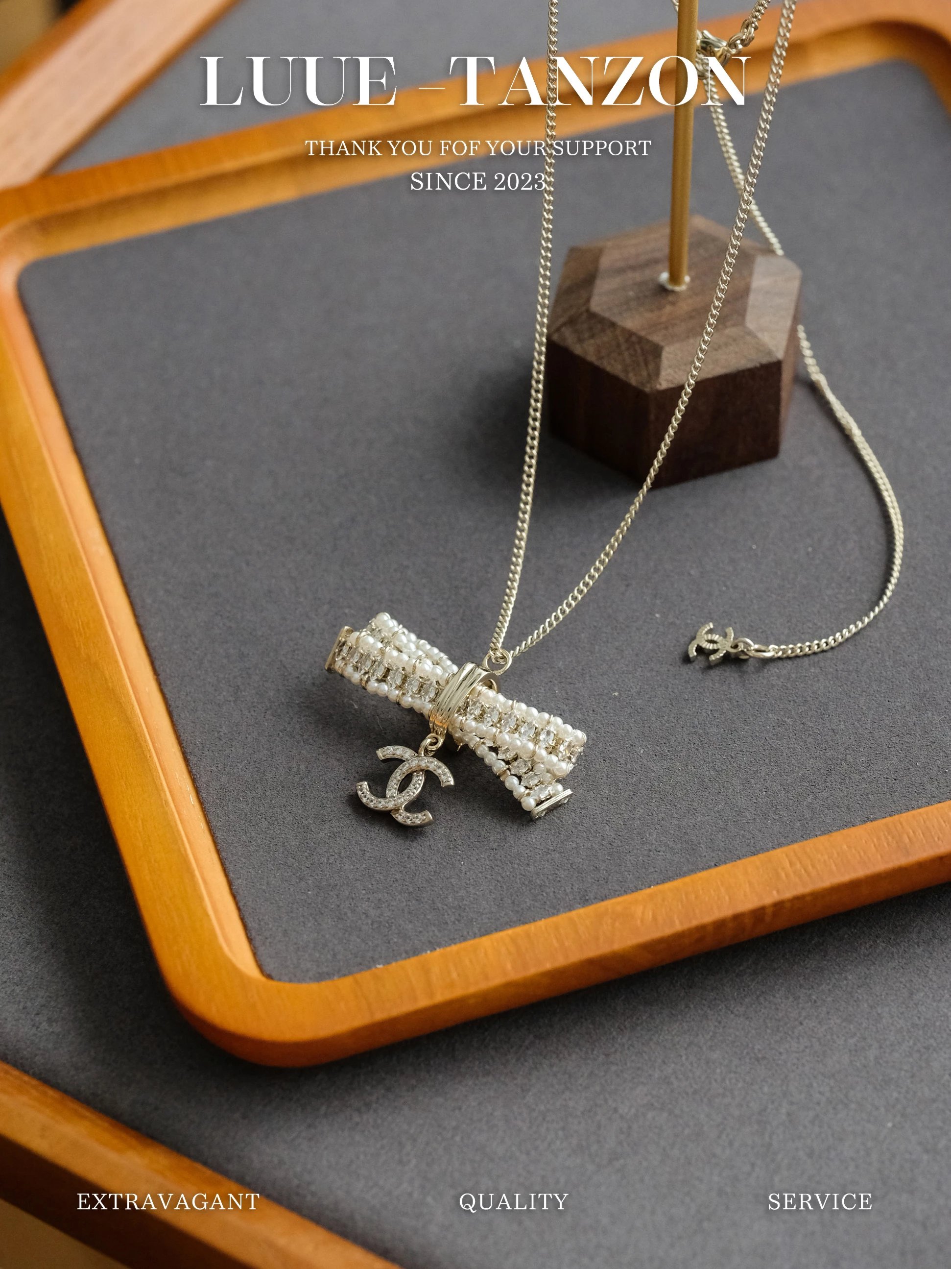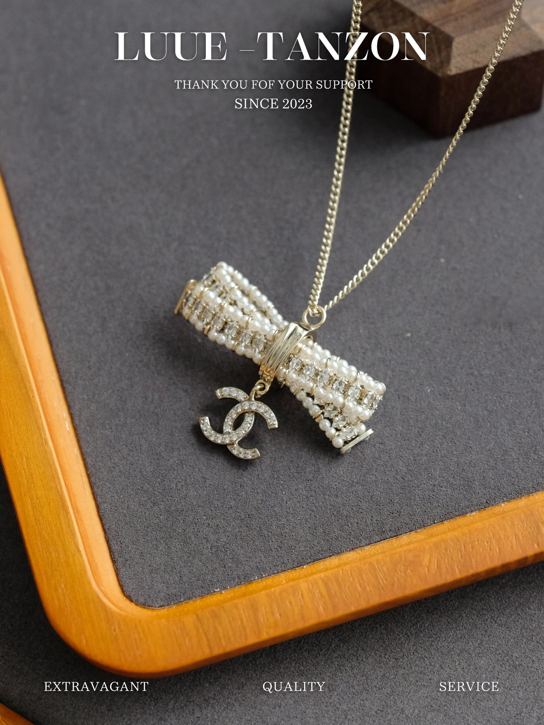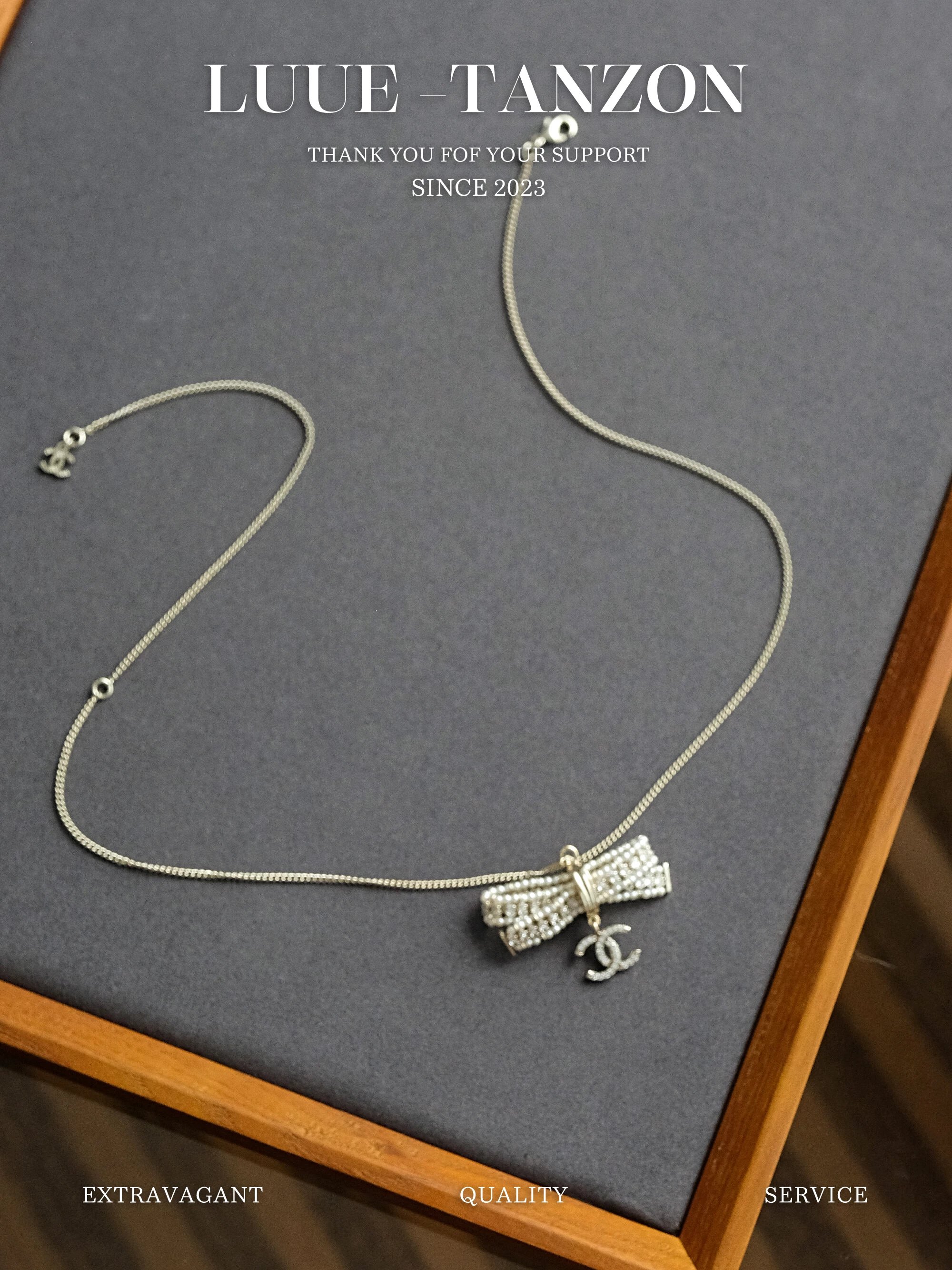 小香23春夏浅金色双排珍珠中间橄榄钻蝴蝶结两用项链