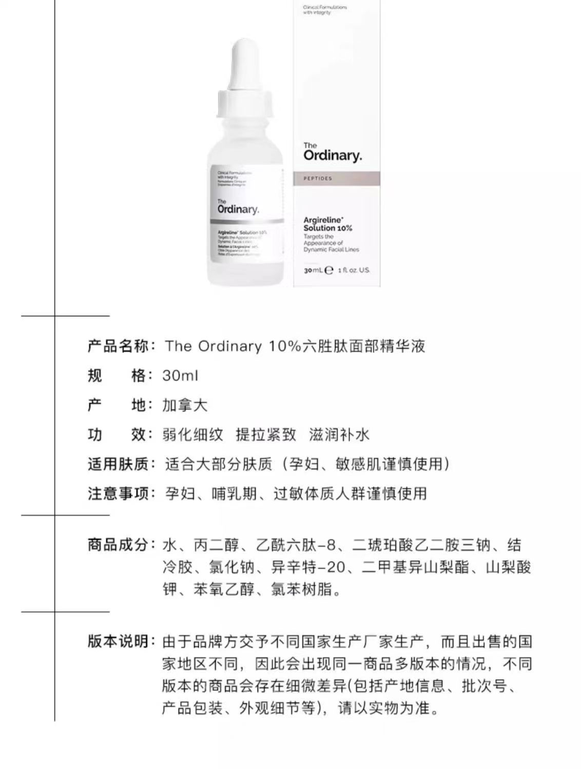 The Ordinary 10%六胜肽精华液30ml 淡化细纹抗皱紧致补水