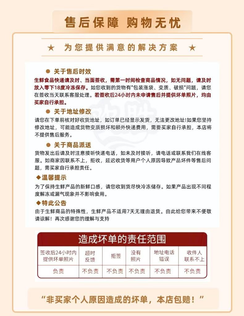 【售后标准】:由于生鲜商品的特殊性,非质量问题不适用7天无理由退货。非买家个人原因造成的坏单或缺斤少两或货不对板,包退或补发