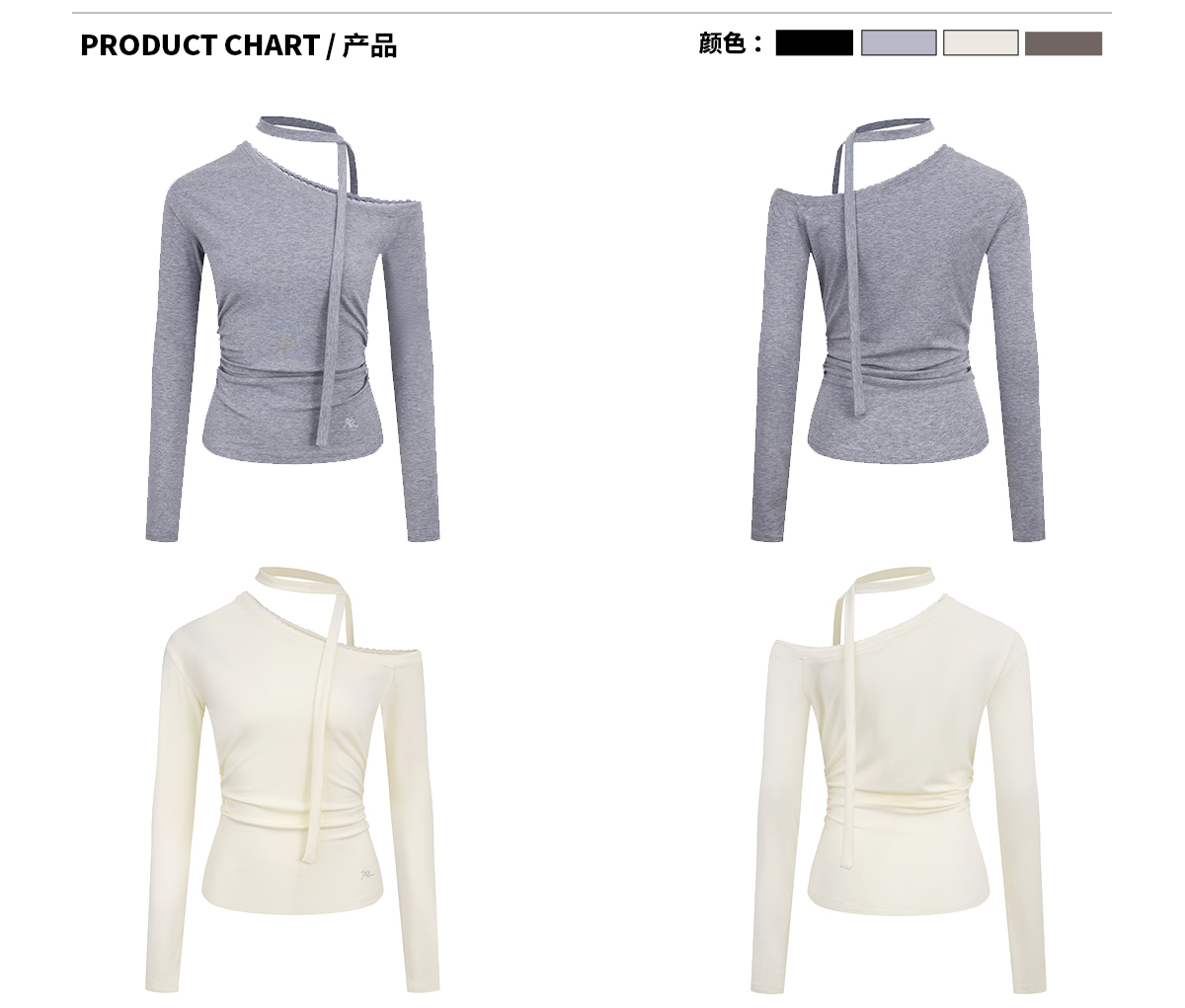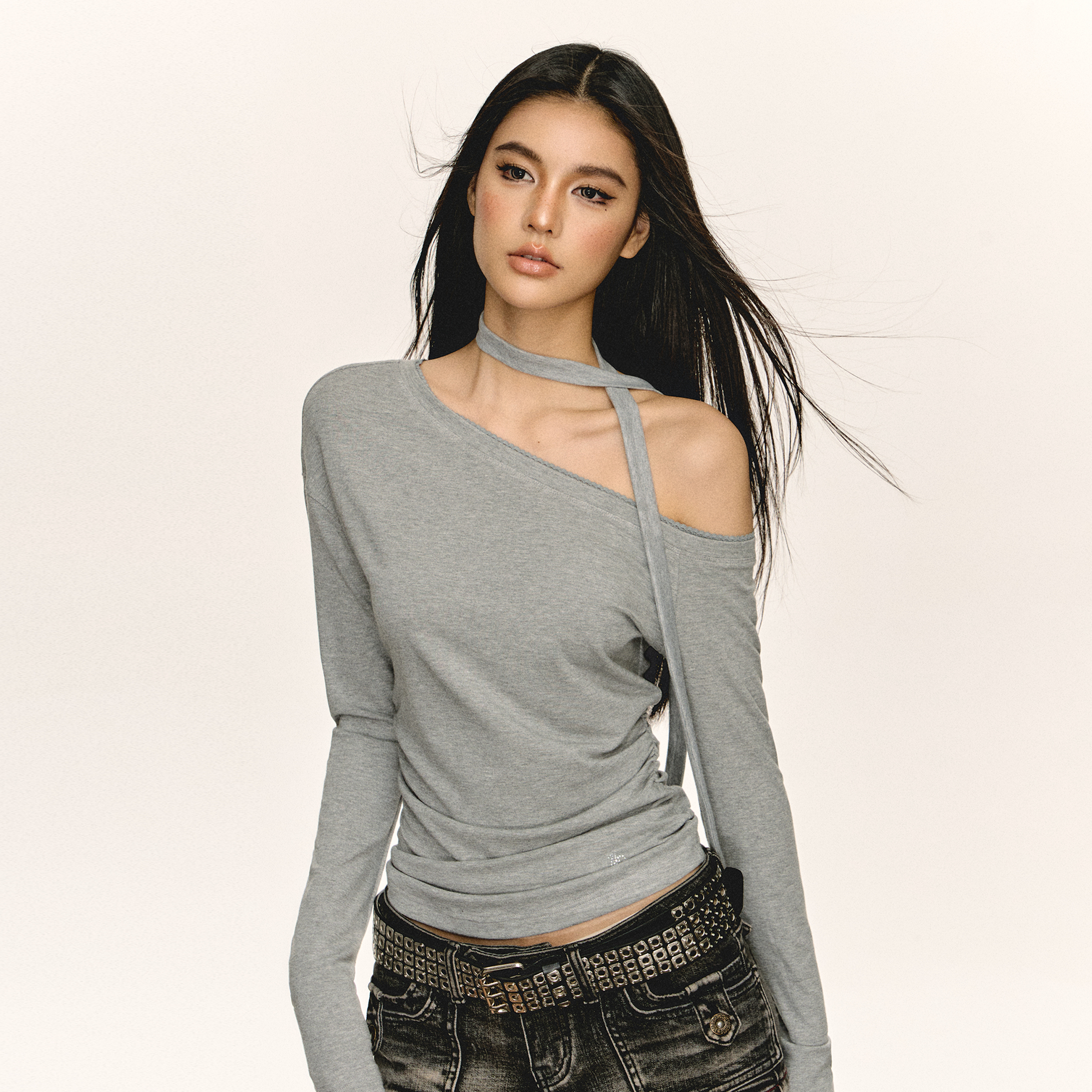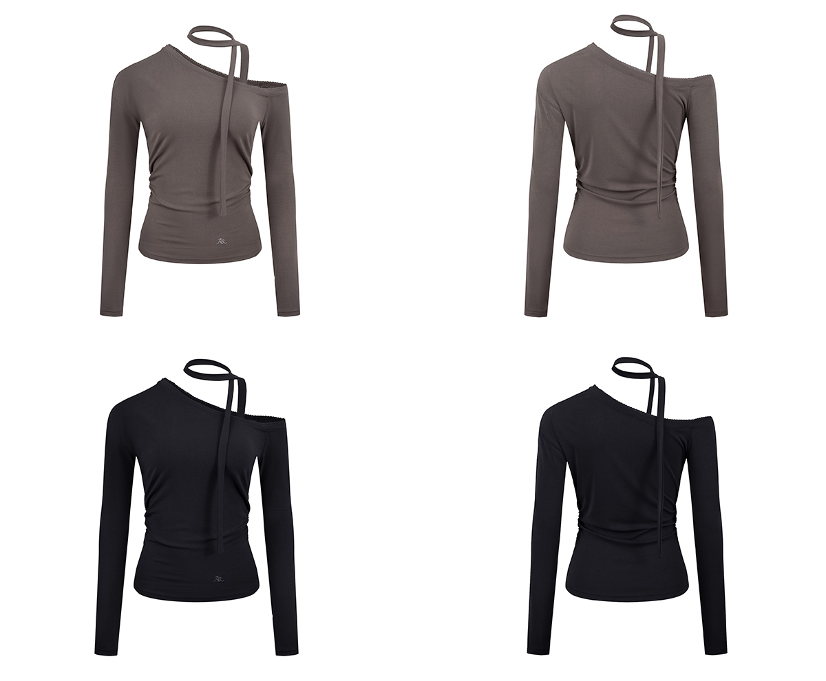 Ariseism 美式复古设计感斜肩长袖T恤女春季新款露肩修身打底上衣