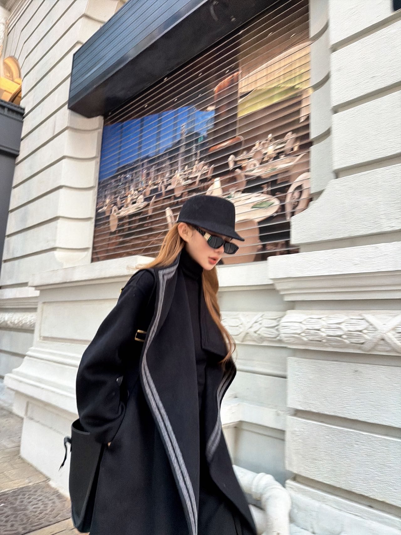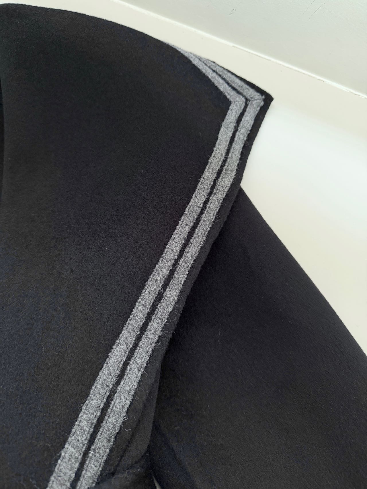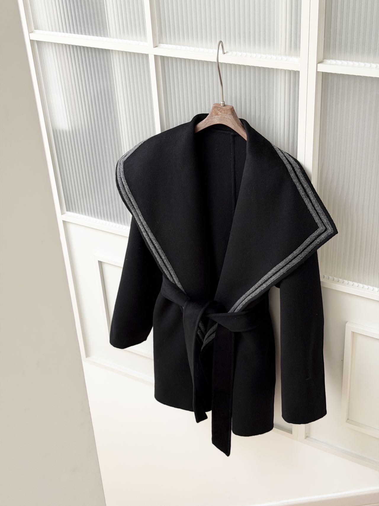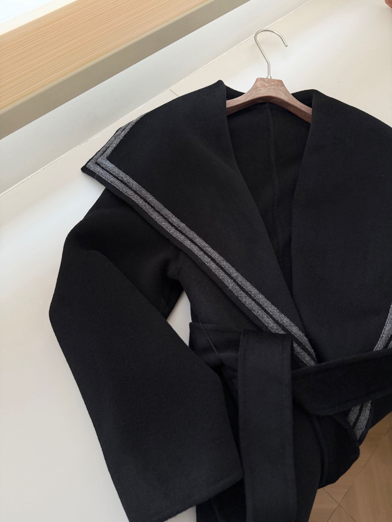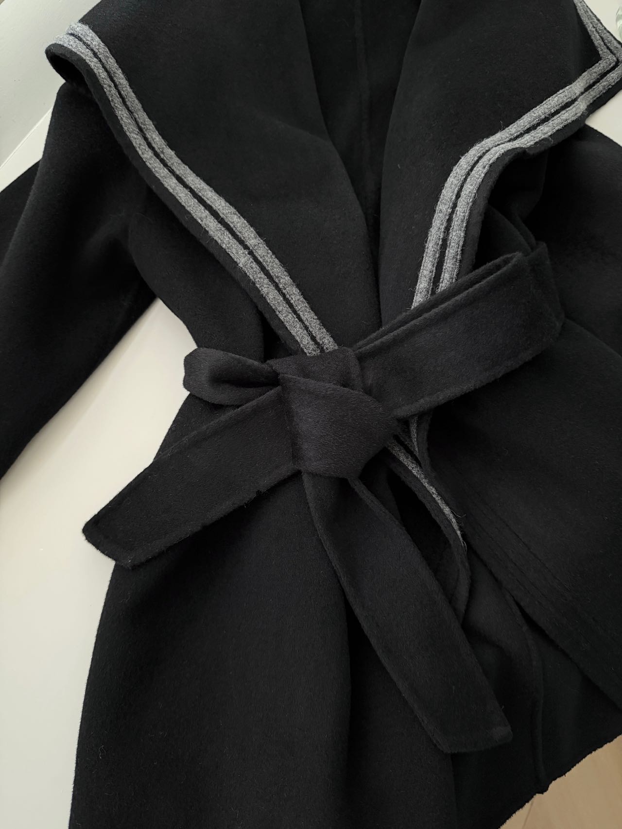 双面呢工艺,无里衬,整体更轻盈;海军领的撞色镶边采用嵌绳工艺,让边缘挺括不易变形,不臃肿的同时保暖。