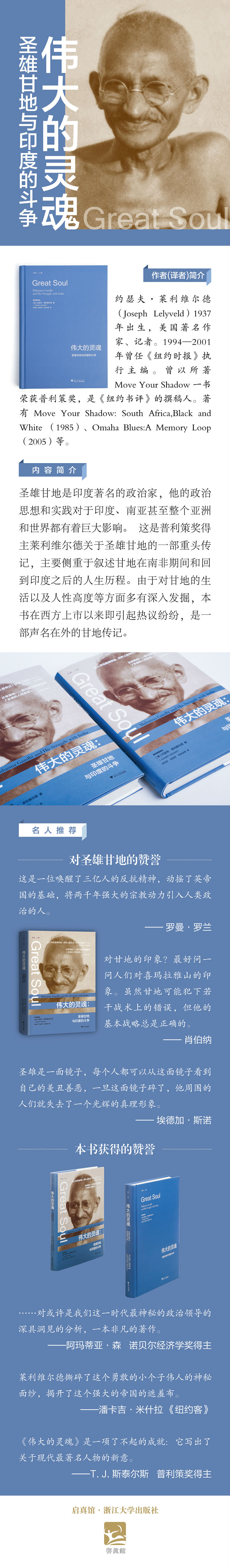 ★这是一位唤醒了三亿人的反抗精神,动摇了英帝国的基础,将两千年强大的宗教动力引入人类政治的人。 ——罗曼·罗兰 ★对甘地的印象?问一问人们对喜玛拉雅山的印象。虽然甘地可能犯下若干战术上的错误,但他的基本战略总是正确的。 ——肖伯纳 ★圣雄是一面镜子,每个人都可以从这面镜子看到自己的美丑善恶,一旦这面镜子碎了,他周围的人们就失去了一个光辉的真理形象。 —一埃德加·斯诺 ★……对或许是我们这一时代神秘的政治领导的深具洞觅的分析,一本非凡的著作。 ——阿玛蒂亚·森诺贝尔经济学奖得主 ★莱利维尔德撕碎了这个勇敢的小个子伟人的神秘面纱,揭开了这个强大的帝国的遮羞布。 ——潘卡吉·米什拉《纽约客》 ★《伟大的灵魂》是一项了不起的成就:它写出了关于现代著名人物的新意。 ——T.J.斯泰尔斯普利策奖得主