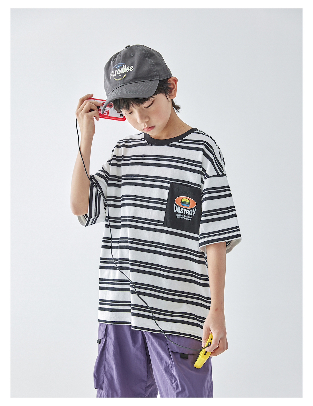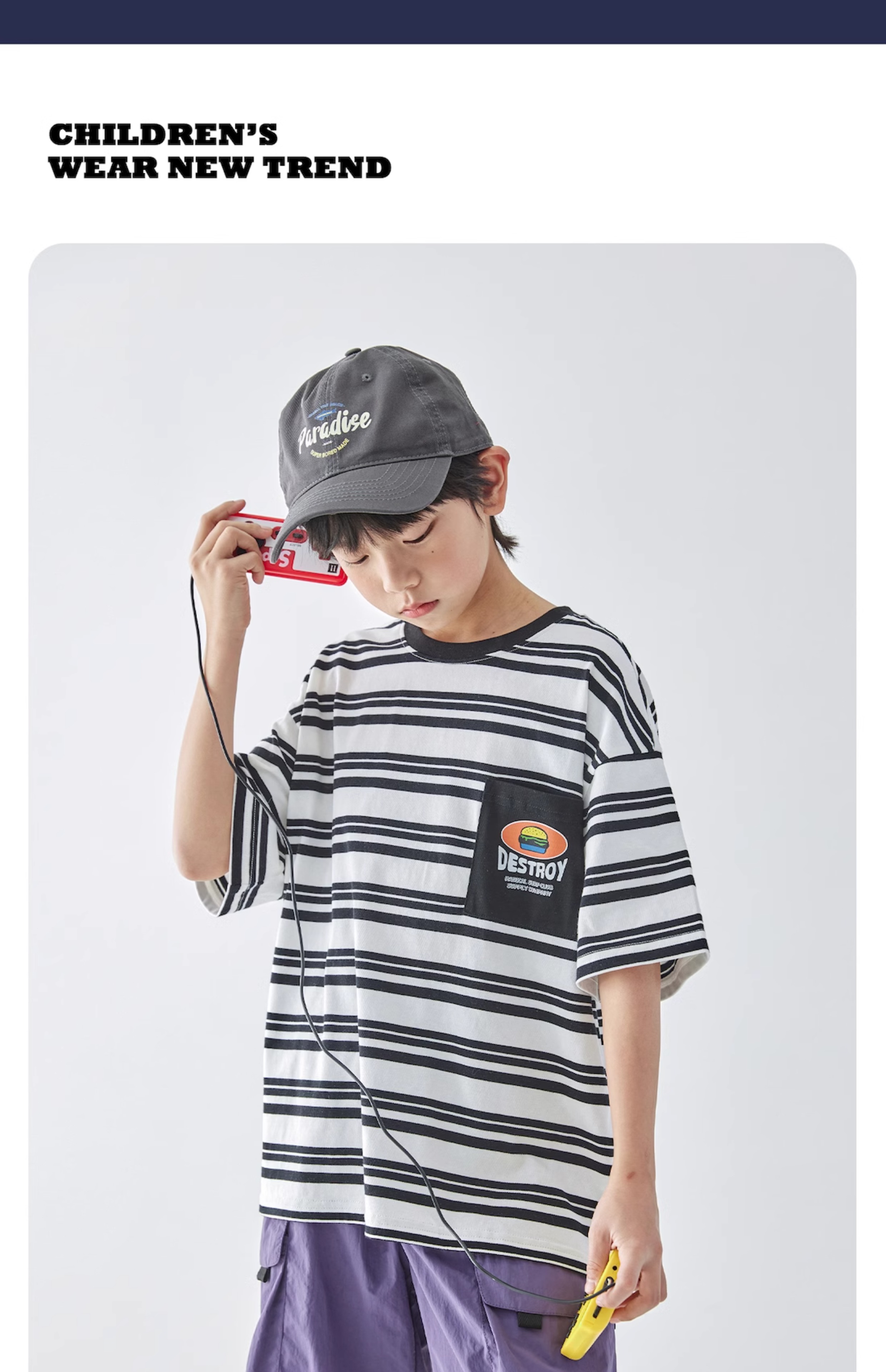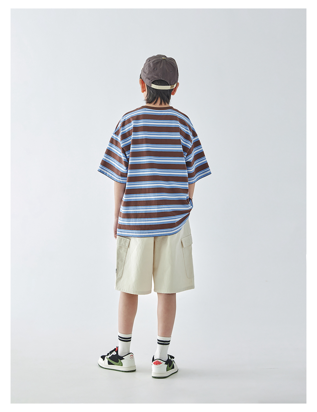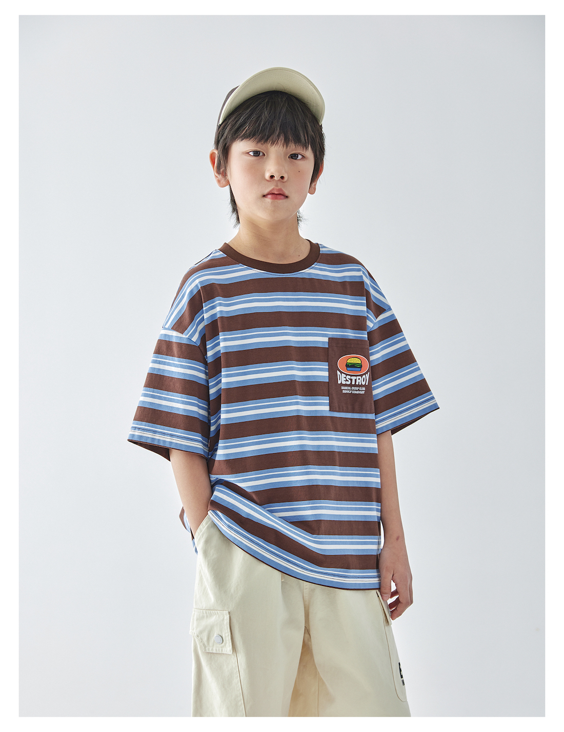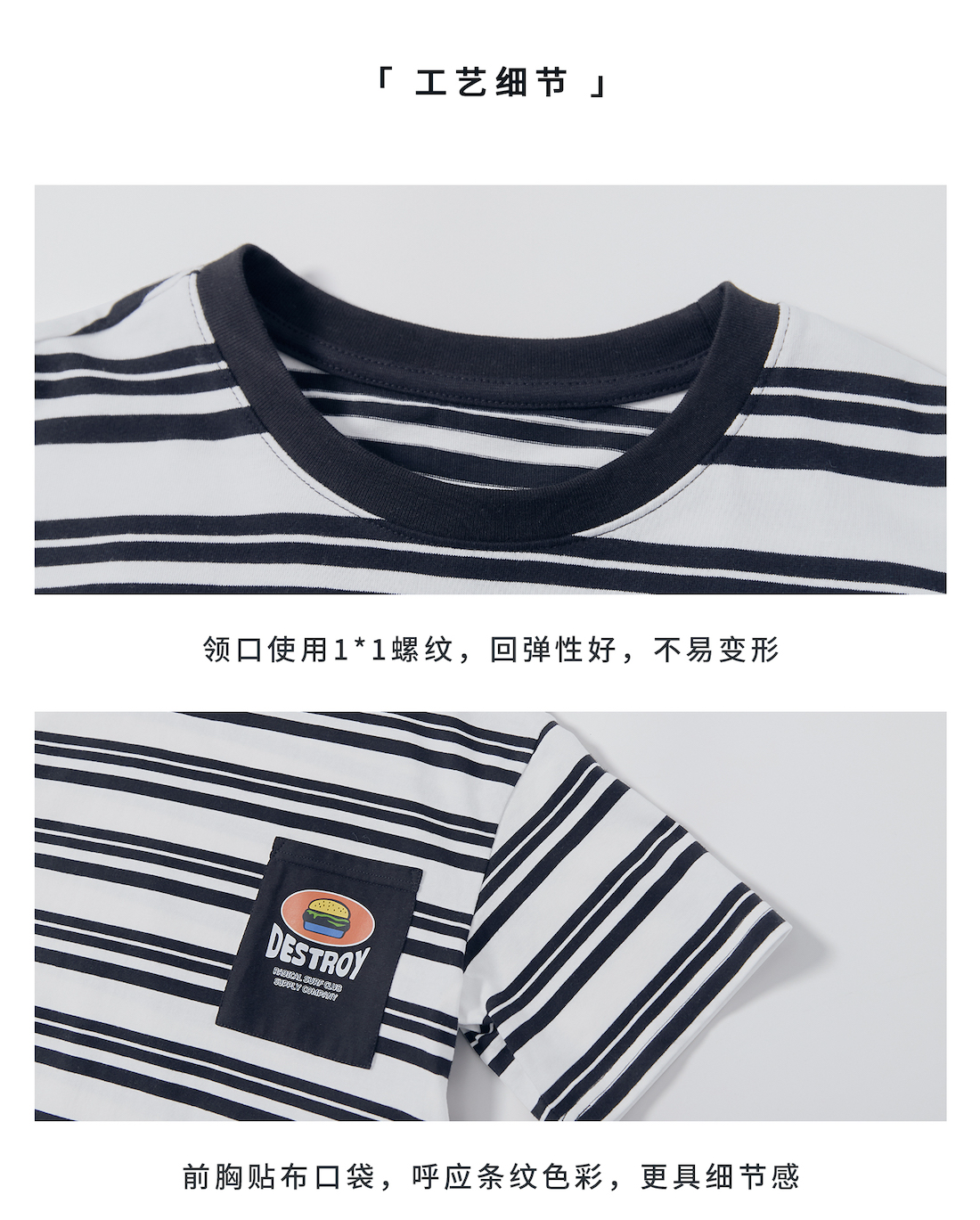 蓝汽水2025新款双纱条纹短袖T恤春夏口袋彩色趣味印花亲子款上衣