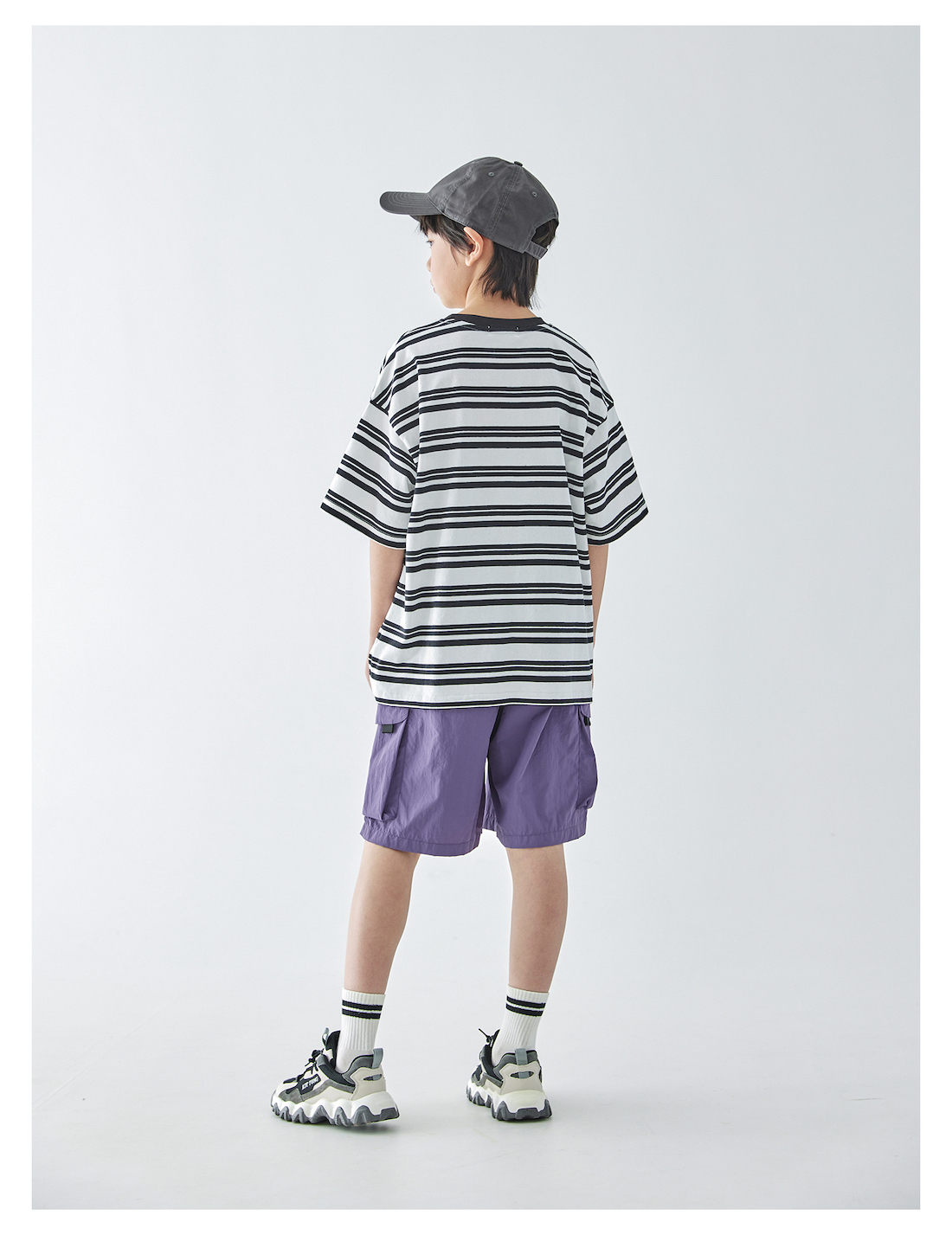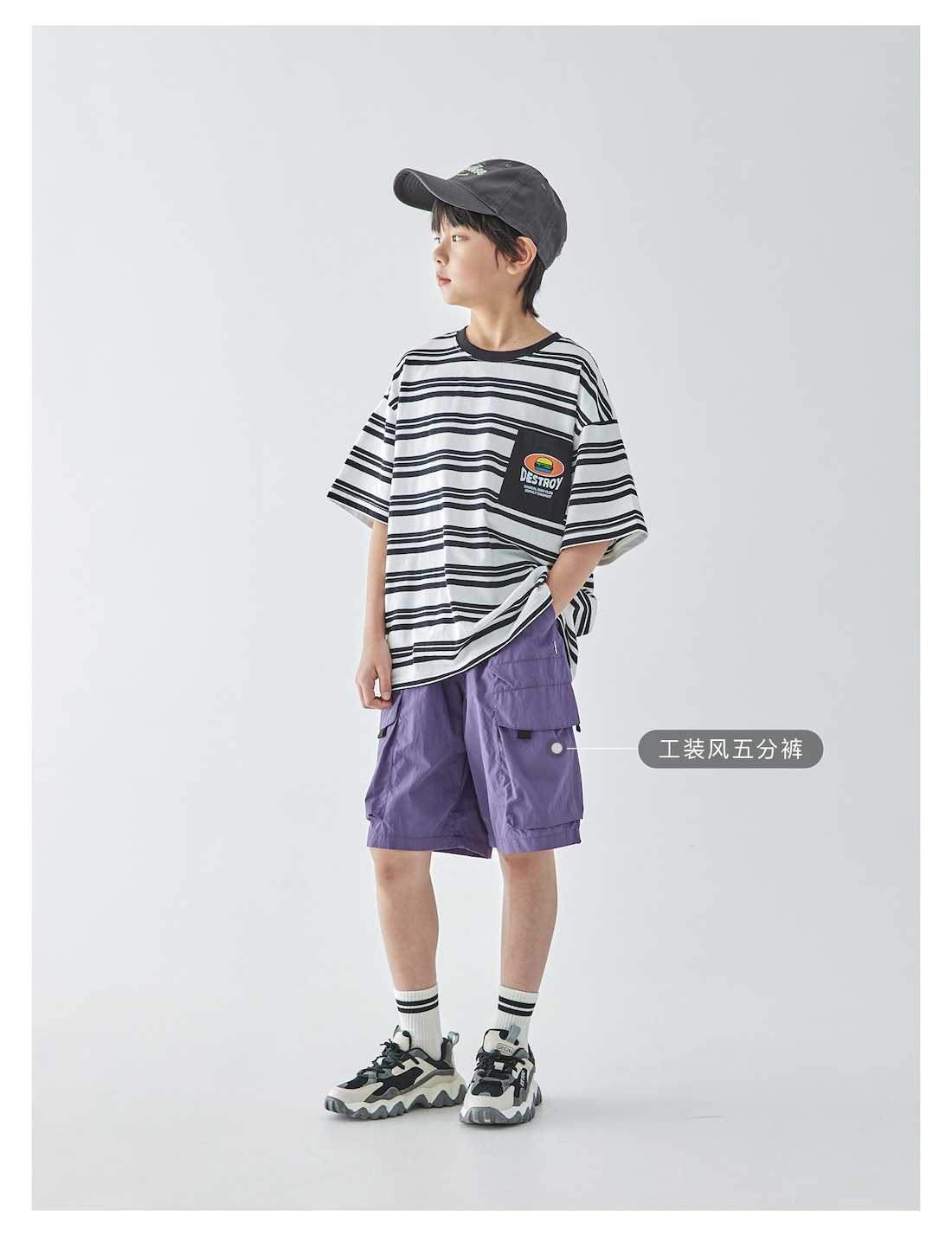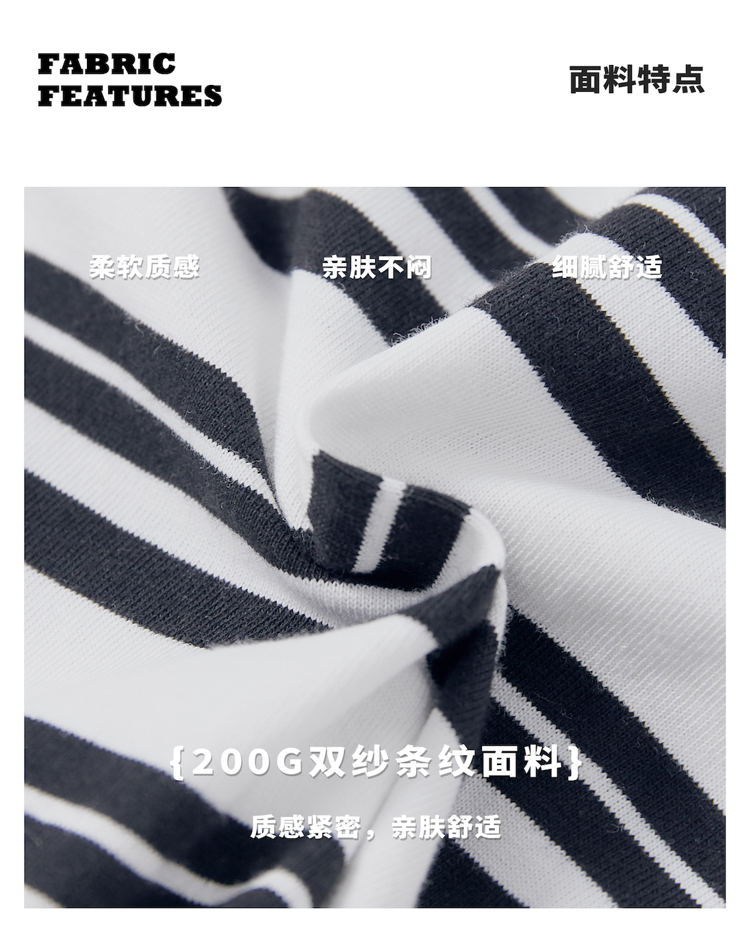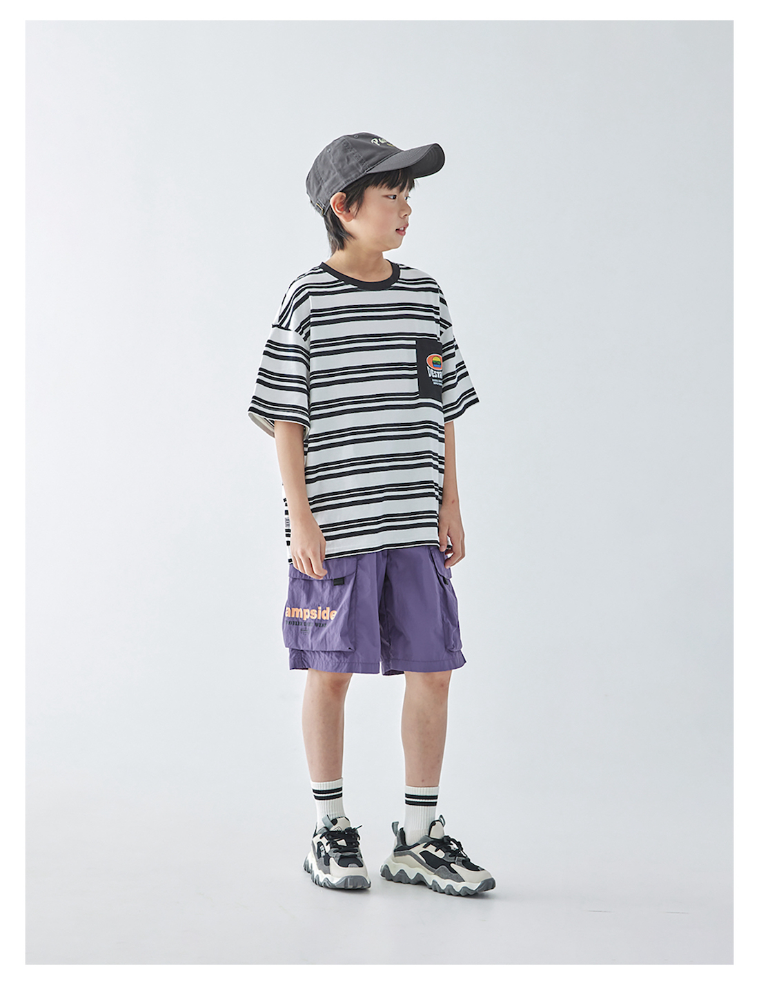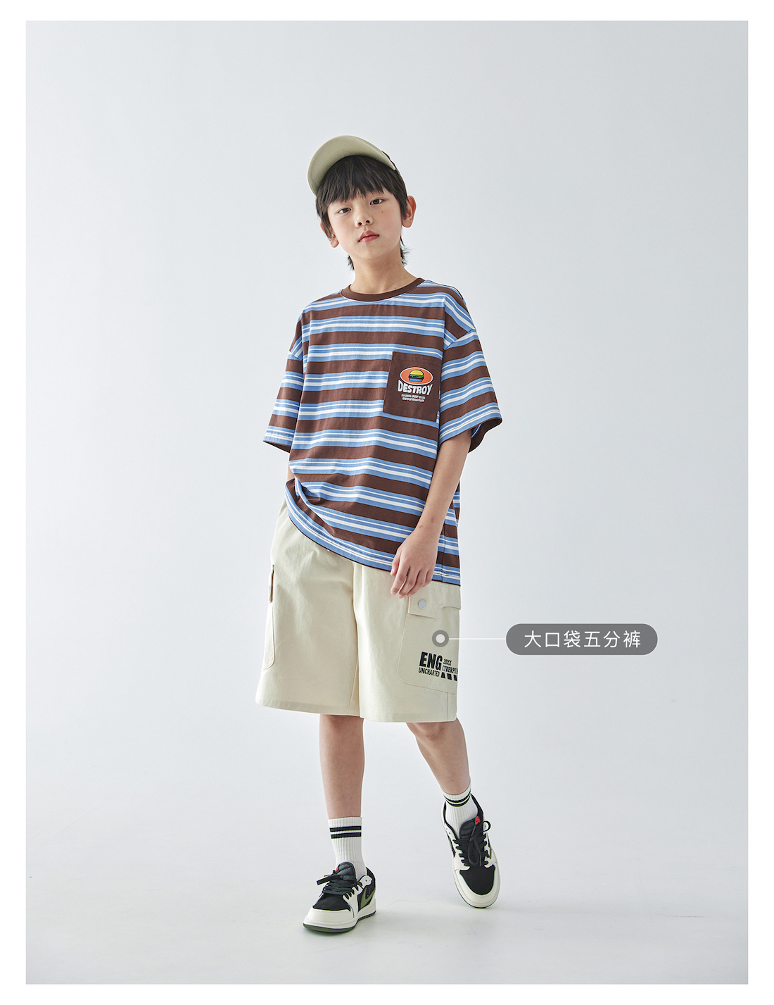 蓝汽水2025新款双纱条纹短袖T恤春夏口袋彩色趣味印花亲子款上衣