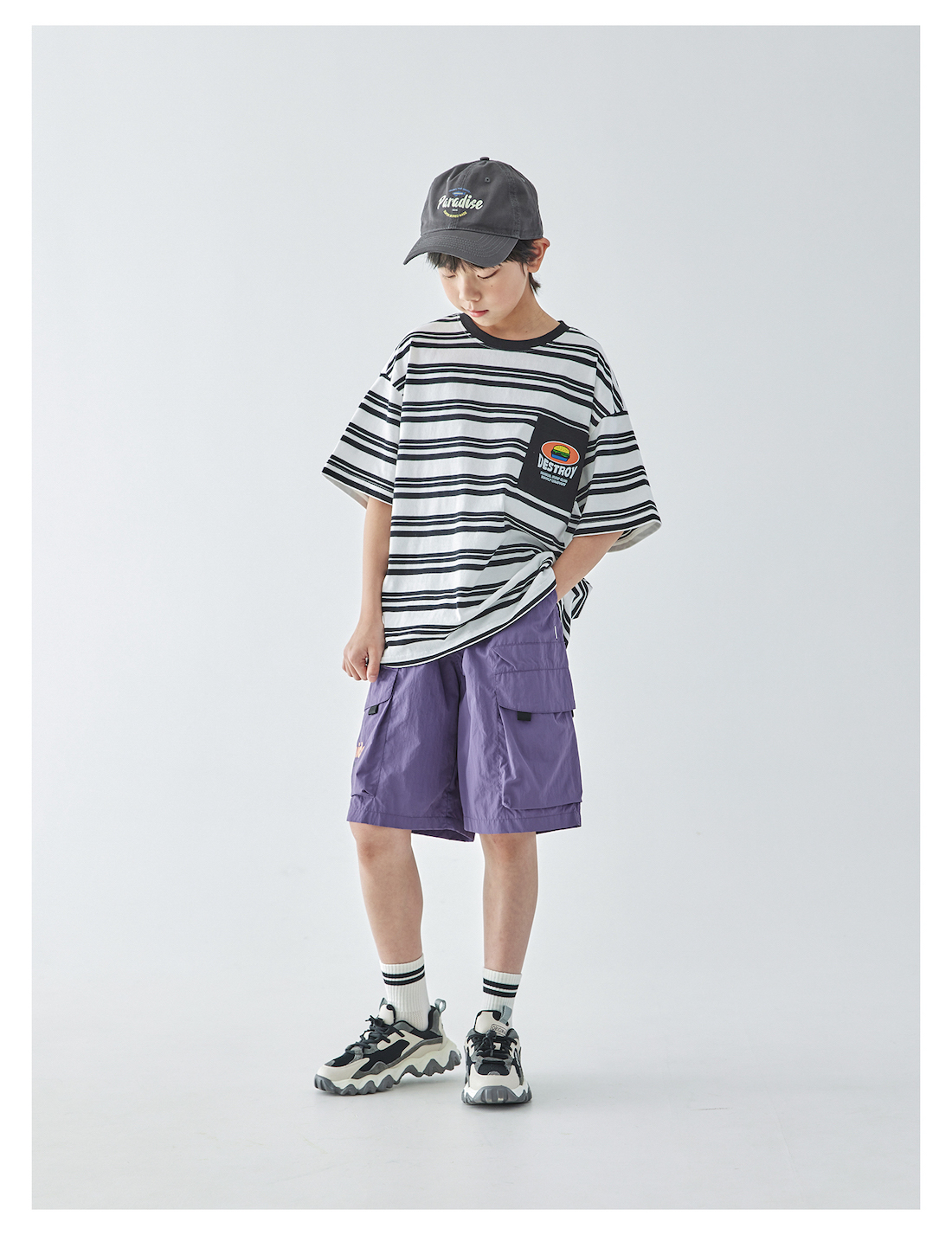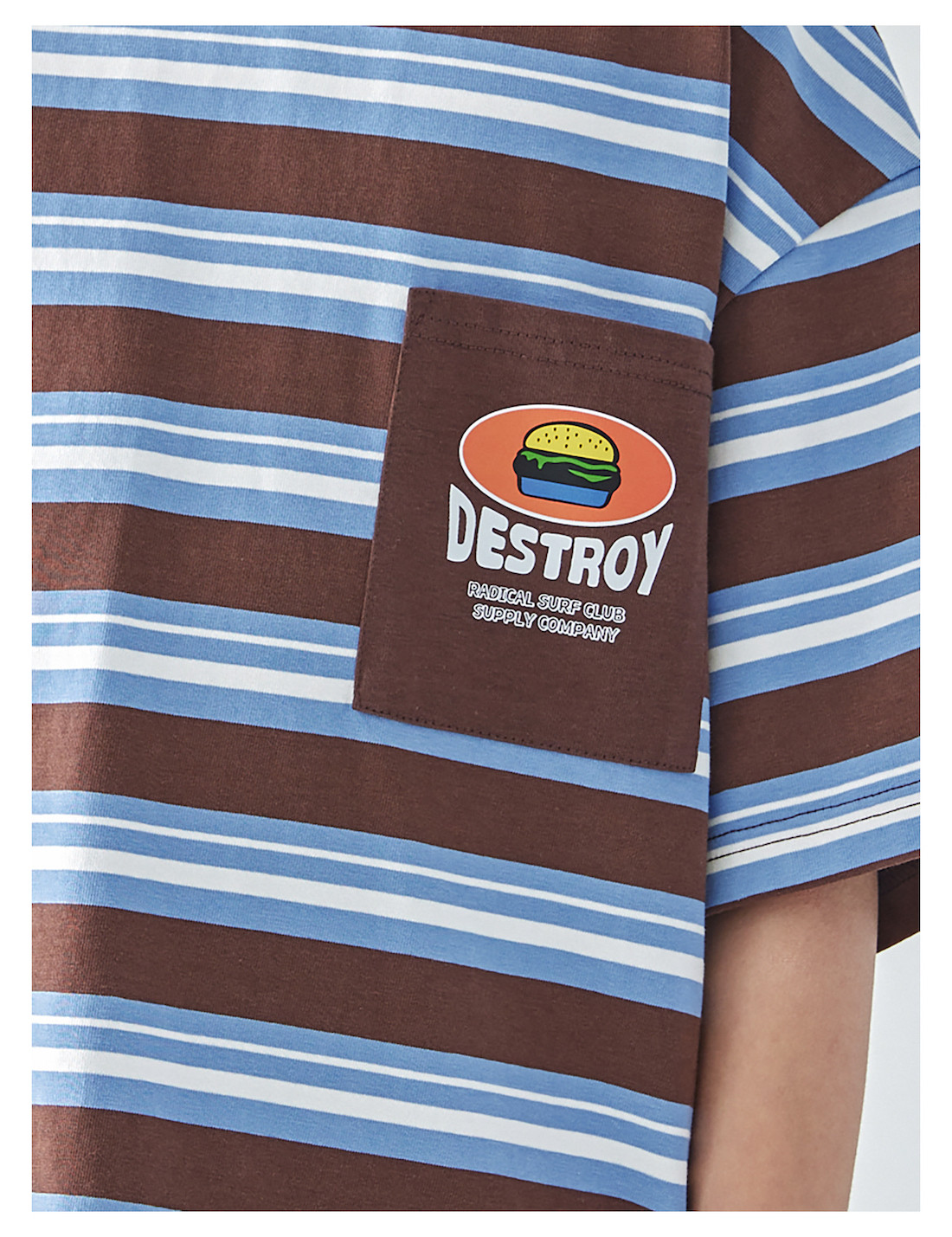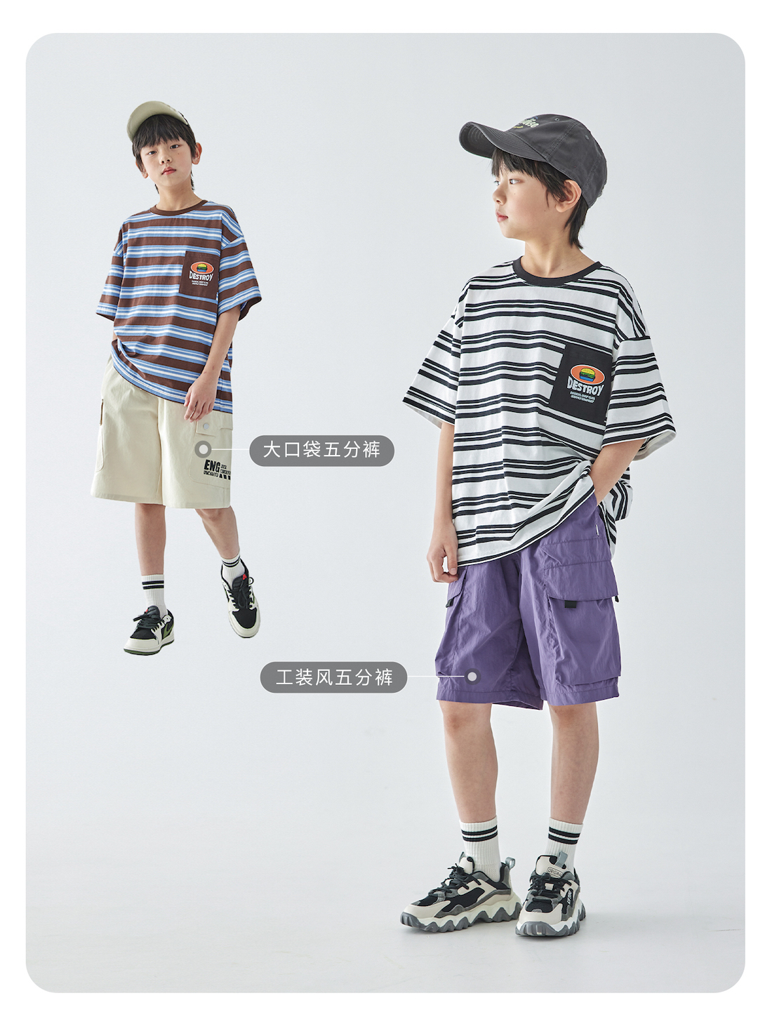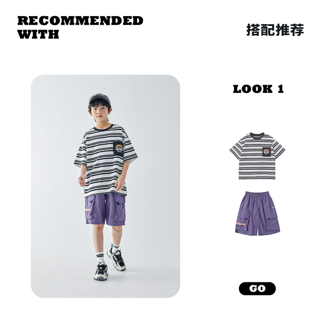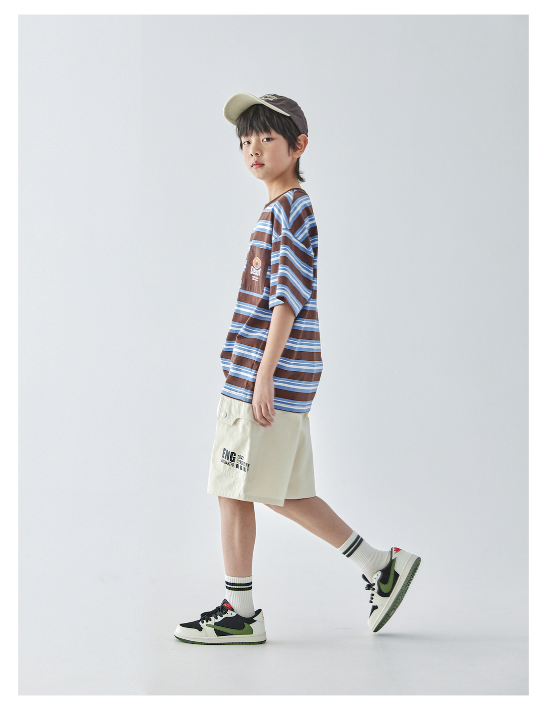 蓝汽水2025新款双纱条纹短袖T恤春夏口袋彩色趣味印花亲子款上衣
