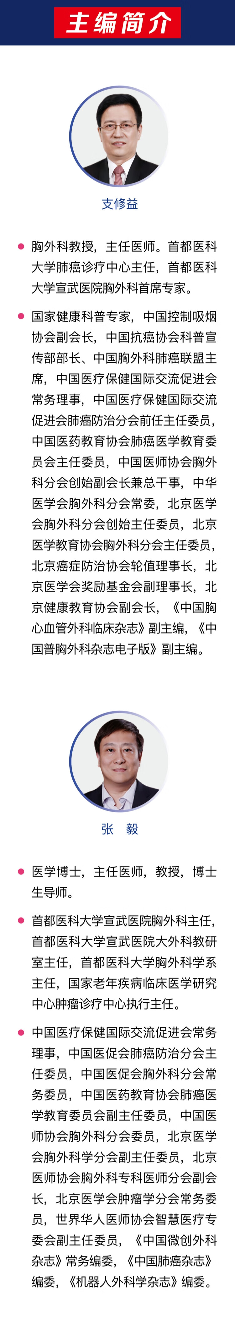 张毅,医学博士,主任医师,教授,博士研究生导师。首都医科大学宣武医院胸外科主任,首都医科大学宣武医院大外科教研室主任,首都医科大学胸外科学系主任,国家老年疾病临床医学研究中心肿瘤诊疗中心执行主任。 支修益,国家健康科普专家。首都医科大学肺癌诊疗中心主任,首都医科大学大学宣武医院胸外科首席专家。中国胸外科肺癌联盟主席,中国控制吸烟协会副会长兼肺癌防治分会主任委员,北京医学教育协会胸外科分会主任委员。
