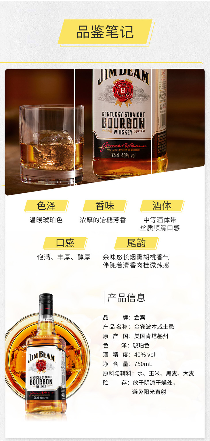 洋酒白占边波本威士忌BOURBON WHISKEYJimBeam金宾750ml/瓶