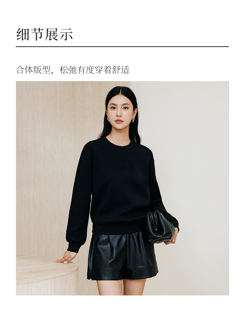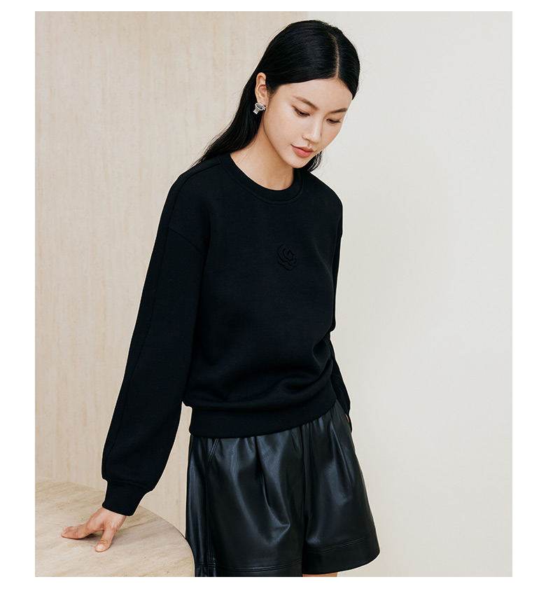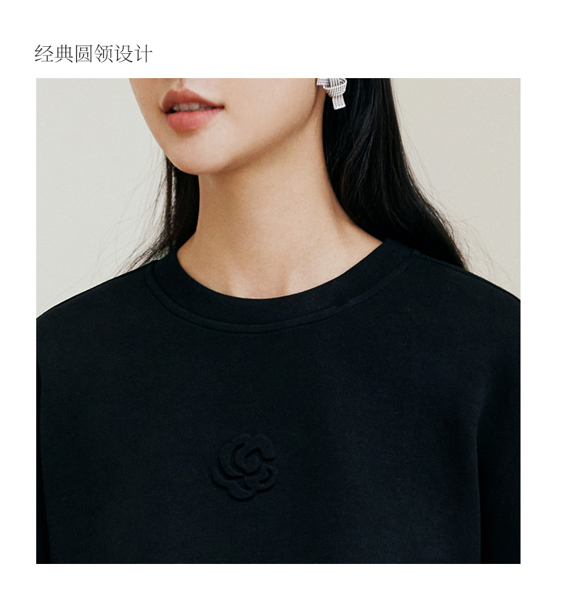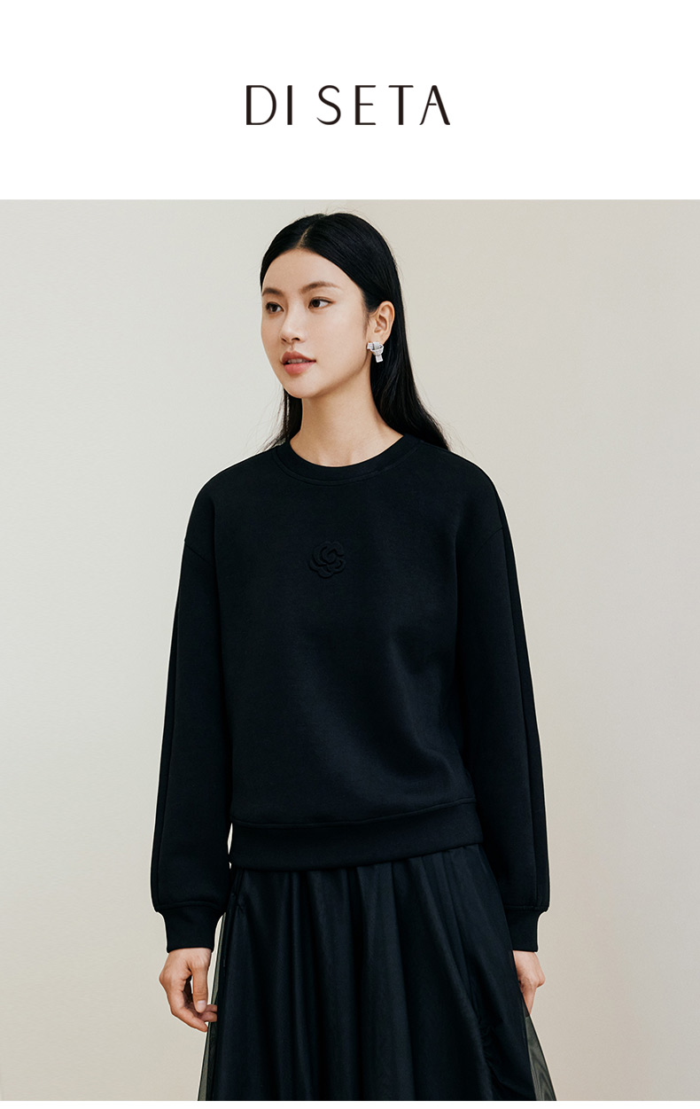 玳莎黑色压花圆领卫衣2024冬季新款通勤时尚休闲落肩袖内搭上衣女 ED32301