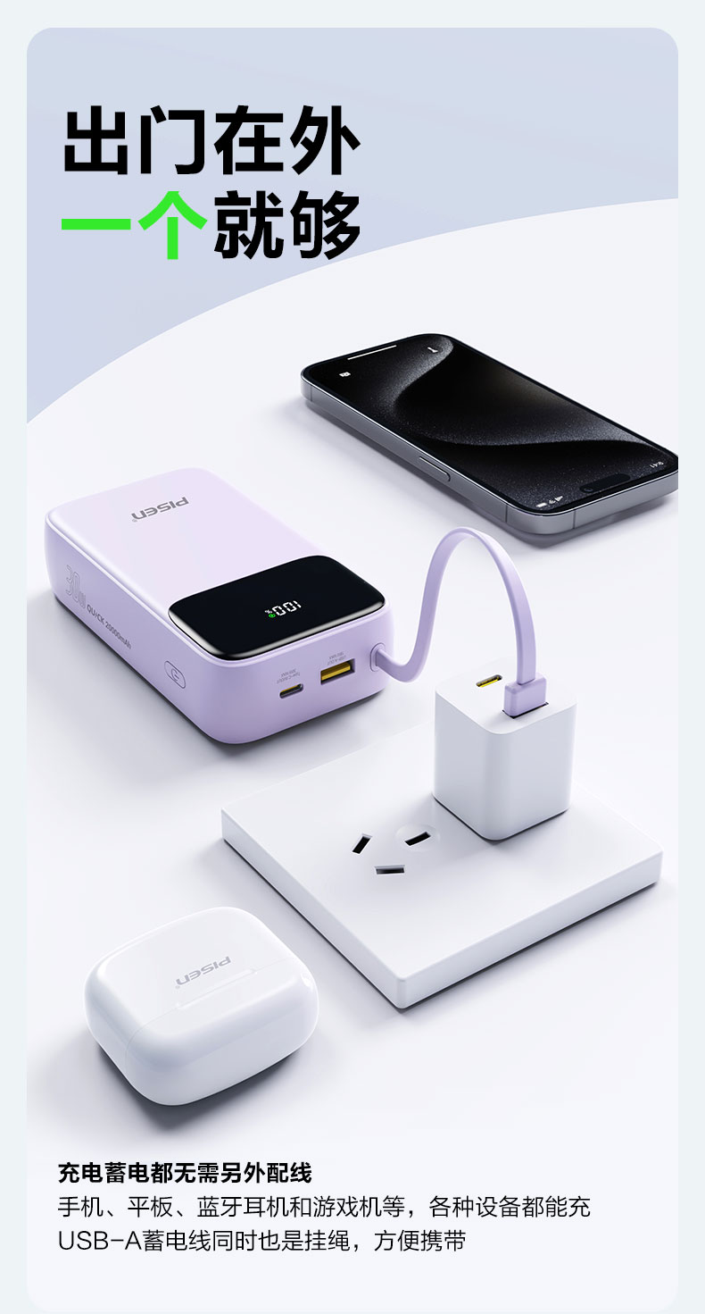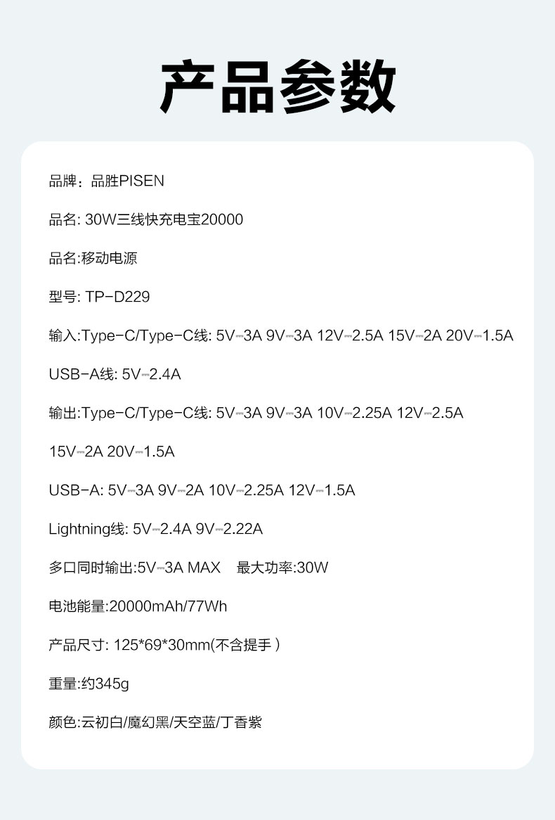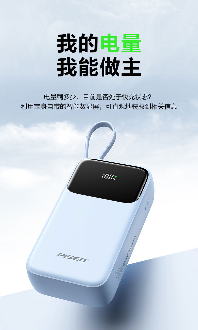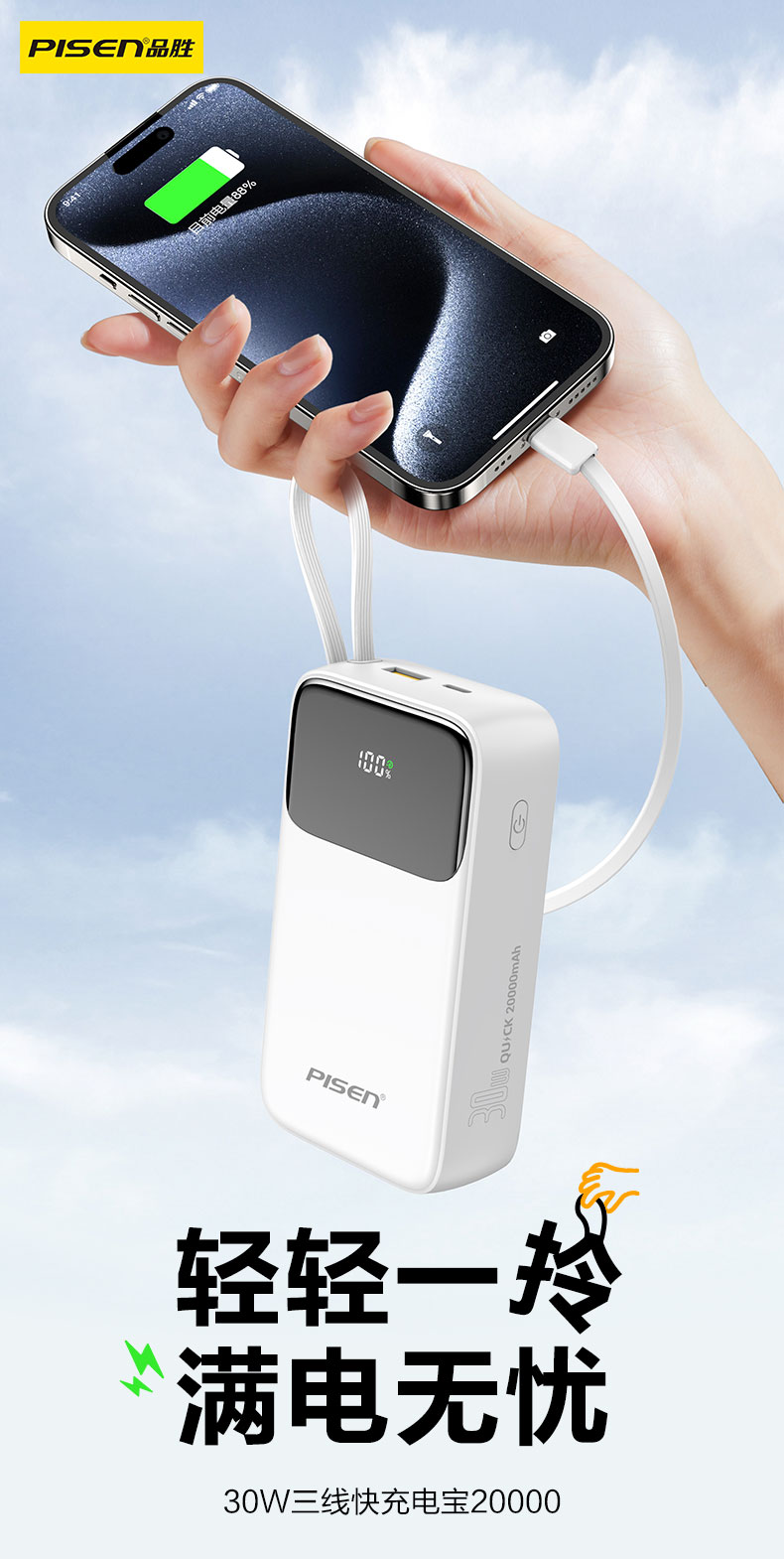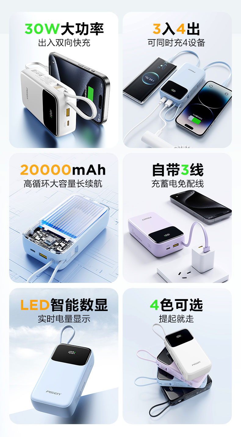 品胜 三线快充电宝20000毫安 大容量 30W快充移动电源适用苹果/华为/小米