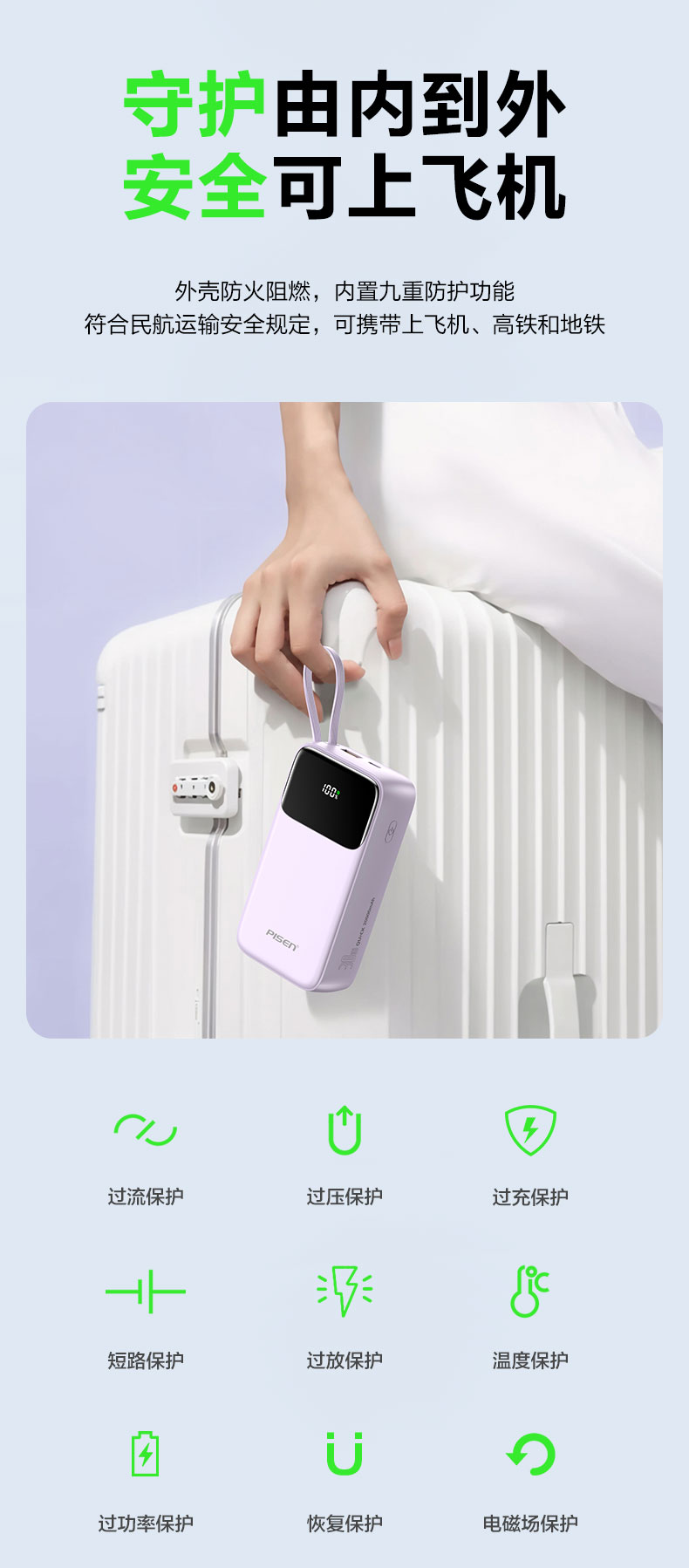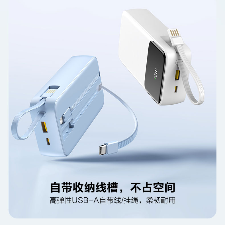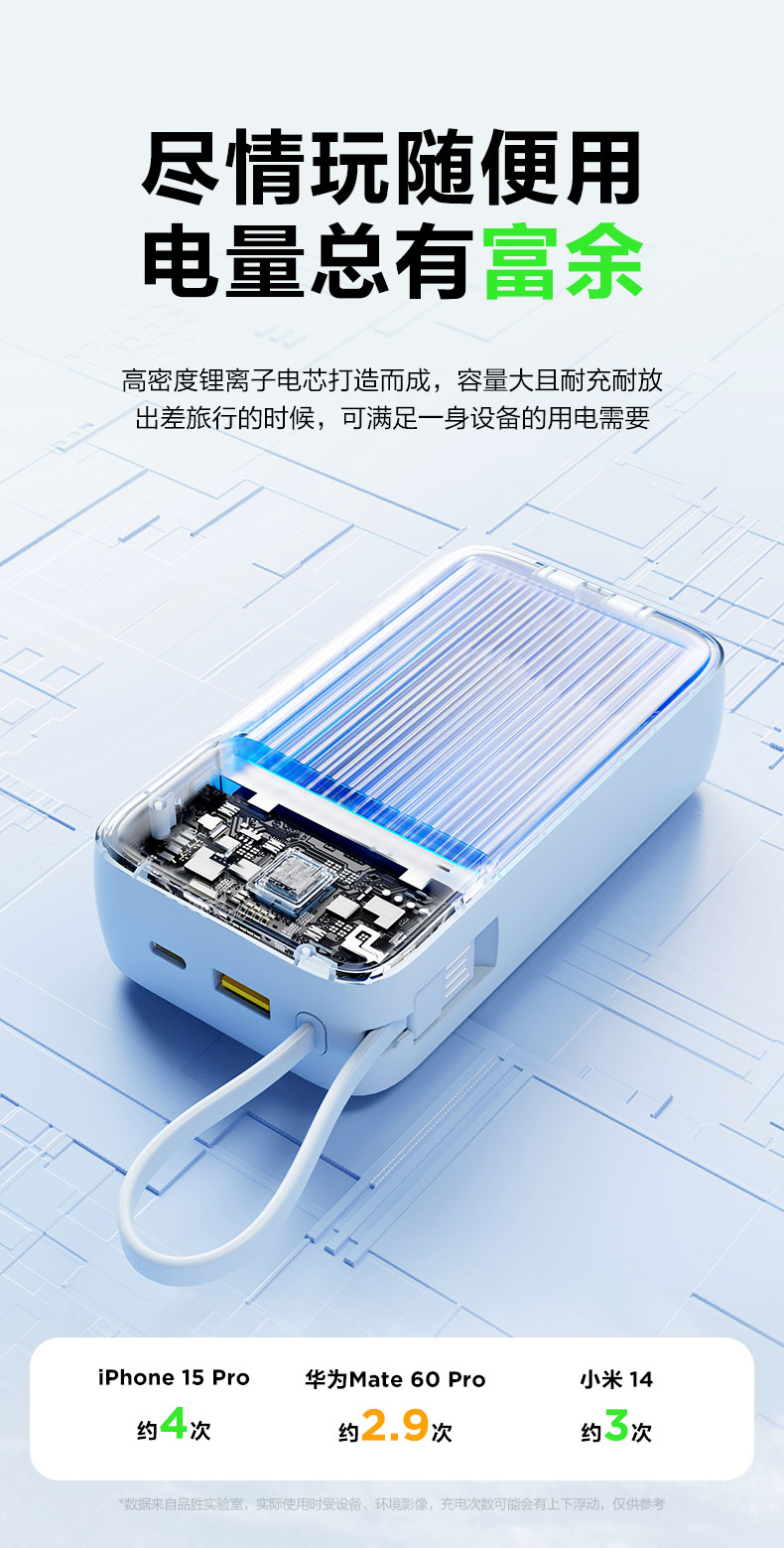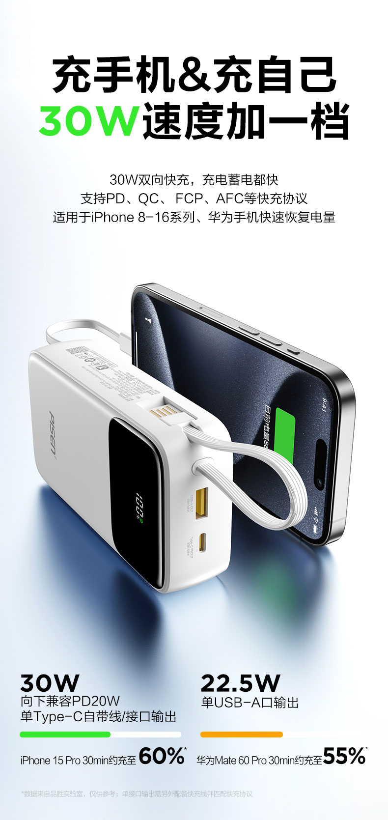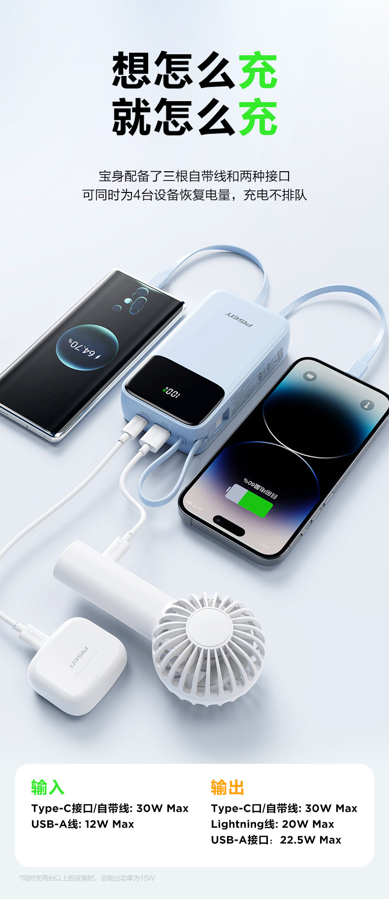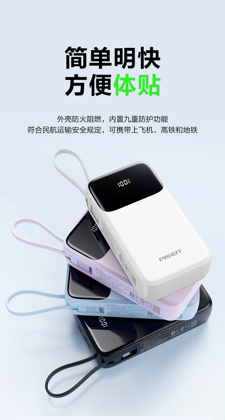 品胜 三线快充电宝20000毫安 大容量 30W快充移动电源适用苹果/华为/小米