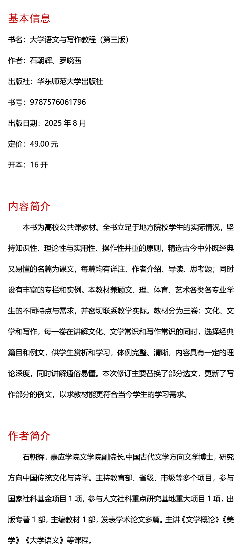 大学语文与写作教程 第三版 高校公共课教材 石朝辉 罗晓茜