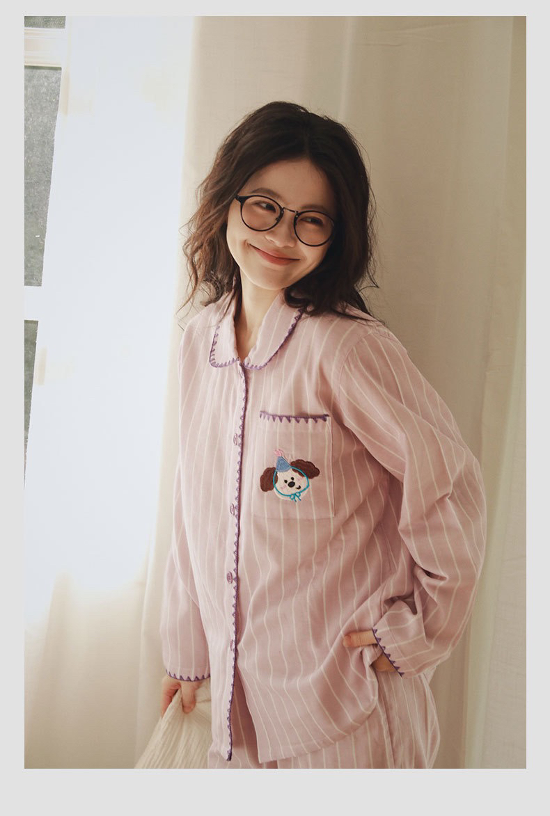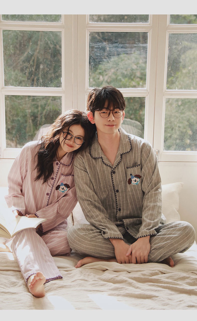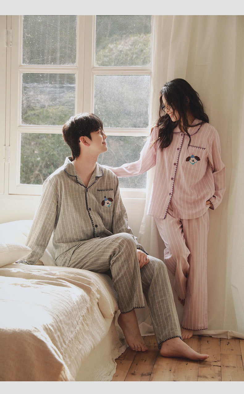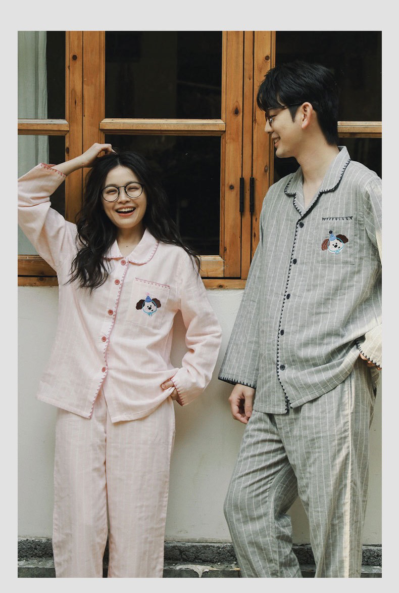 全棉双层纱~情侣款生日狗刺绣纯棉睡衣丘比兔刺绣长袖套装春秋季新款男女士家居服