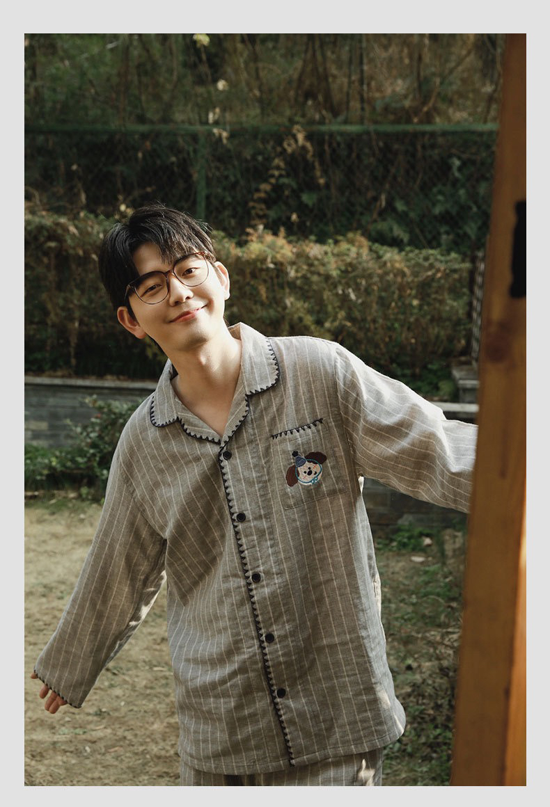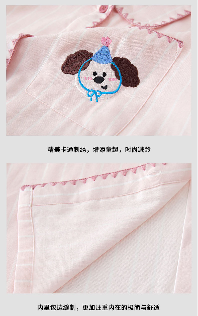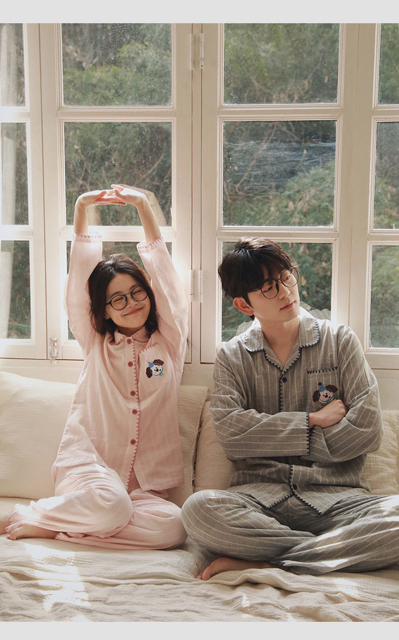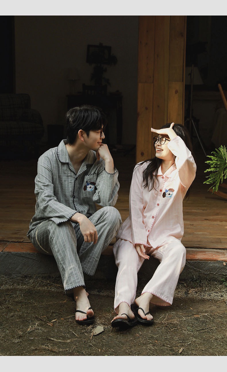全棉双层纱~情侣款生日狗刺绣纯棉睡衣丘比兔刺绣长袖套装春秋季新款男女士家居服