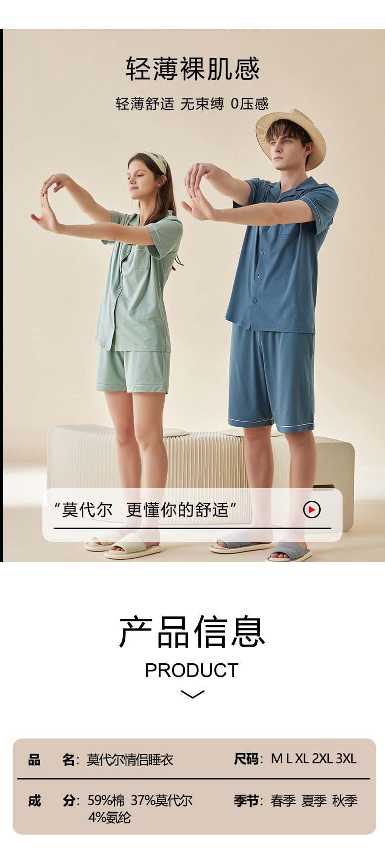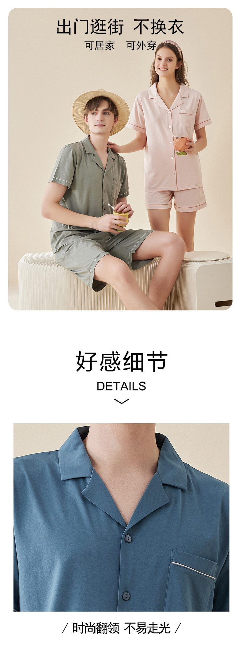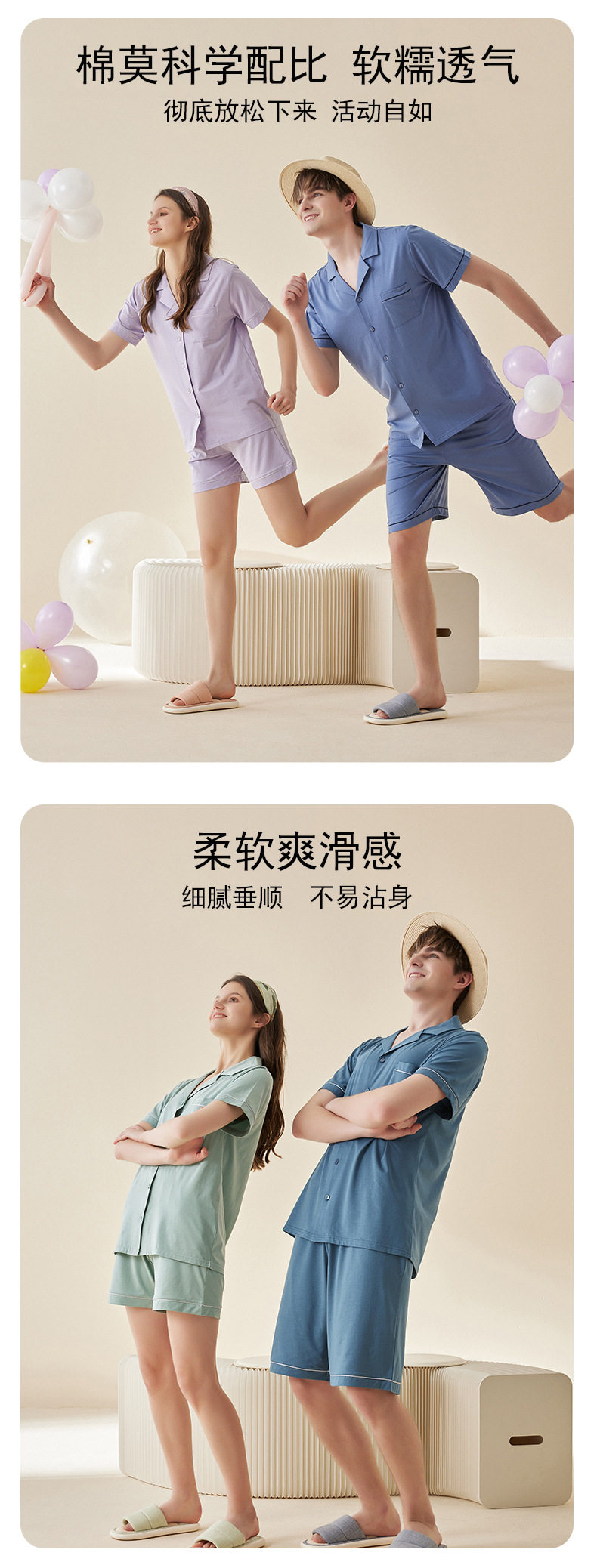 兰精莫代尔棉短袖短裤情侣睡衣女夏 纯色简约男女士家居服
