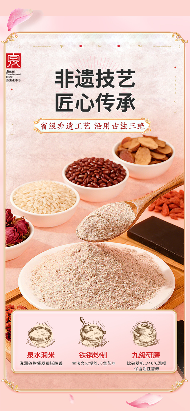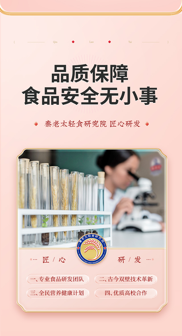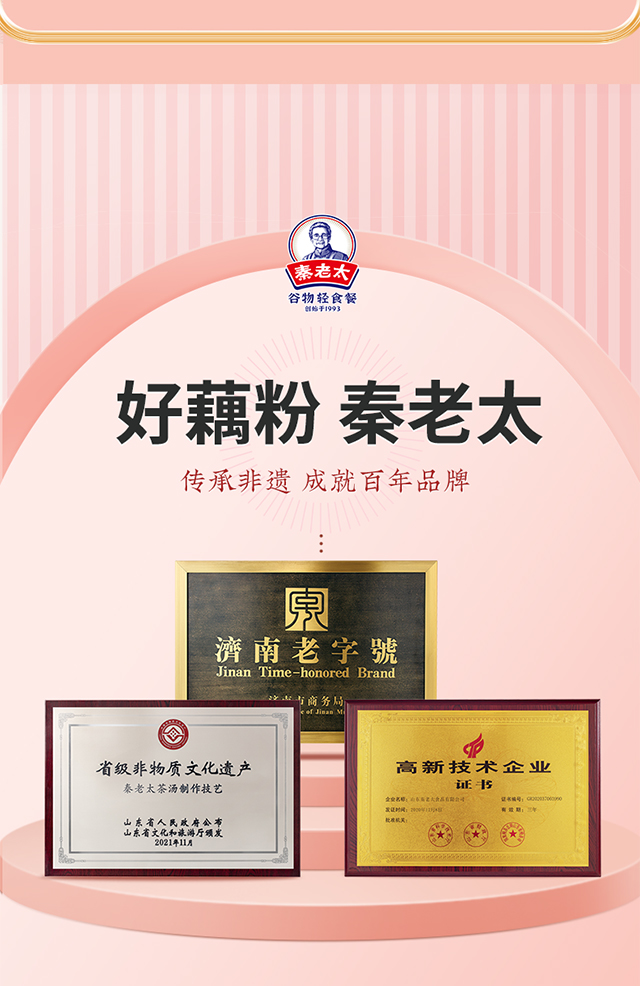 - 秦老太创始于1993年,专注谷物轻食餐。秦老太茶汤,2012年被正式授予非物质文化遗产。进入新时代,秦老太人怀揣匠心精神,以 “为家人制造食品”为理念,传承中华食养文化!