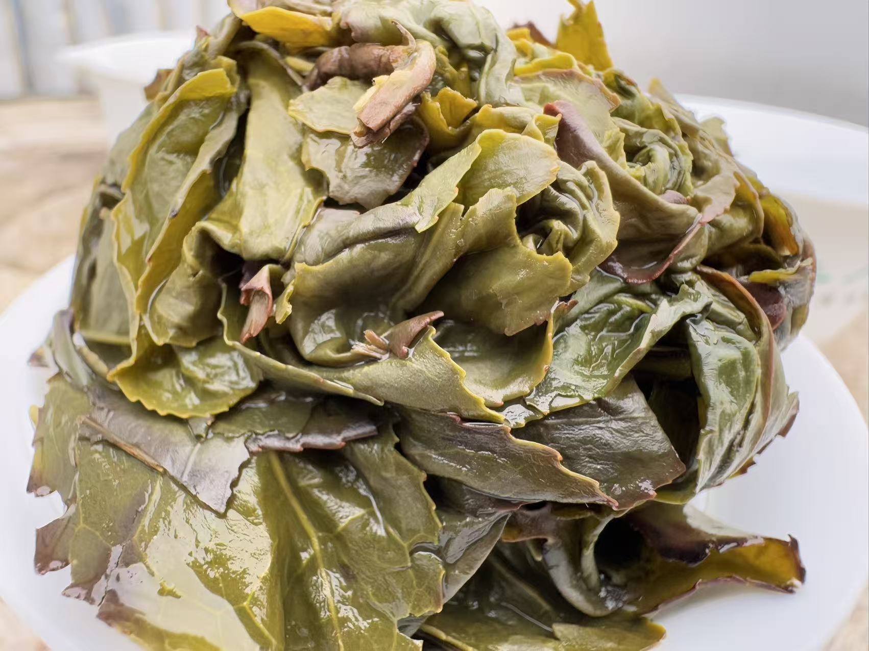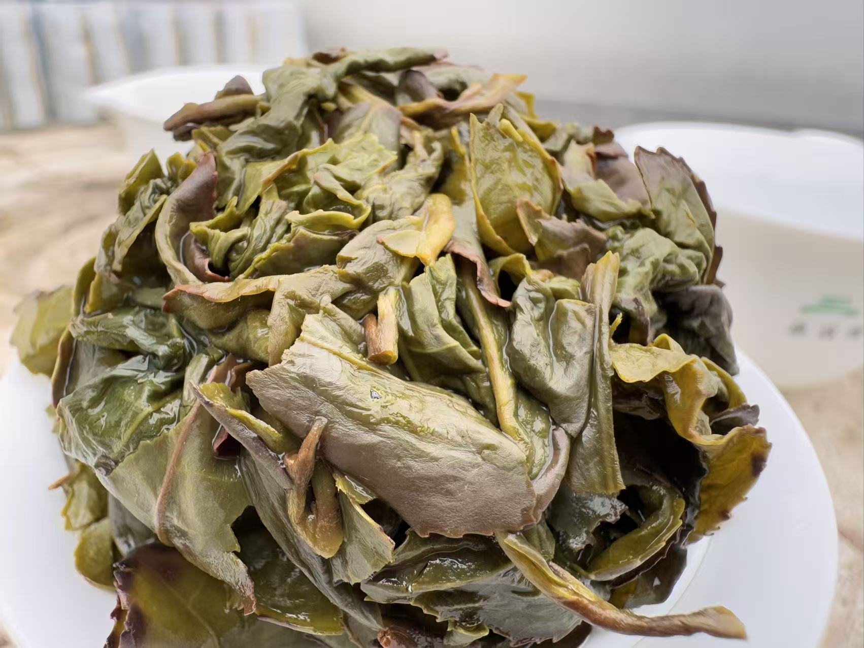 荒野茶清香型的叶底有一个缺点是:偶尔会有不均匀的叶片出现,感官会略微差一点,但是冲泡几次后,就会去向一致,