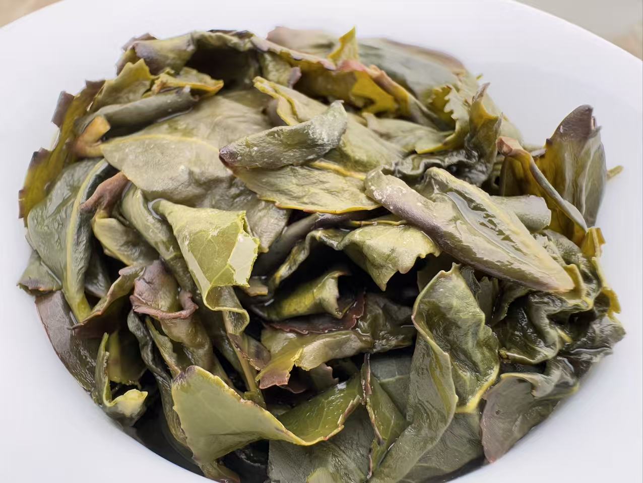 大家看,成色很活,红点明显,唯一的一个缺点是:因为是荒野老茶树,所以叶子相对不均匀,有个别比较大的叶子会出现,多少会影响叶底的感官;