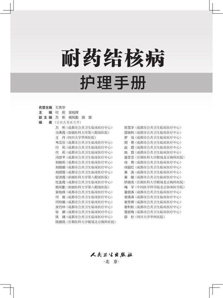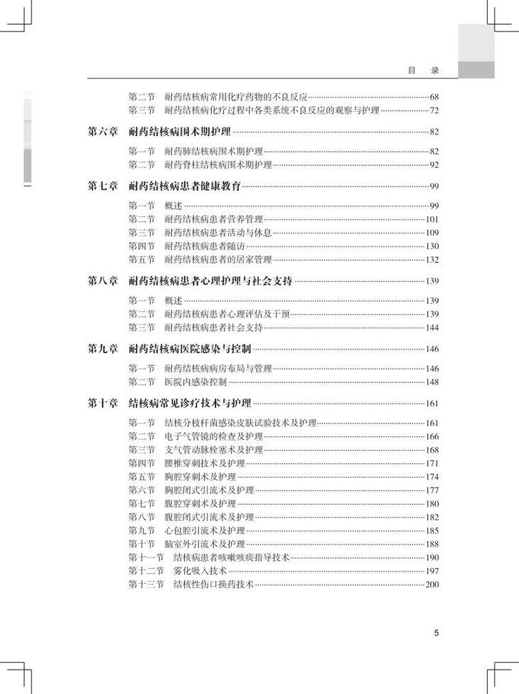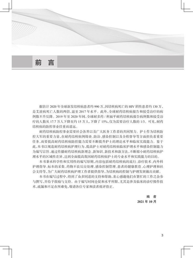 本书以科学性、实用性、指导性为原则,旨在紧密结合目前护理领域最新指南、耐药结核病最新诊疗护理研究进展,在广泛查阅国内外相关指南、文献的基础上,编写《耐药结核病护理手册》。同时,着重突出临床实用性,内容包括耐药结核病流行病学、耐药结核病诊断、耐药结核病治疗、耐药结核病患者常见症状及护理、耐药结核病化疗药物不良反应及处理、耐药结核病患者健康教育、耐药结核病患者心理护理与社会支持、耐药结核病感染与控制策略、结核病专科操作技术与护理。