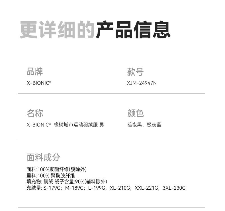 X-BIONIC 橡树城市运动羽绒服 秋冬防风防水轻量保暖短款羽绒衣 XJM-24947N