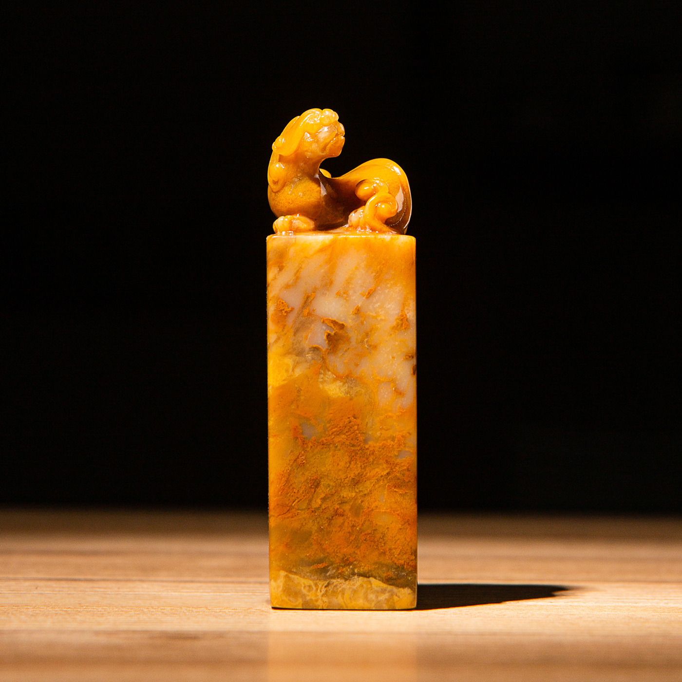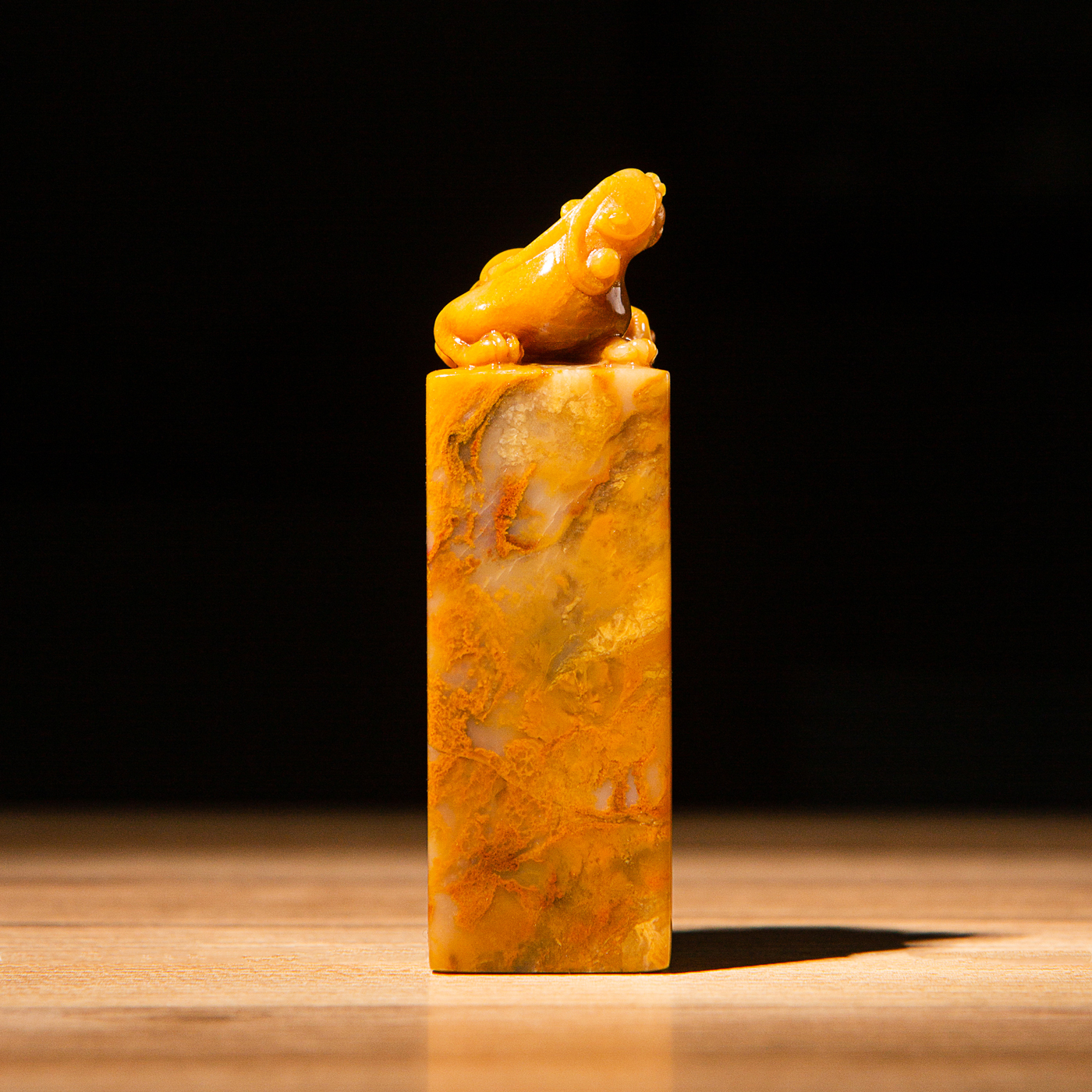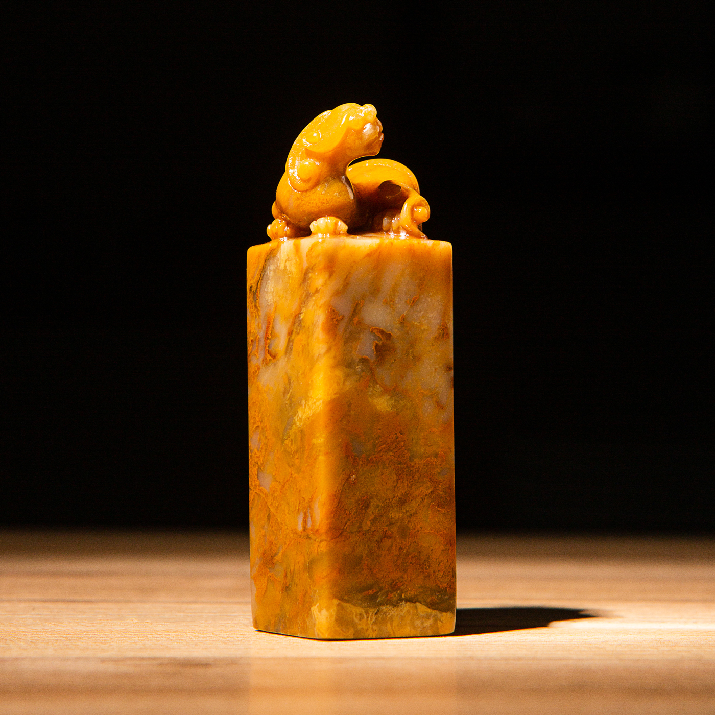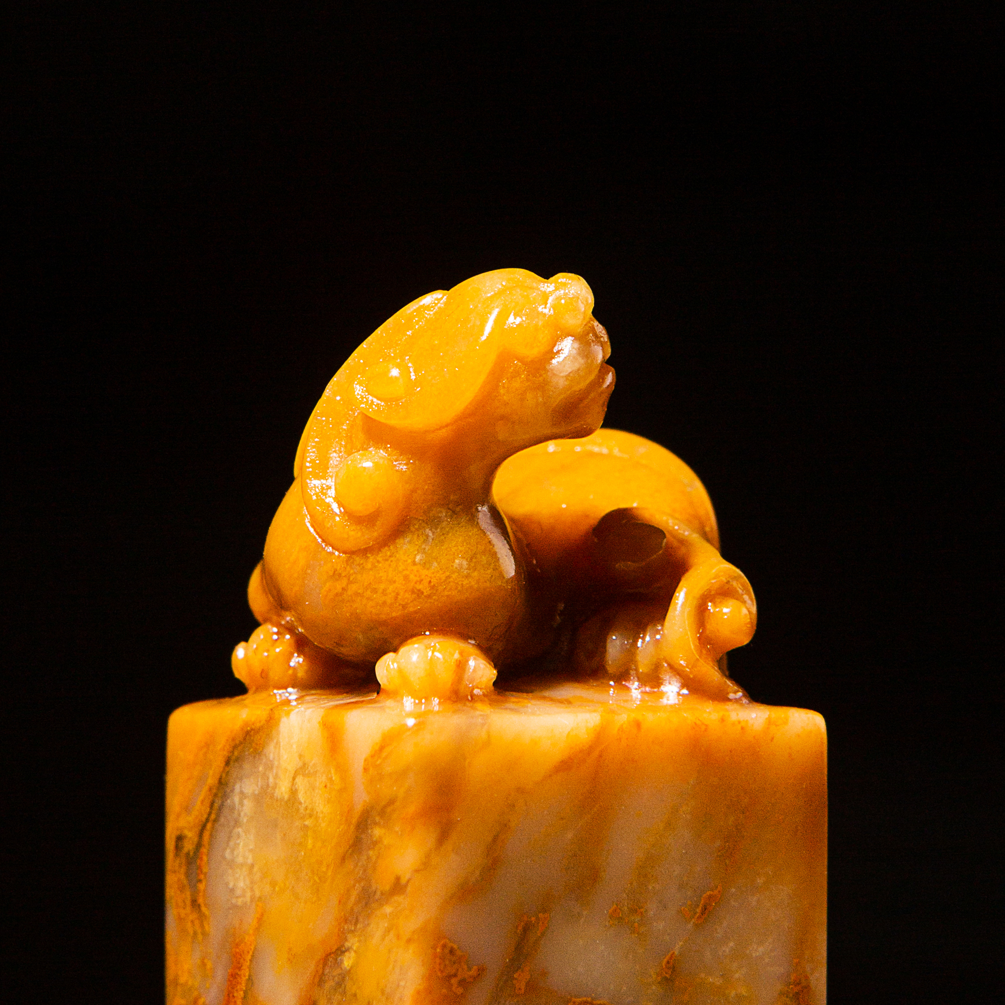 巴林黄冻老料雕“螭虎”方章,采用存放几十年的老料,纯手工精雕而成。其雕工精美,质地温润通透,石性稳定。