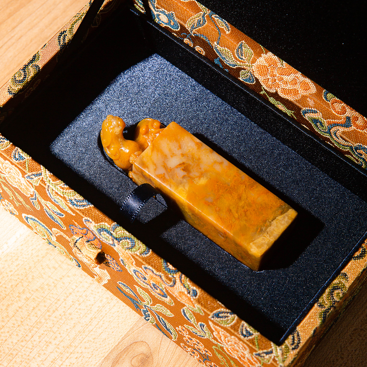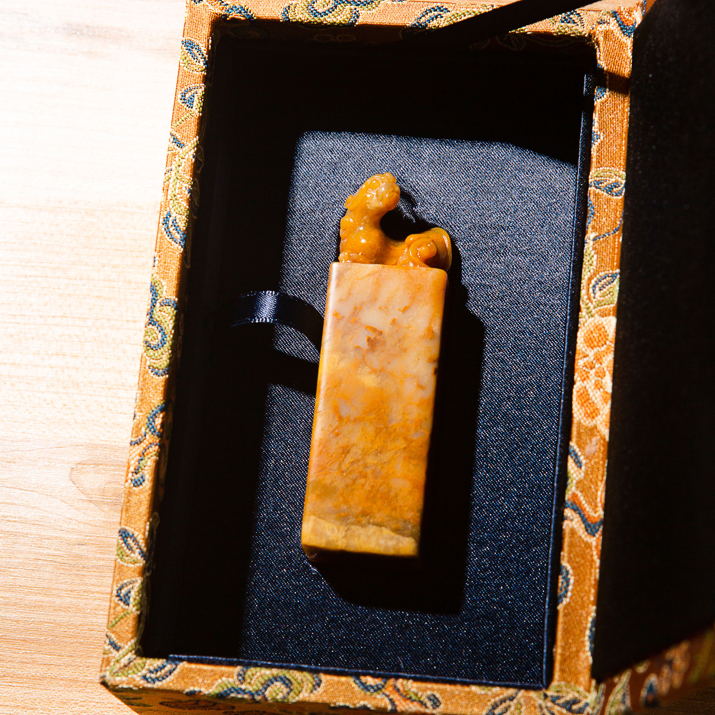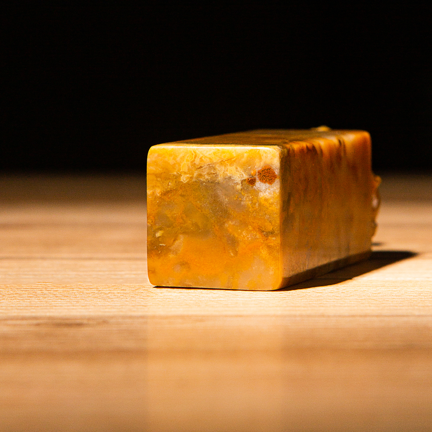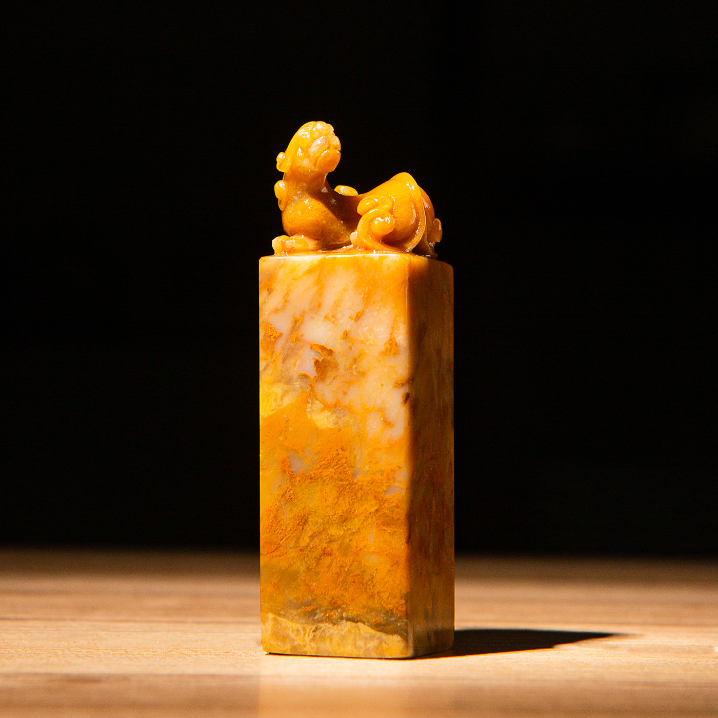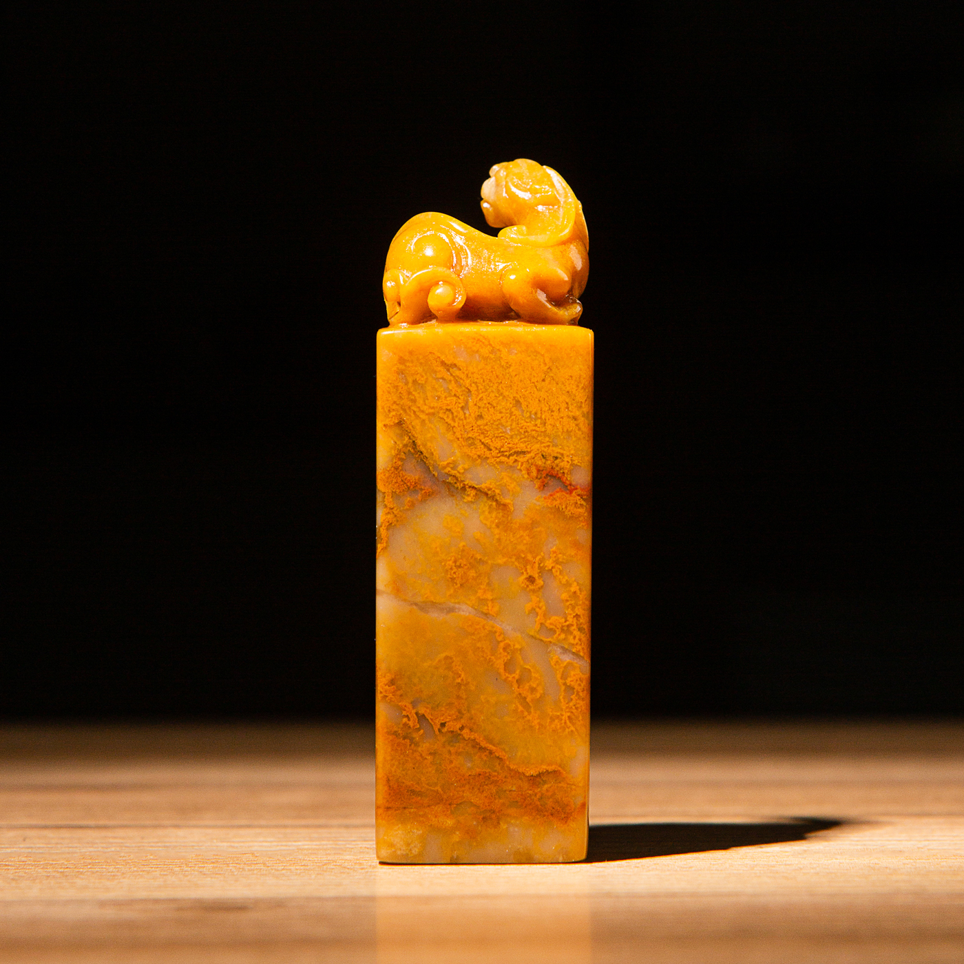 巴林黄冻老料雕“螭虎”方章,采用存放几十年的老料,纯手工精雕而成。其雕工精美,质地温润通透,石性稳定。
