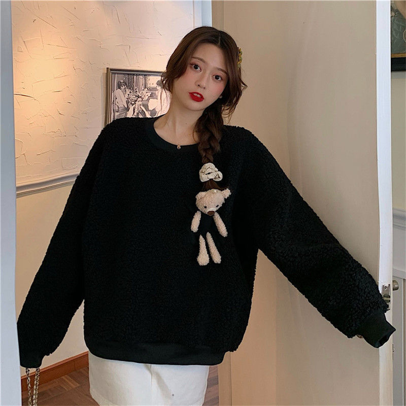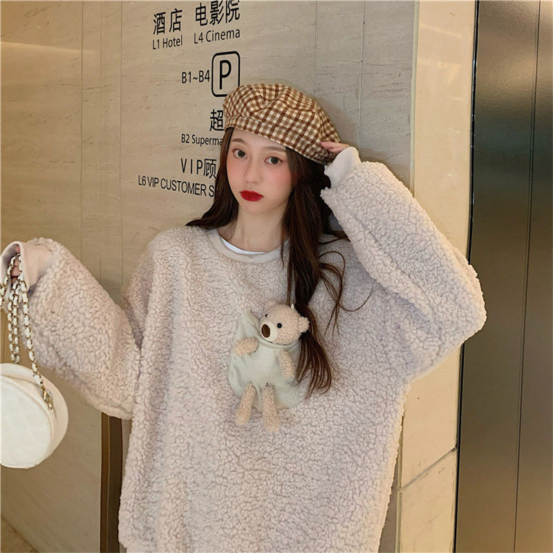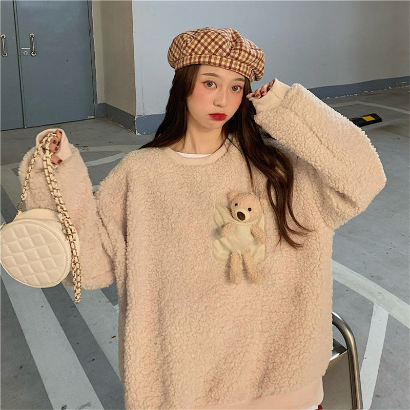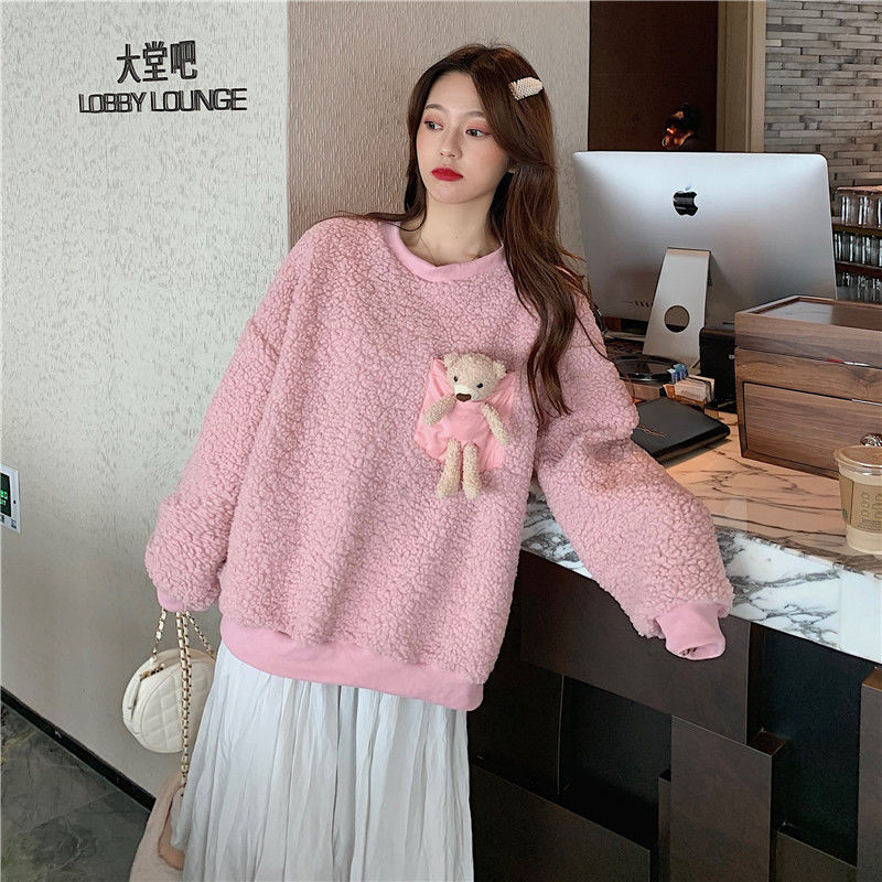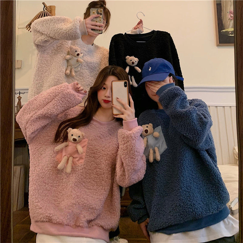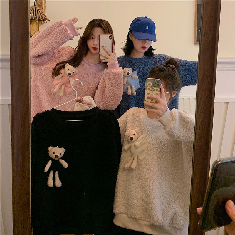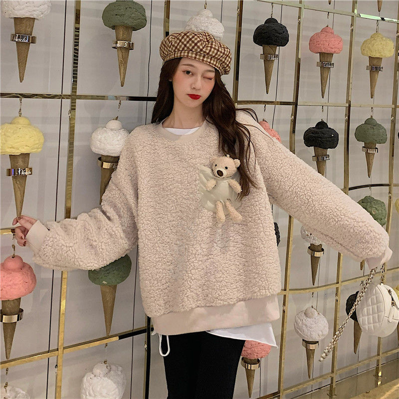 2020新款秋冬小熊仿羊羔毛可爱套头宽松加绒加厚女学生外套上衣