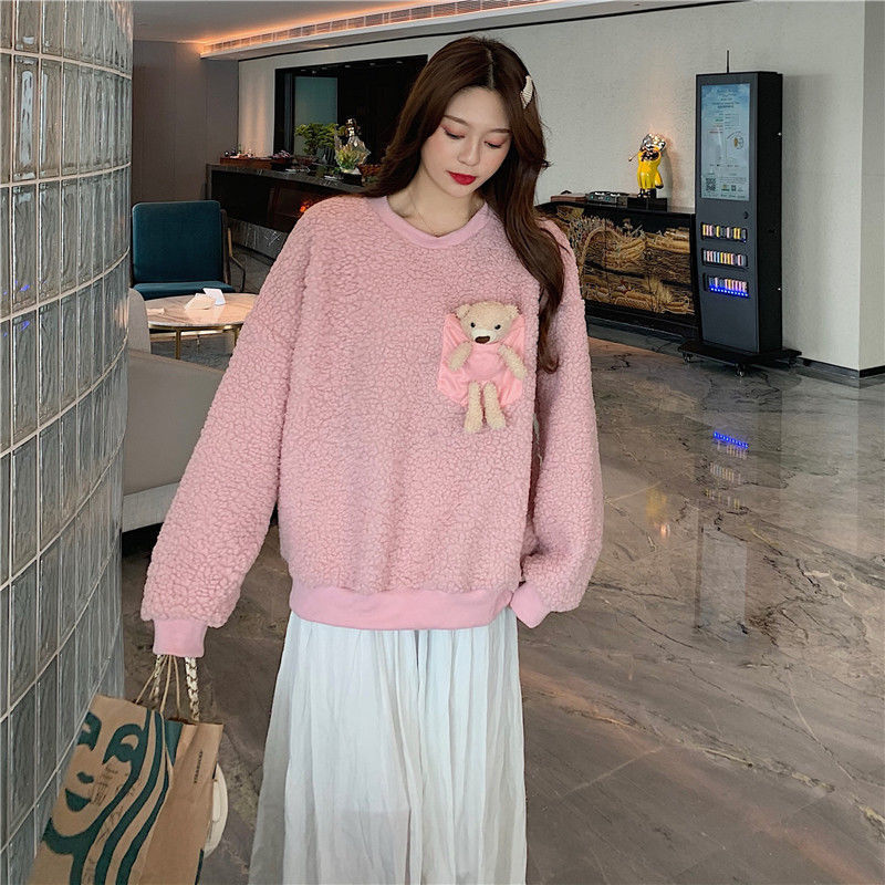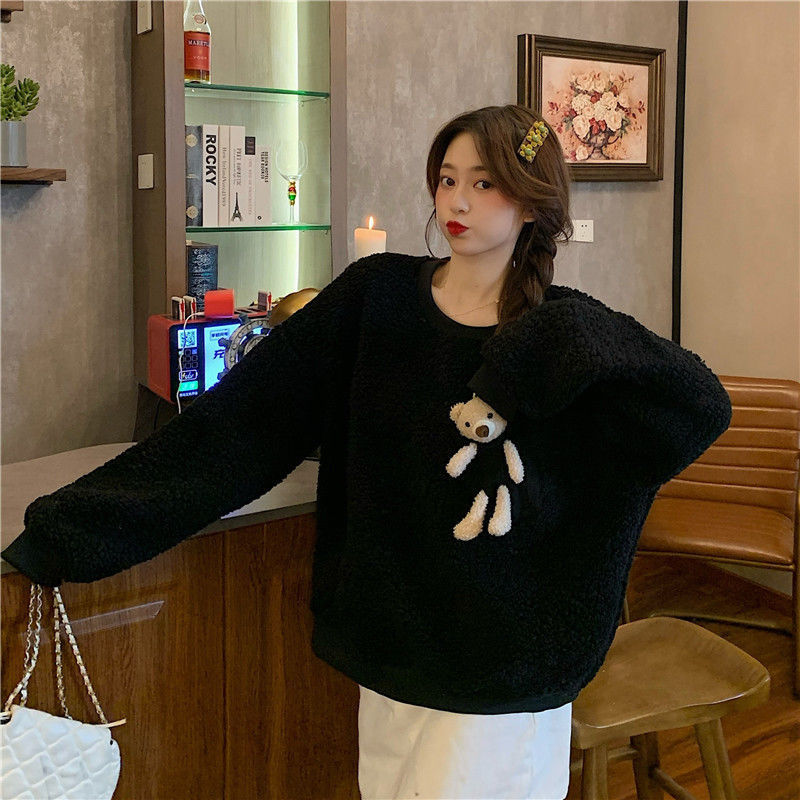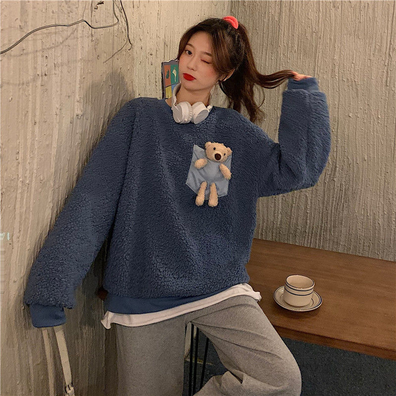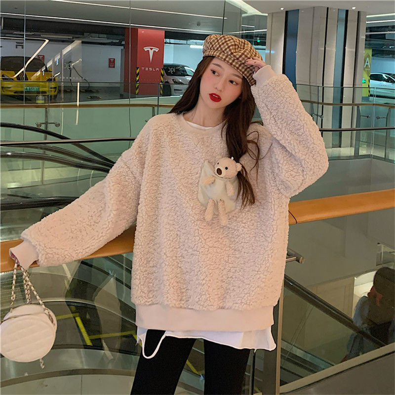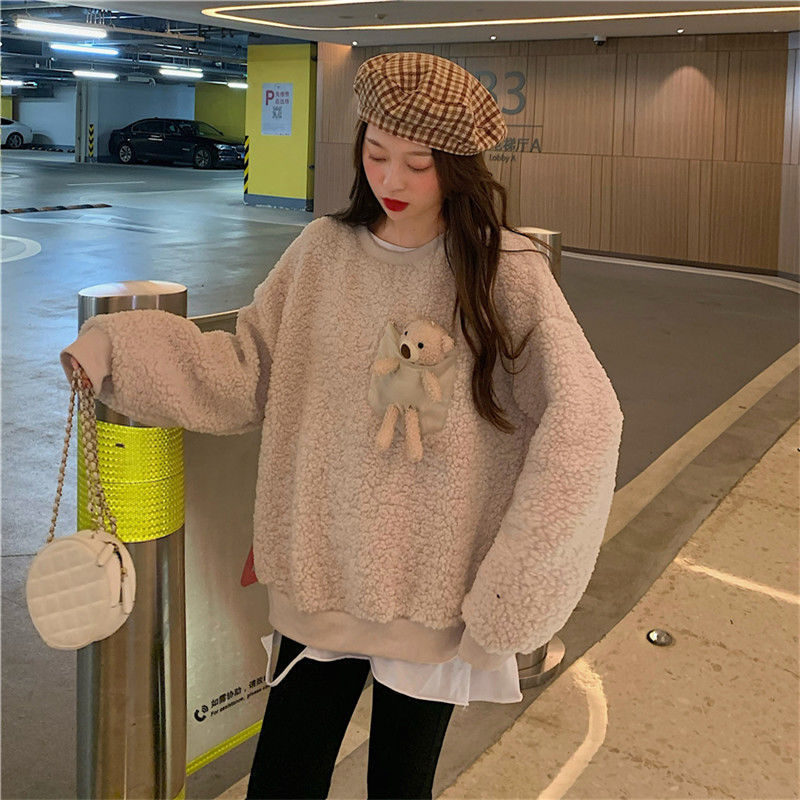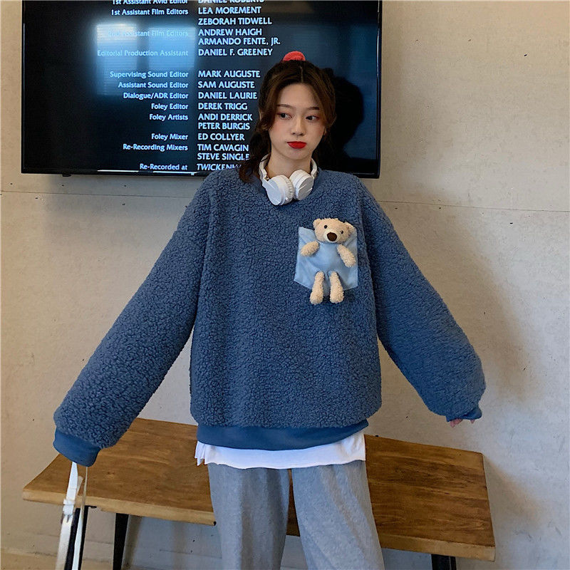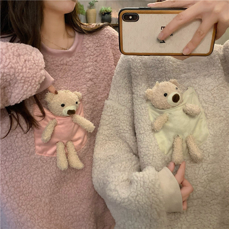 2020新款秋冬小熊仿羊羔毛可爱套头宽松加绒加厚女学生外套上衣