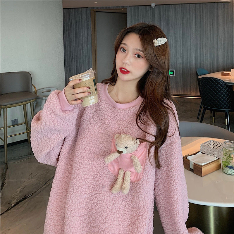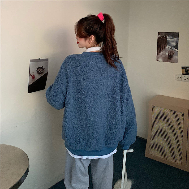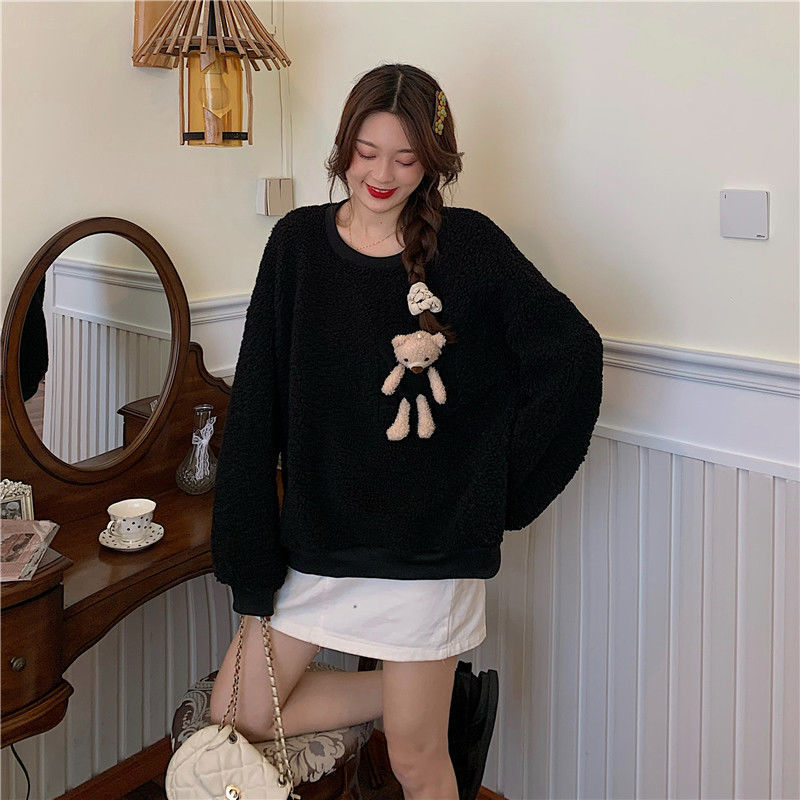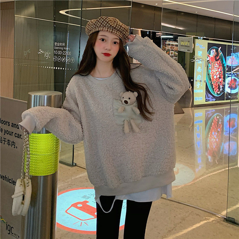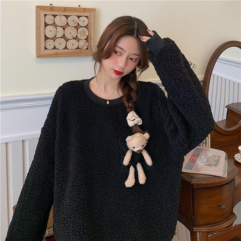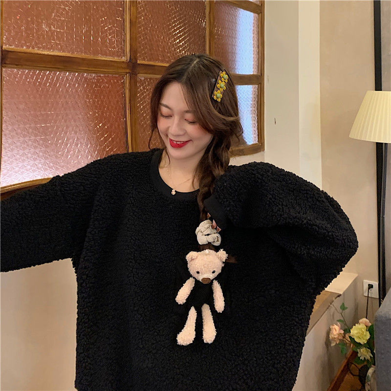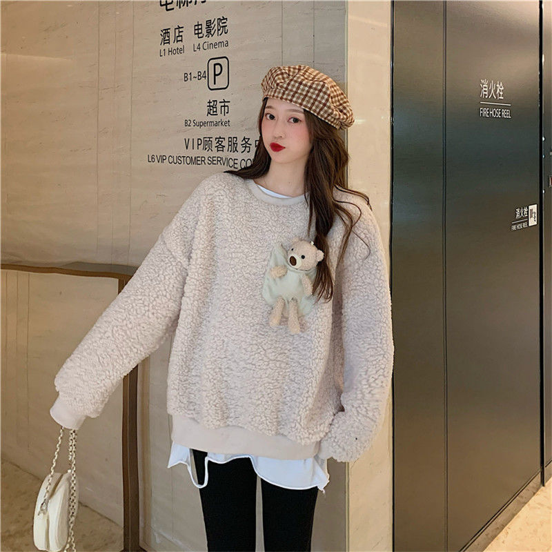 2020新款秋冬小熊仿羊羔毛可爱套头宽松加绒加厚女学生外套上衣