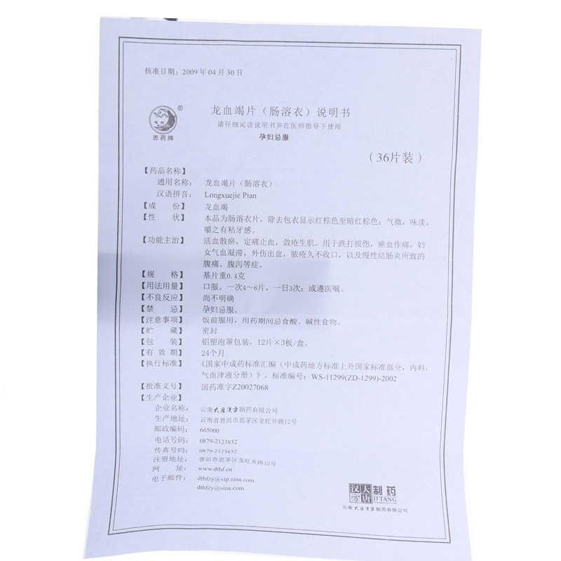 思药 龙血竭片(肠溶衣)0.4g*36片/盒 跌打损伤 淤血作痛 妇女气血凝滞 外伤出血 脓疮久不收口 慢性结肠炎所致的腹痛 腹泻