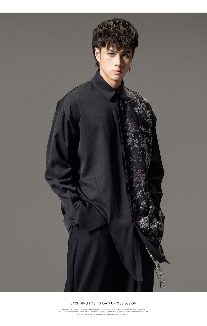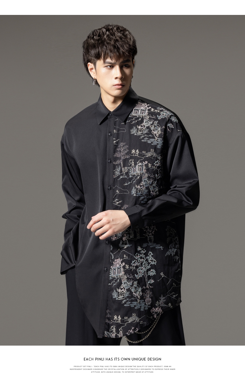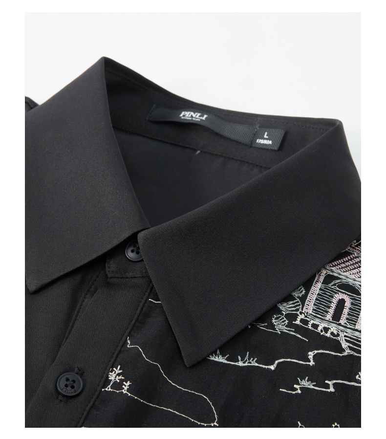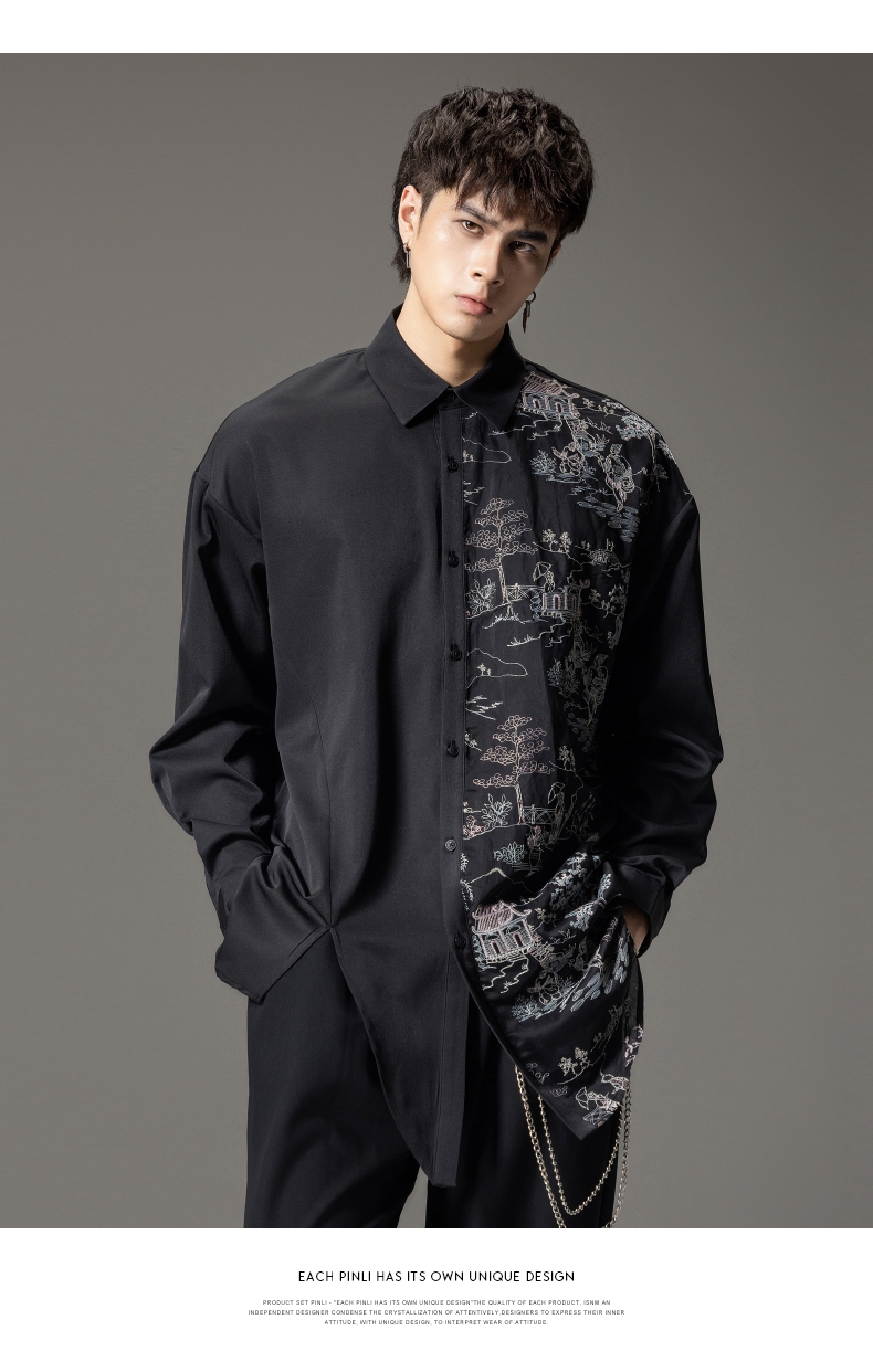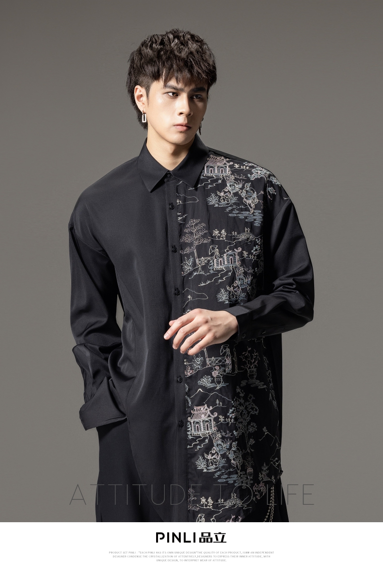 PINLI品立秋季新款尖领山水刺绣宽松休闲长袖衬衫上衣男潮牌B243113008