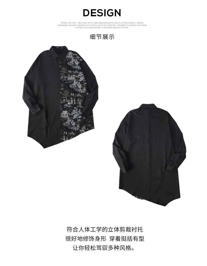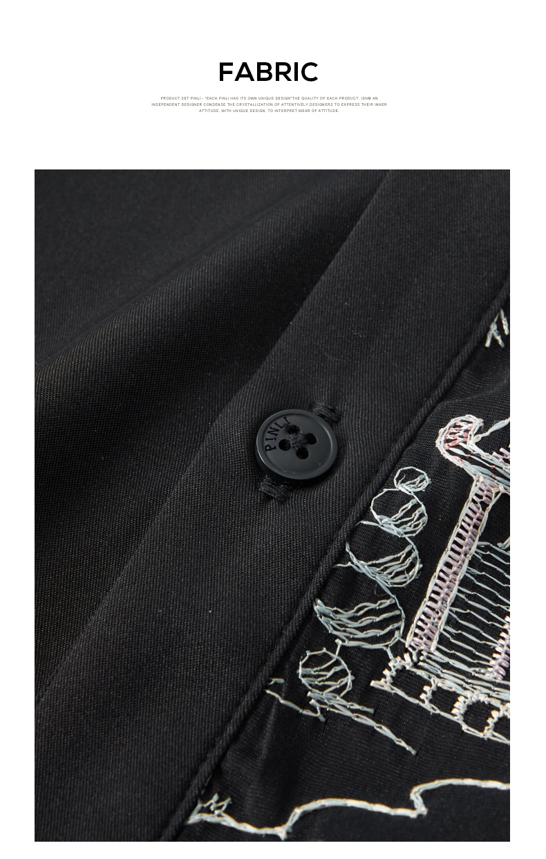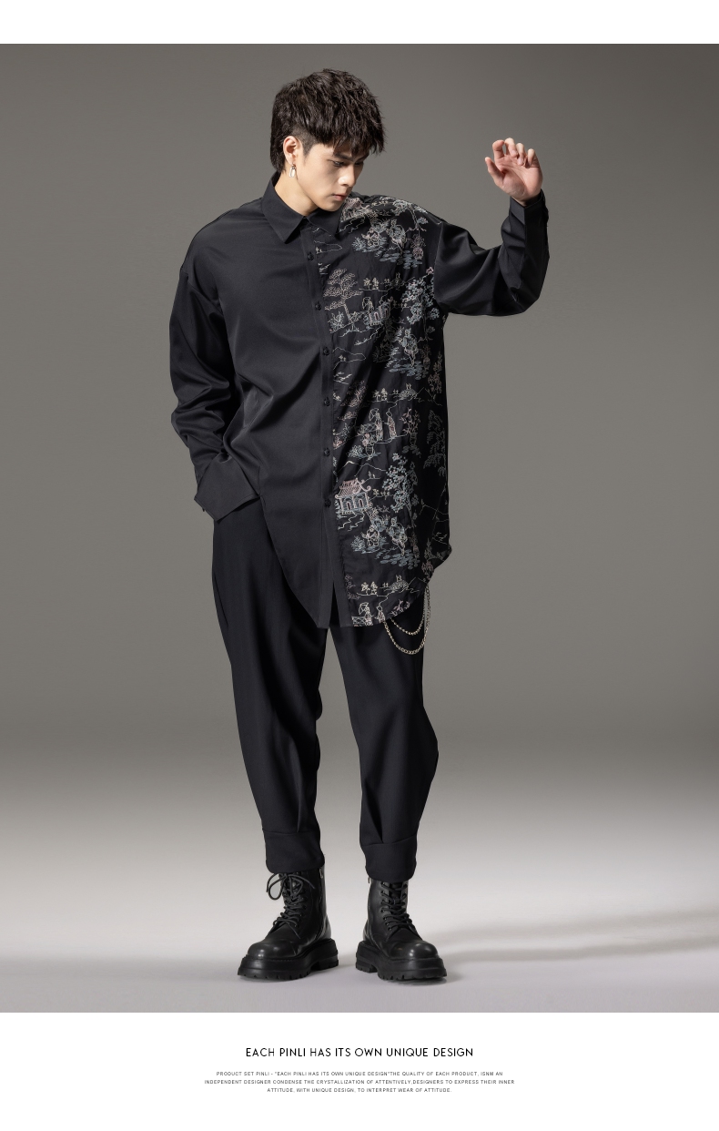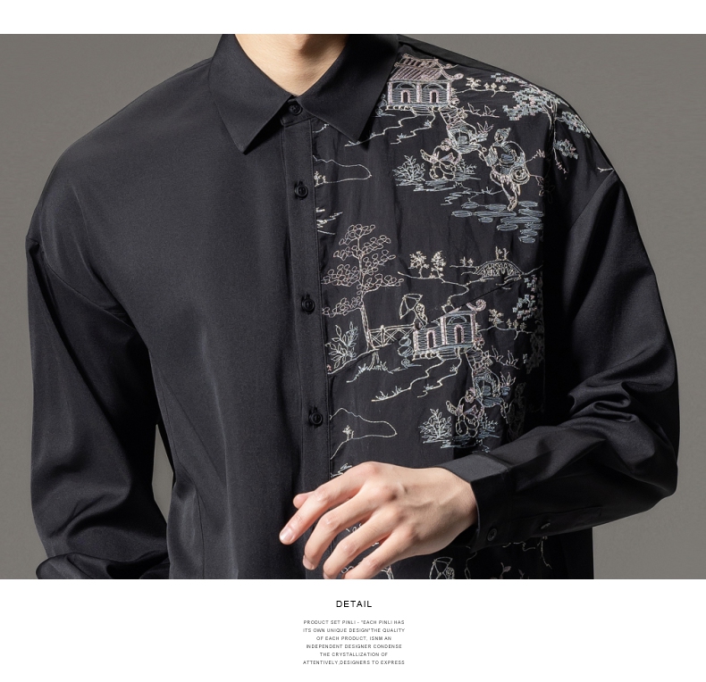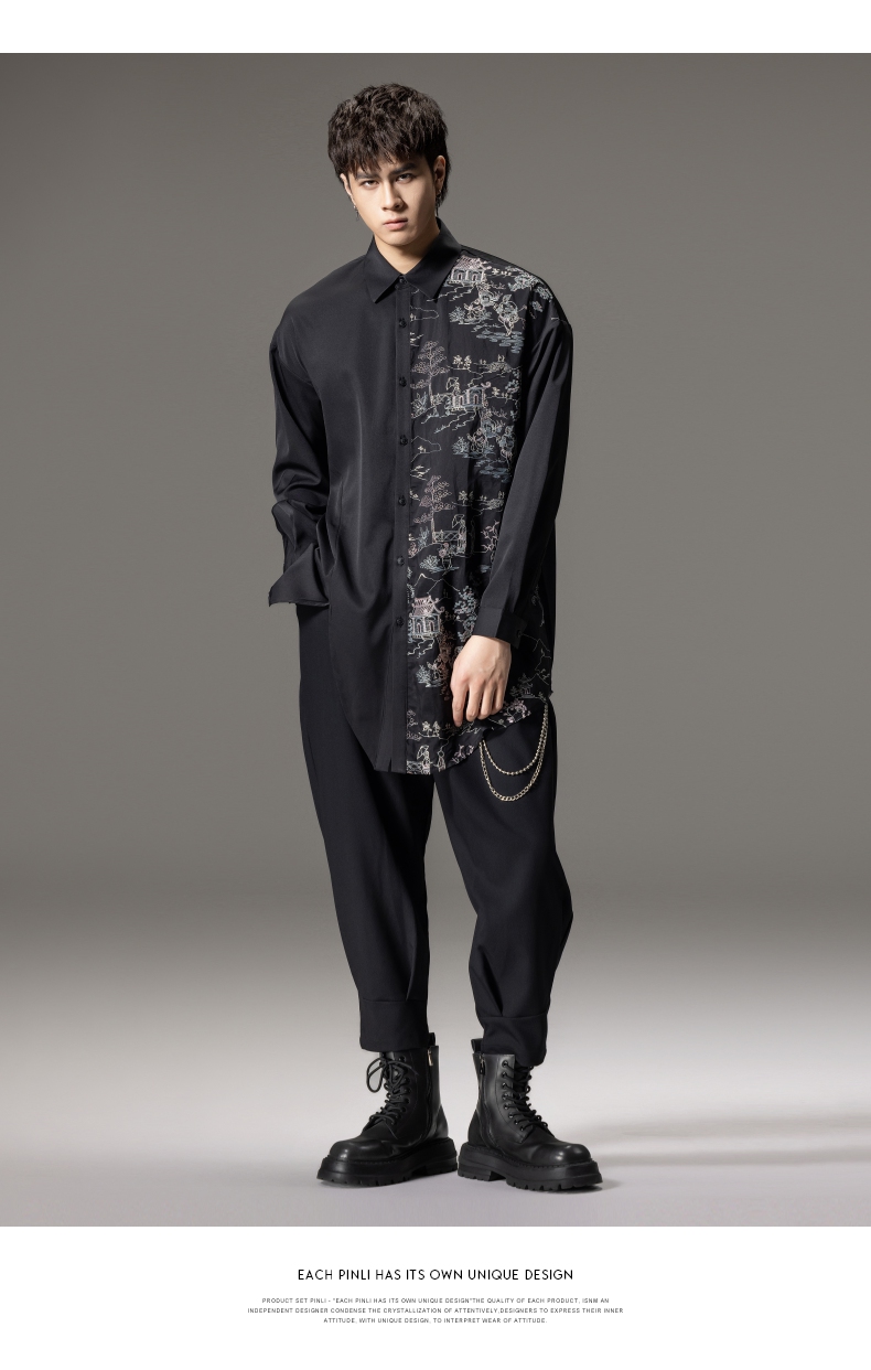 PINLI品立秋季新款尖领山水刺绣宽松休闲长袖衬衫上衣男潮牌B243113008