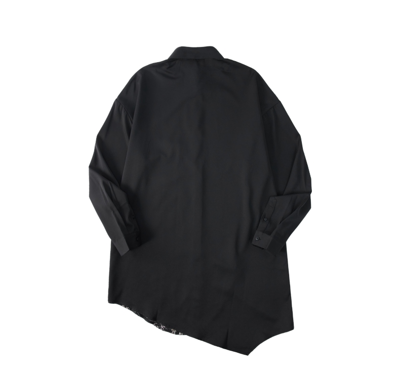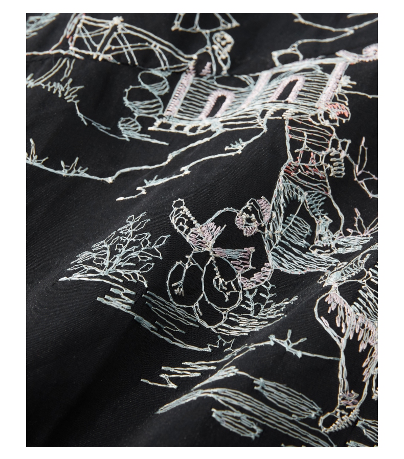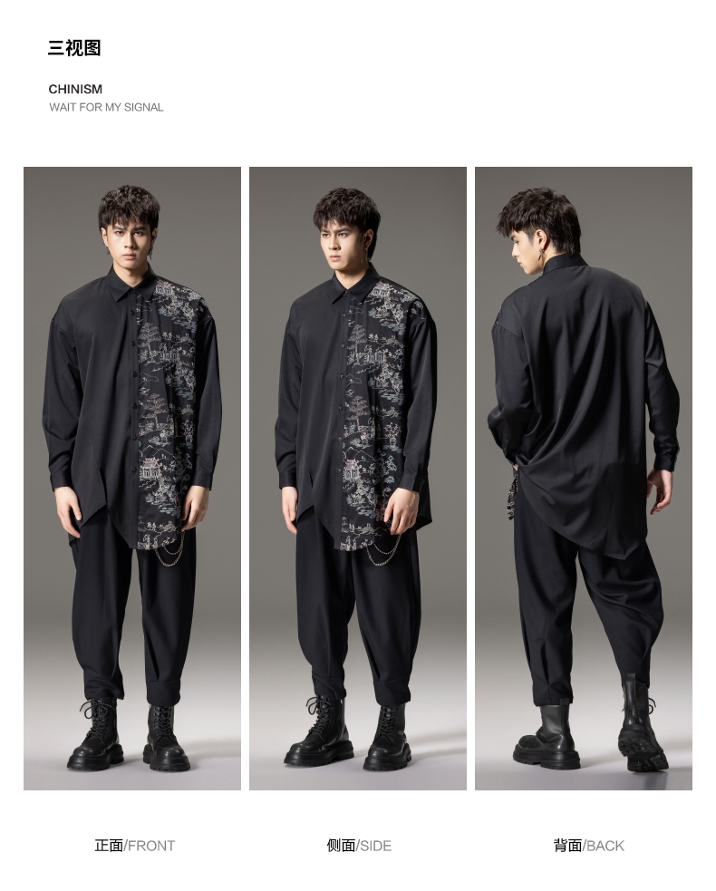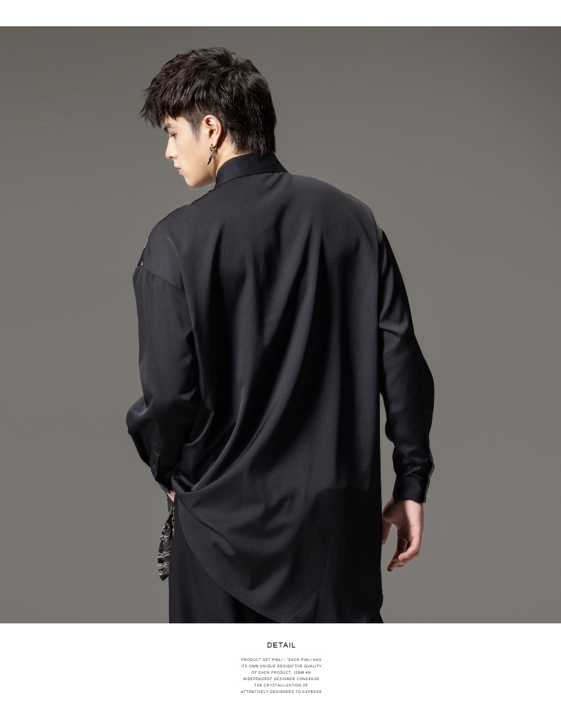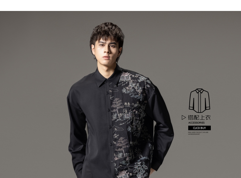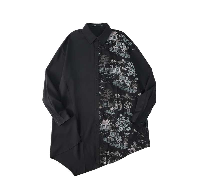 PINLI品立秋季新款尖领山水刺绣宽松休闲长袖衬衫上衣男潮牌B243113008