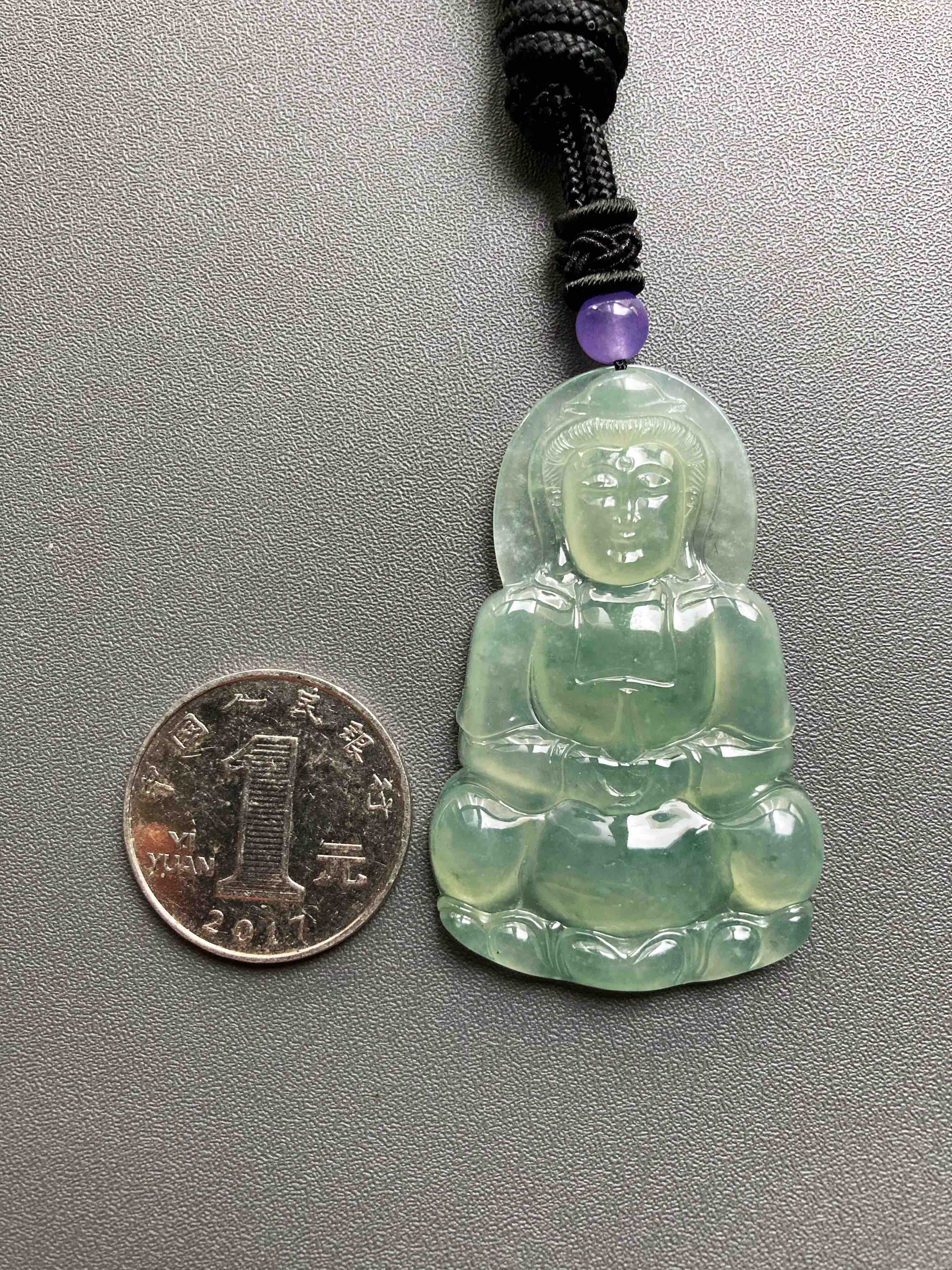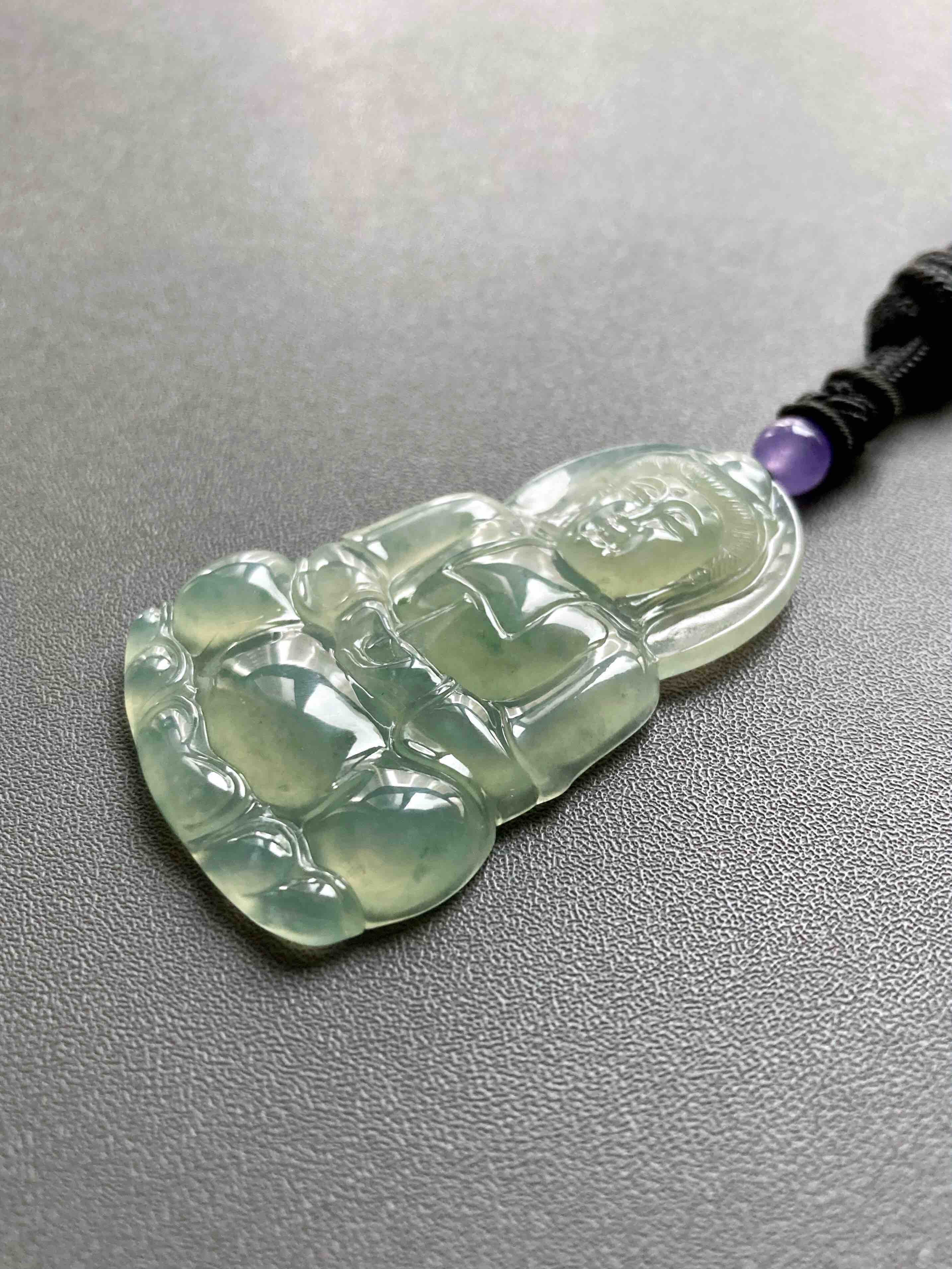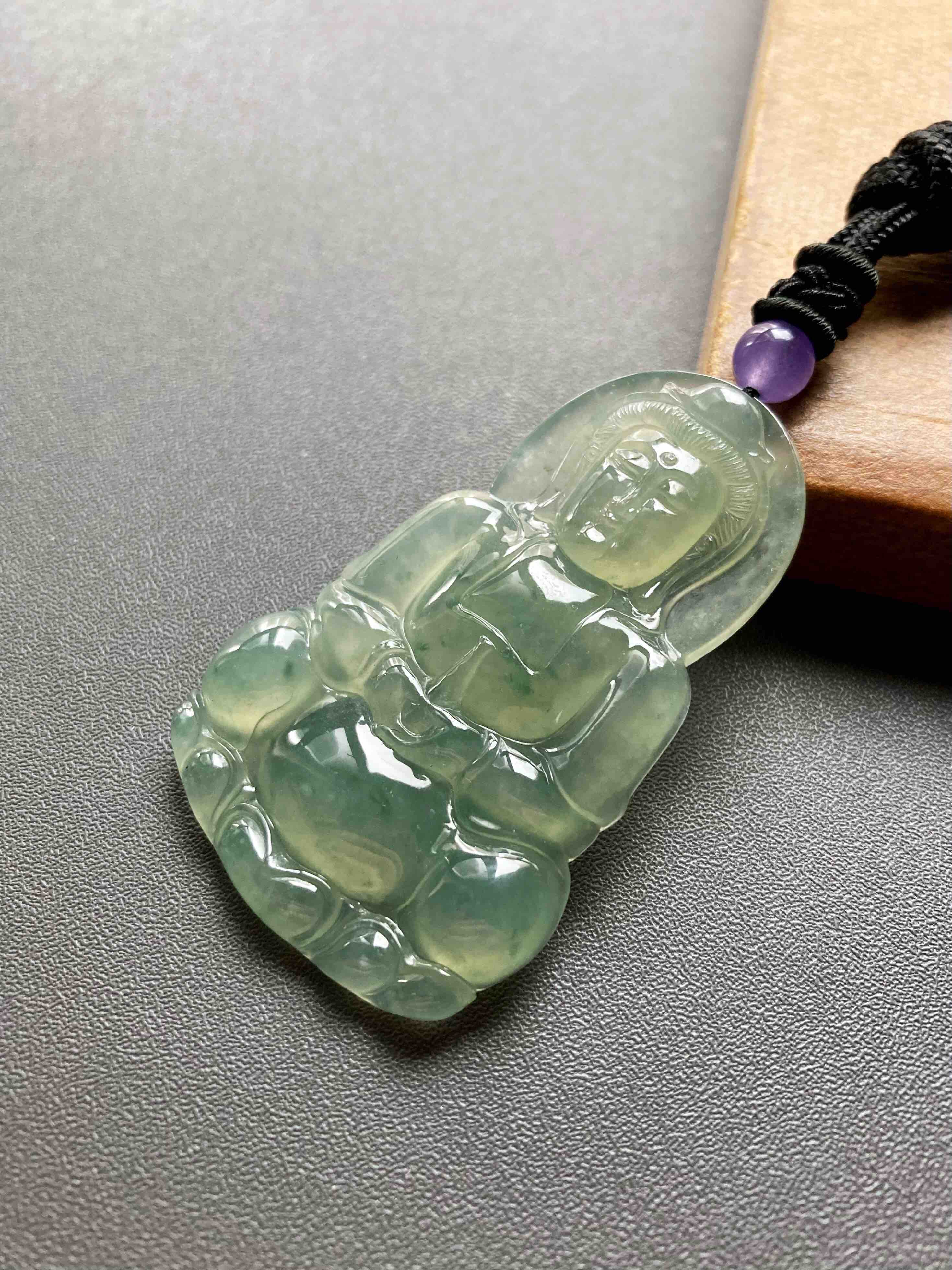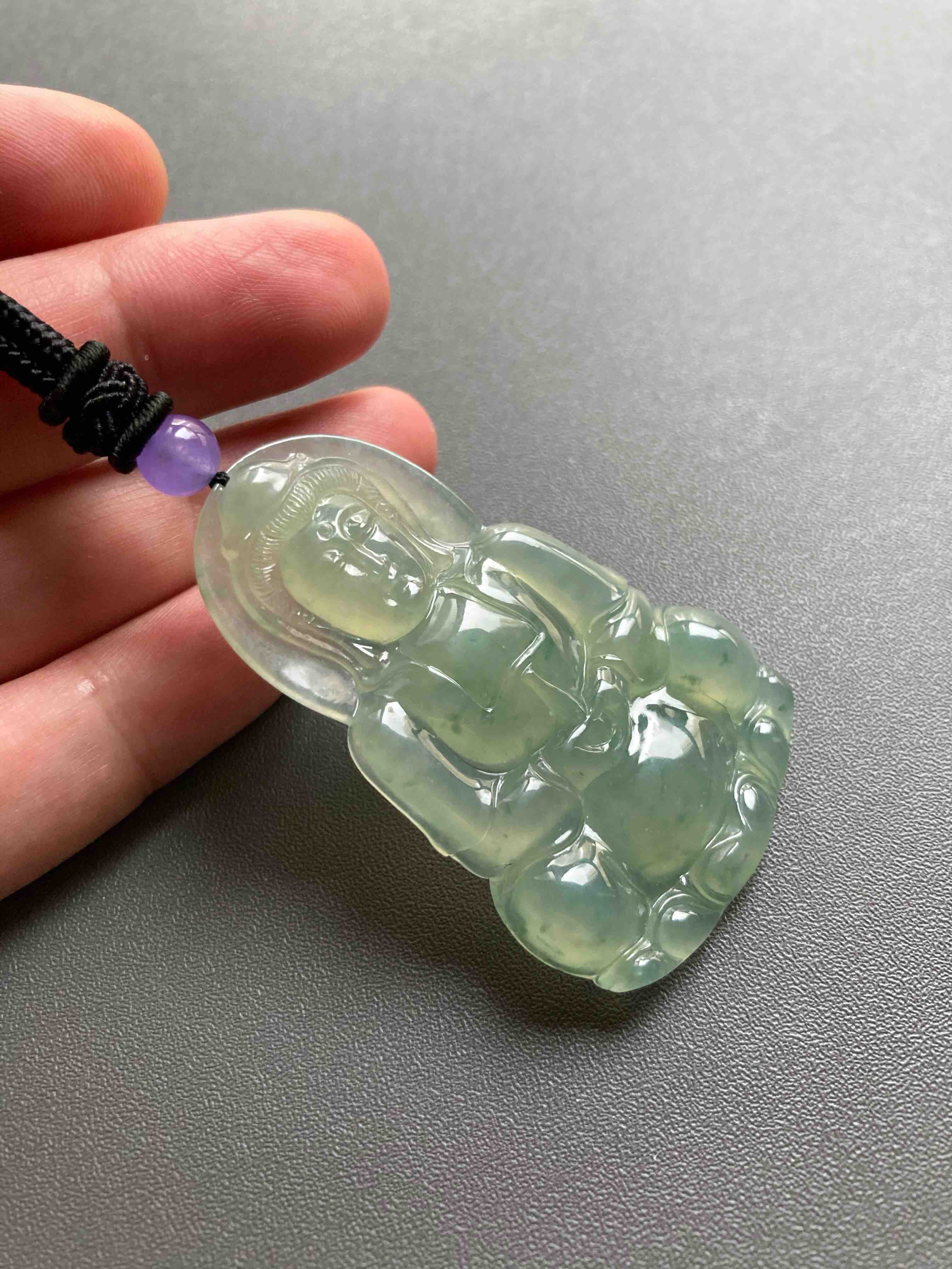 冰种晴水绿飘花翡翠大观音,晴水绿观音里的标本级,尺寸大气,种水晶莹剔透,晴水绿漂亮,飘花灵动,纯手工精雕细琢,送男士保平安的佳品,尺寸52.7×33.2×6mm