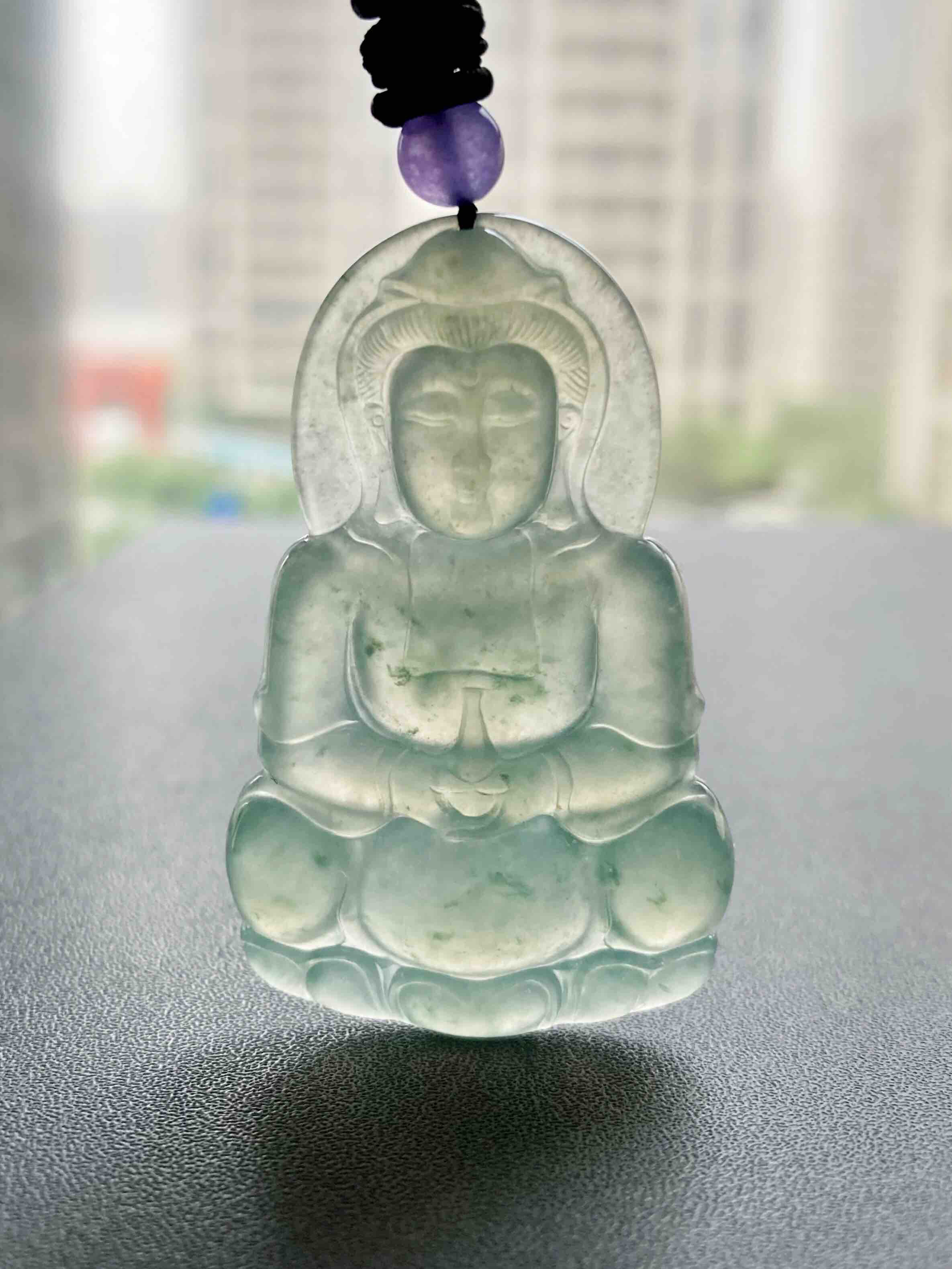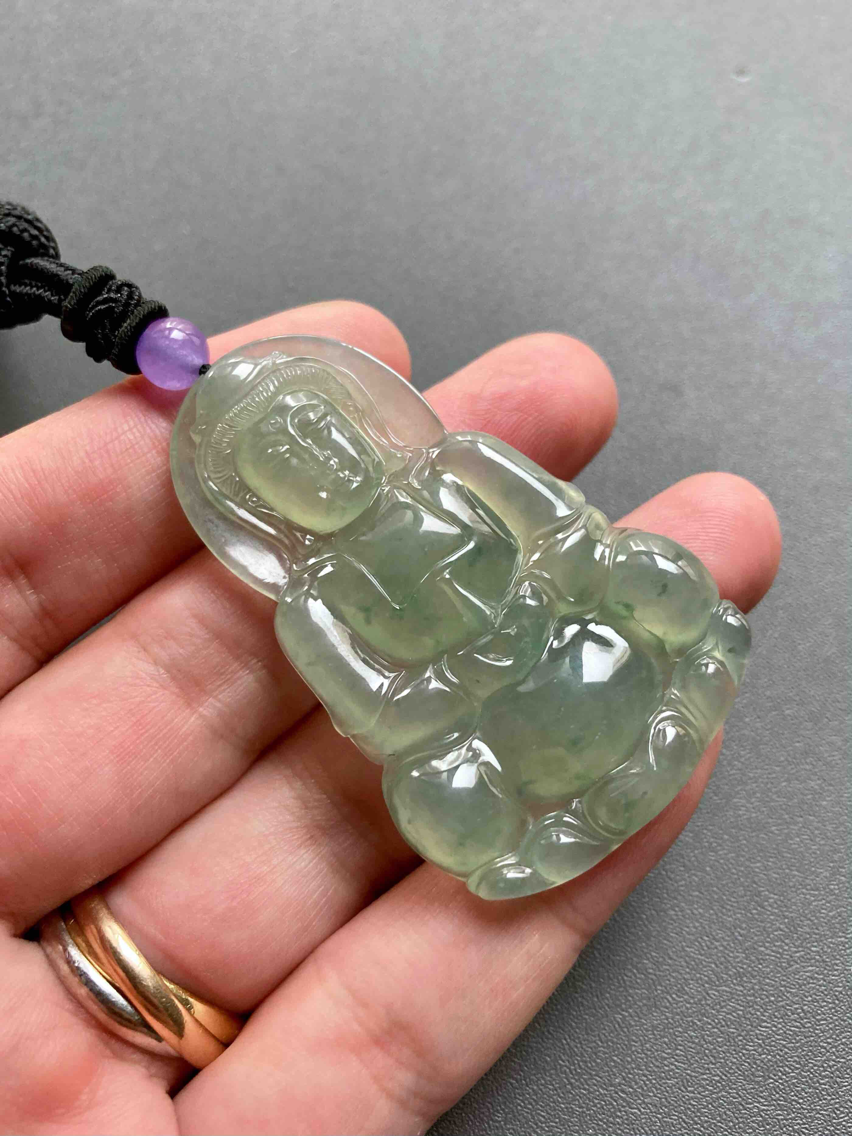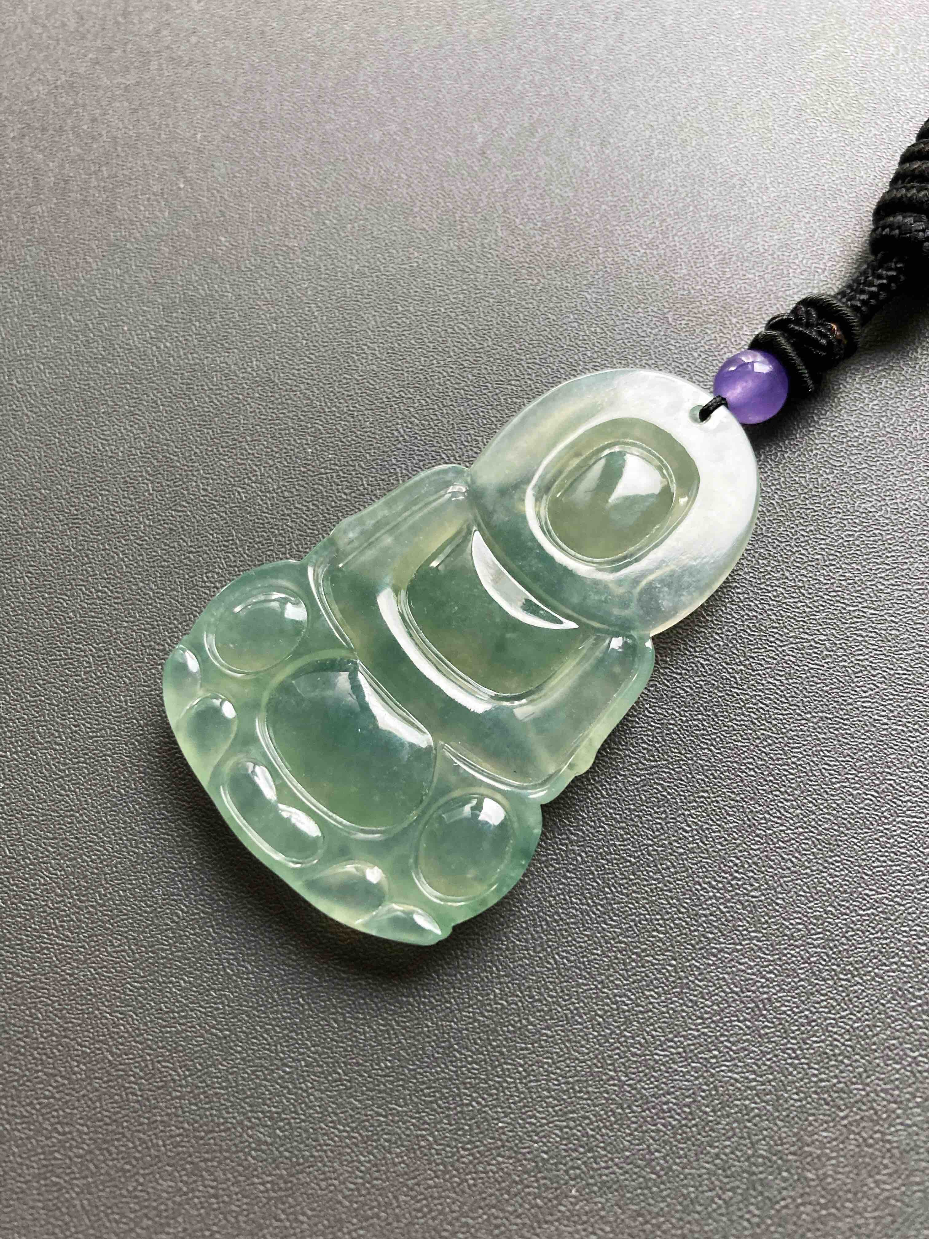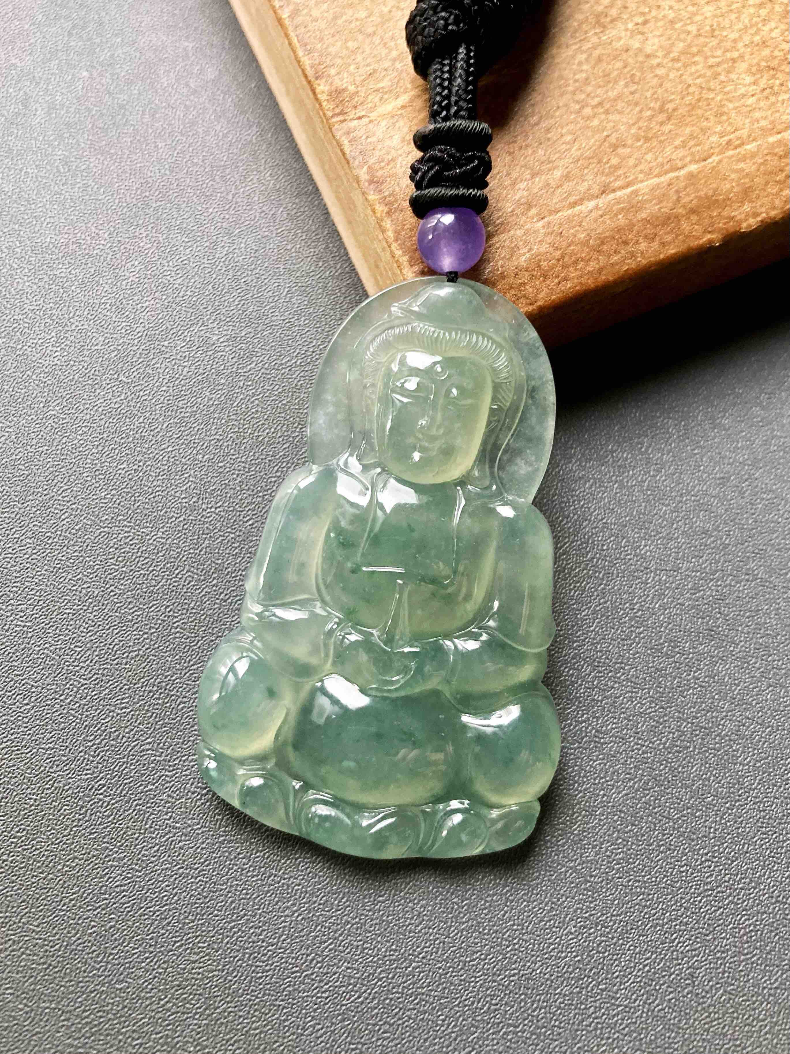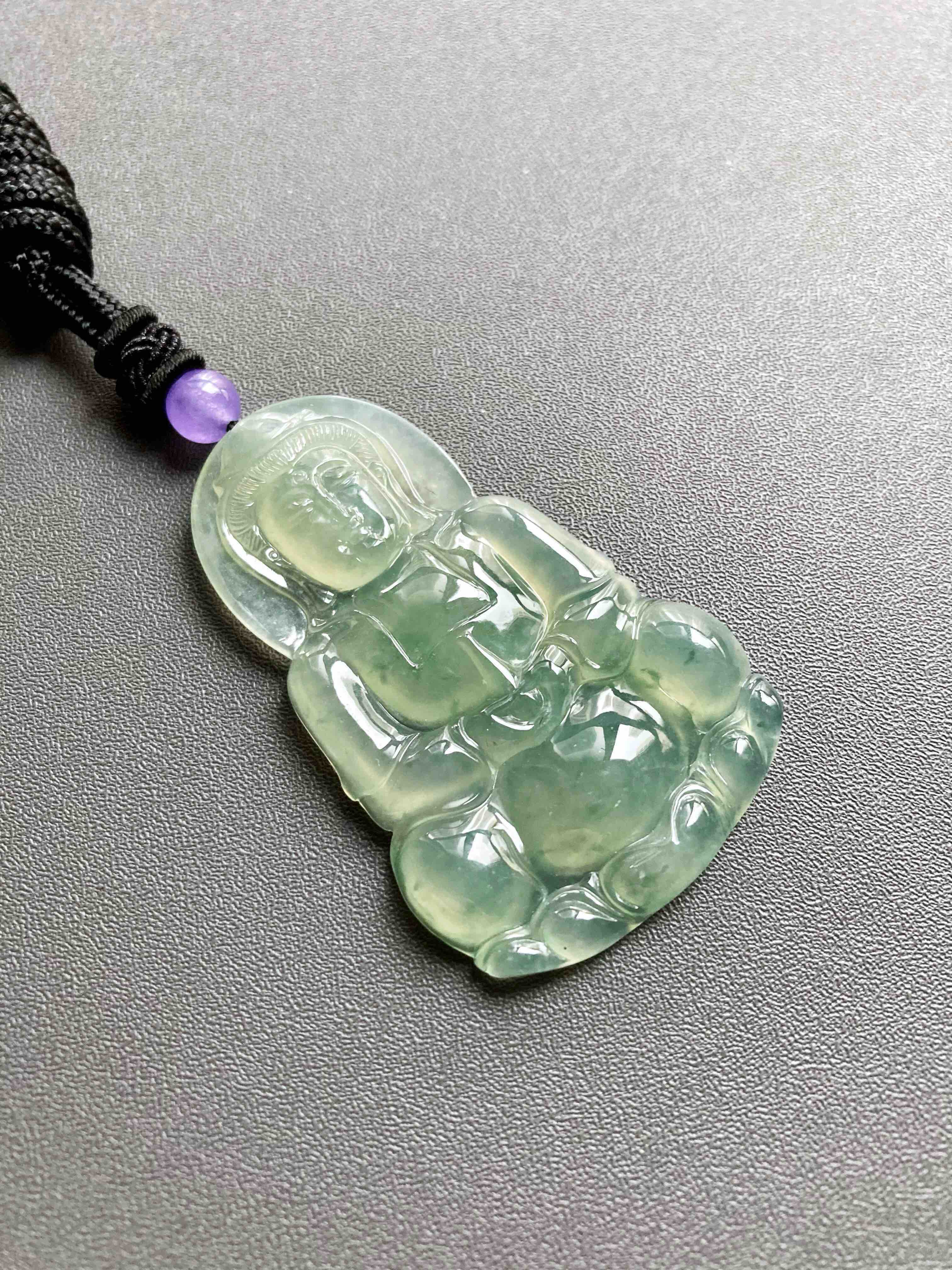冰种晴水绿飘花翡翠大观音,晴水绿观音里的标本级,尺寸大气,种水晶莹剔透,晴水绿漂亮,飘花灵动,纯手工精雕细琢,送男士保平安的佳品,尺寸52.7×33.2×6mm